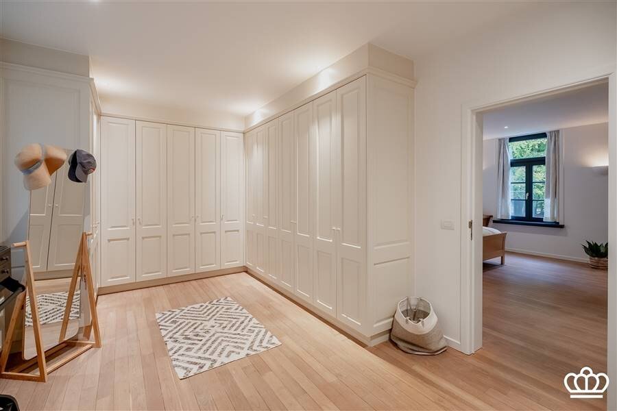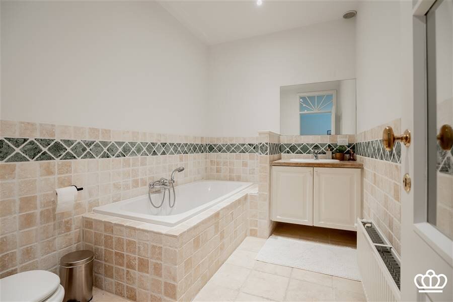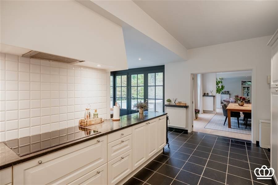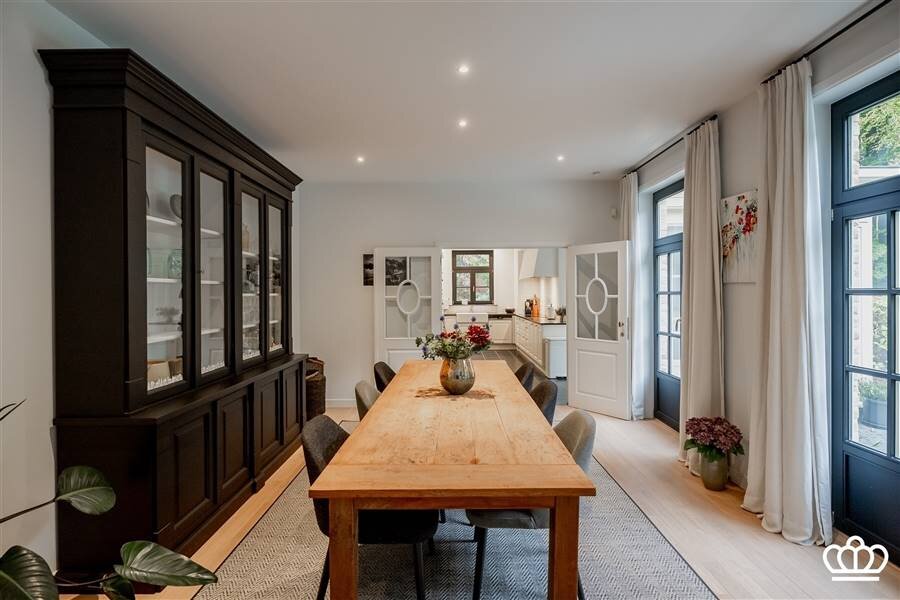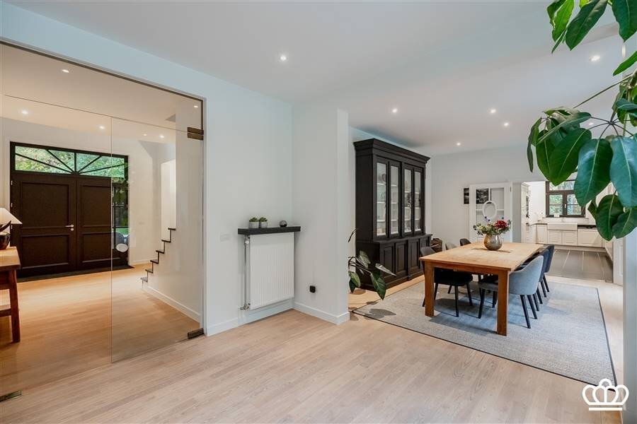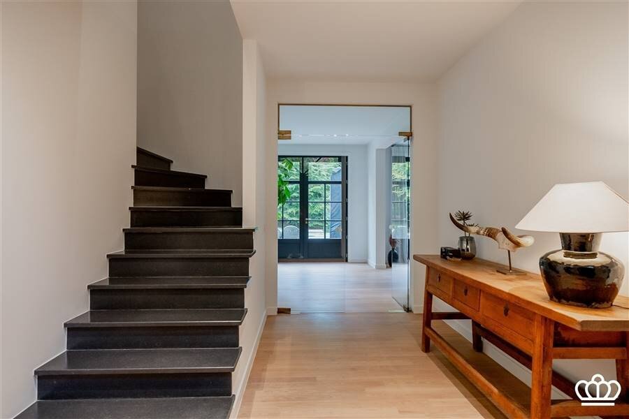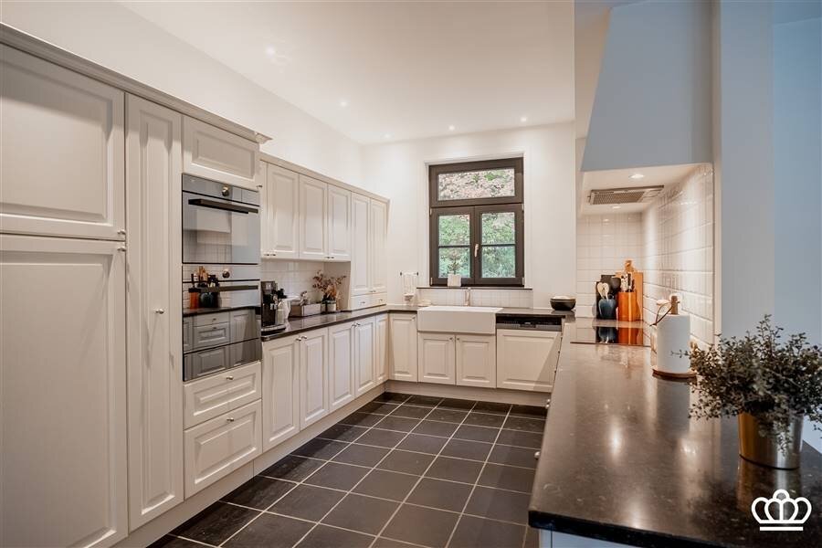 De leefkeuken is volledig ingericht met maatkasten en voorzien van recent vernieuwde inbouwtoestellen, waaronder twee combi stoomovens en een vacuümlade van V-ZUG. Een gezellige eethoek biedt uitzicht op de achtertuin en geeft direct toegang tot het terras. Aansluitend vind je een achterinkom met een apart toilet en een doorgang naar de inpandige dubbele garage met automatische poort en technische ruimte. De gelijkvloerse verdieping is afgewerkt met parket en zwarte natuursteen in de keuken.