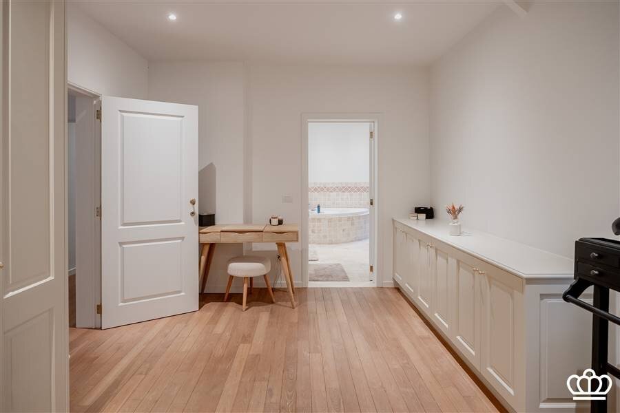 De master unit omvat een ruime slaapkamer met zicht op de tuin, een aparte dressing met ingemaakte kasten en een badkamer met ligbad, douche, dubbele lavabo en toilet.