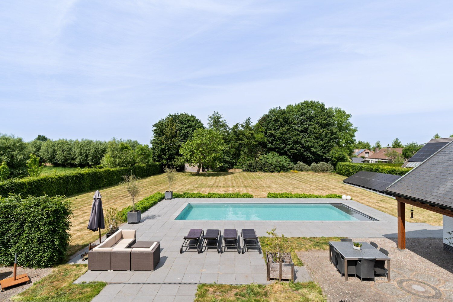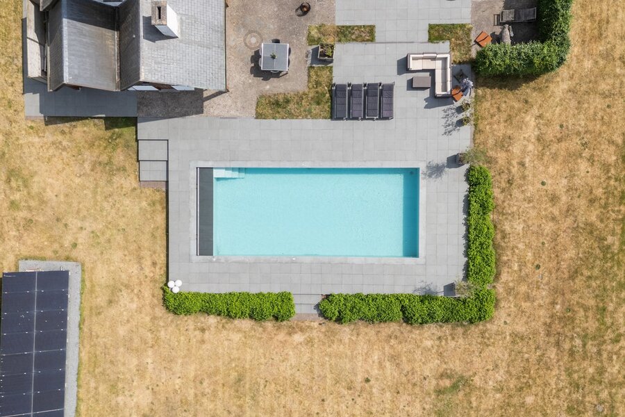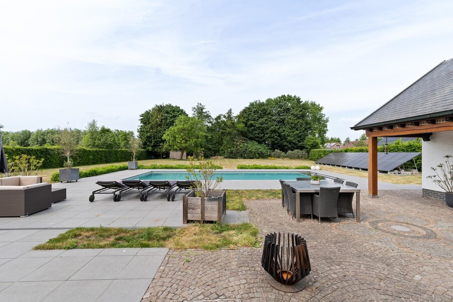 De tuin beschikt over een ruim zonneterras met ingebouwde barbecue, een verwarmd zwembad van 12 op 5 meter (met rolluik en warmtepomp), drie tuinbergingen, een houtstockage … 28 zonnepanelen (2022) en een laadpaal maken het plaatje af.