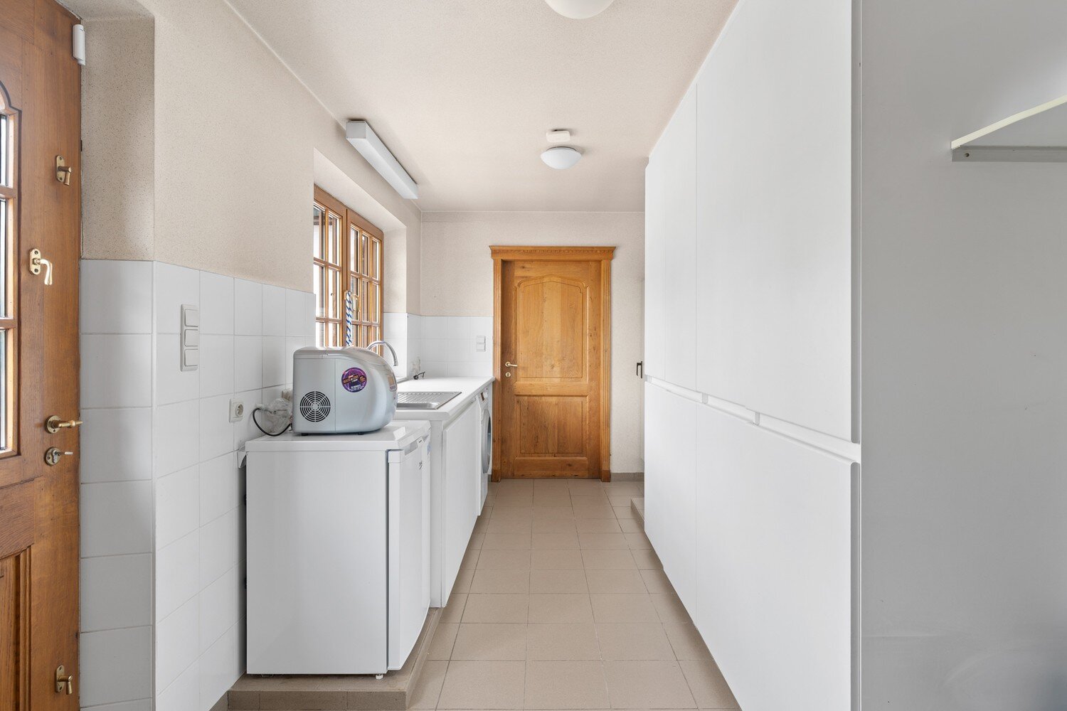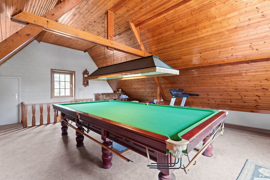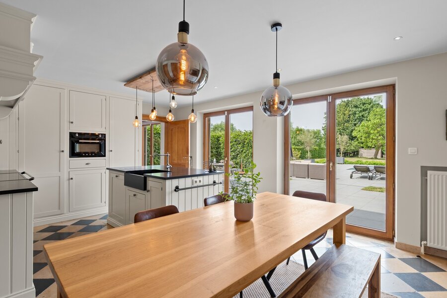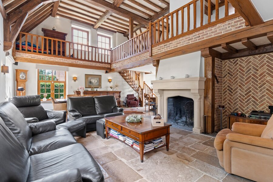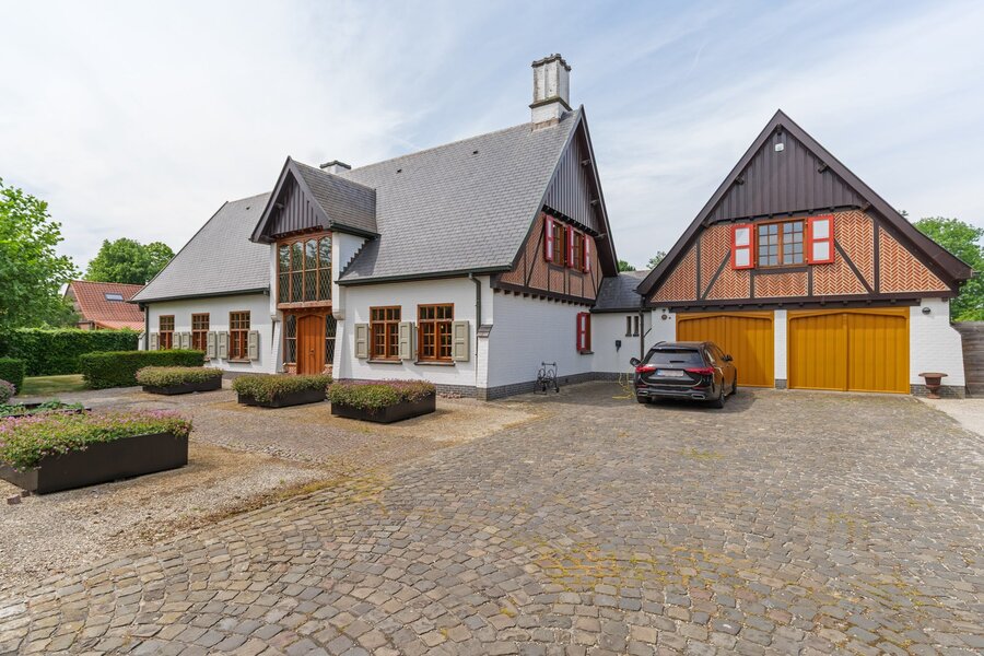 Binnenkomen doen we in de impressionante inkomhal met een prachtig glas-in-loodraam en centrale trap en gastentoilet. De ruime, l-vormige leefruimte staat in nauw contact met de tuin en is opengewerkt tot in de nok. De grote open haard zorgt voor sfeer en gezelligheid op koudere avonden. De volledig vernieuwde, landelijke keuken is gesloten, doch in verbinding met de tuin. Ze werd uitgerust met een kookvuur van SMEG met 5 bekkens, een oven, grill, bordenwarmer, combi microgolfoven-oven, vaatwasser en koelkast. Aansluitend situeert zich de berging en wasruimte, waarna men de dubbele garage bereikt. Boven de garage is momenteel een mancave ingericht, met bar en snookertafel. Verder is er een eerste slaapkamer gelijkvloers voorzien, samen met een badkamer en een douchekamer.