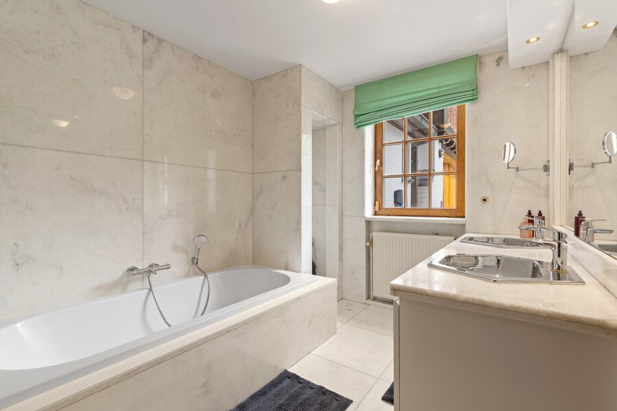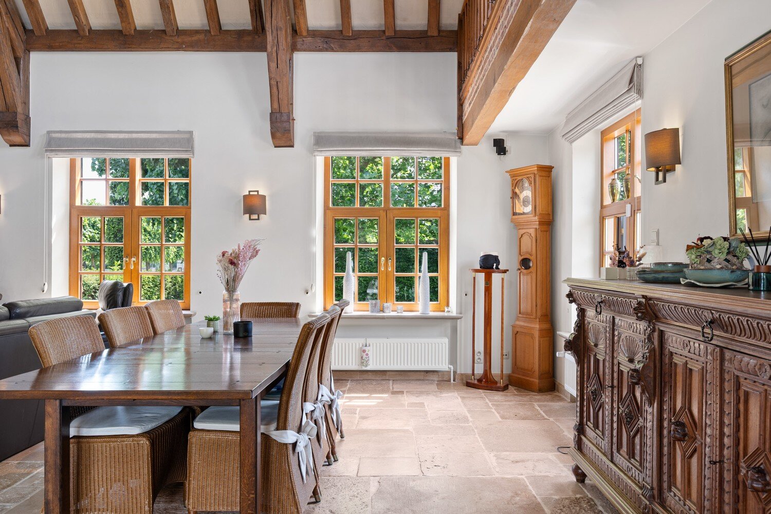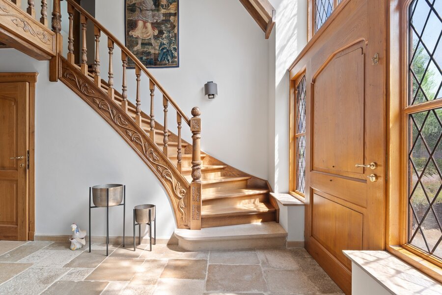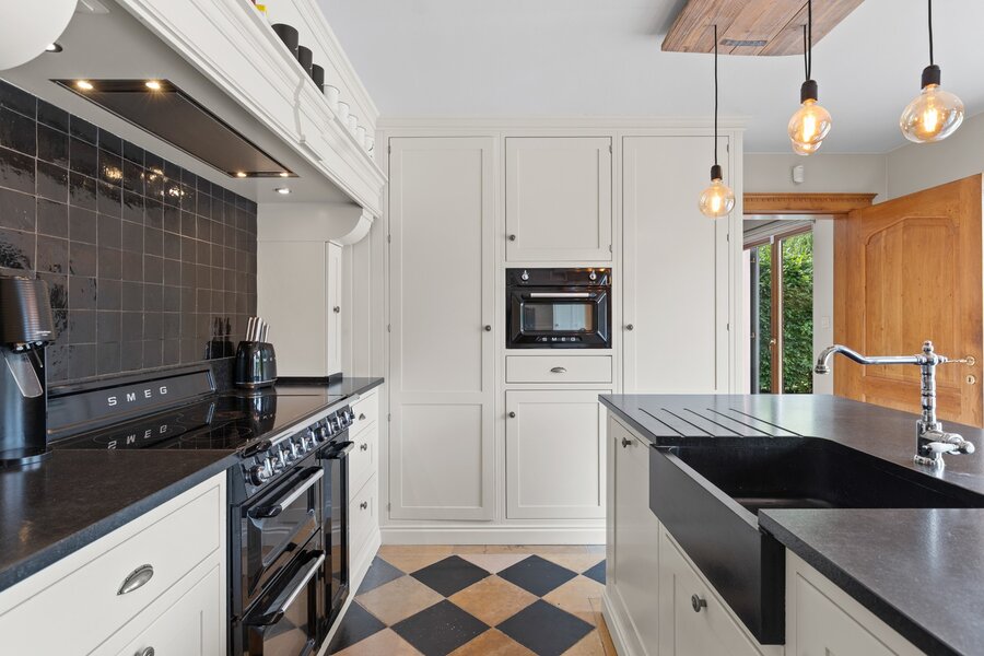 Binnenkomen doen we in de impressionante inkomhal met een prachtig glas-in-loodraam en centrale trap en gastentoilet. De ruime, l-vormige leefruimte staat in nauw contact met de tuin en is opengewerkt tot in de nok. De grote open haard zorgt voor sfeer en gezelligheid op koudere avonden. De volledig vernieuwde, landelijke keuken is gesloten, doch in verbinding met de tuin. Ze werd uitgerust met een kookvuur van SMEG met 5 bekkens, een oven, grill, bordenwarmer, combi microgolfoven-oven, vaatwasser en koelkast. Aansluitend situeert zich de berging en wasruimte, waarna men de dubbele garage bereikt. Boven de garage is momenteel een mancave ingericht, met bar en snookertafel. Verder is er een eerste slaapkamer gelijkvloers voorzien, samen met een badkamer en een douchekamer.
