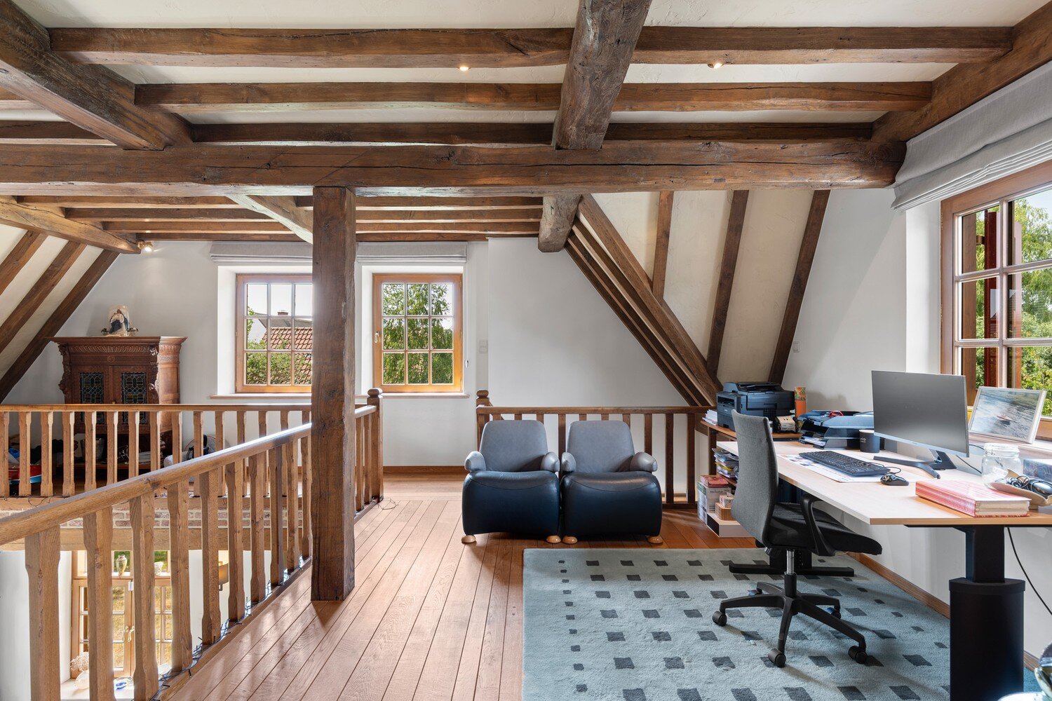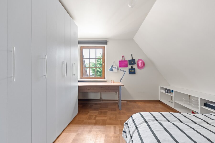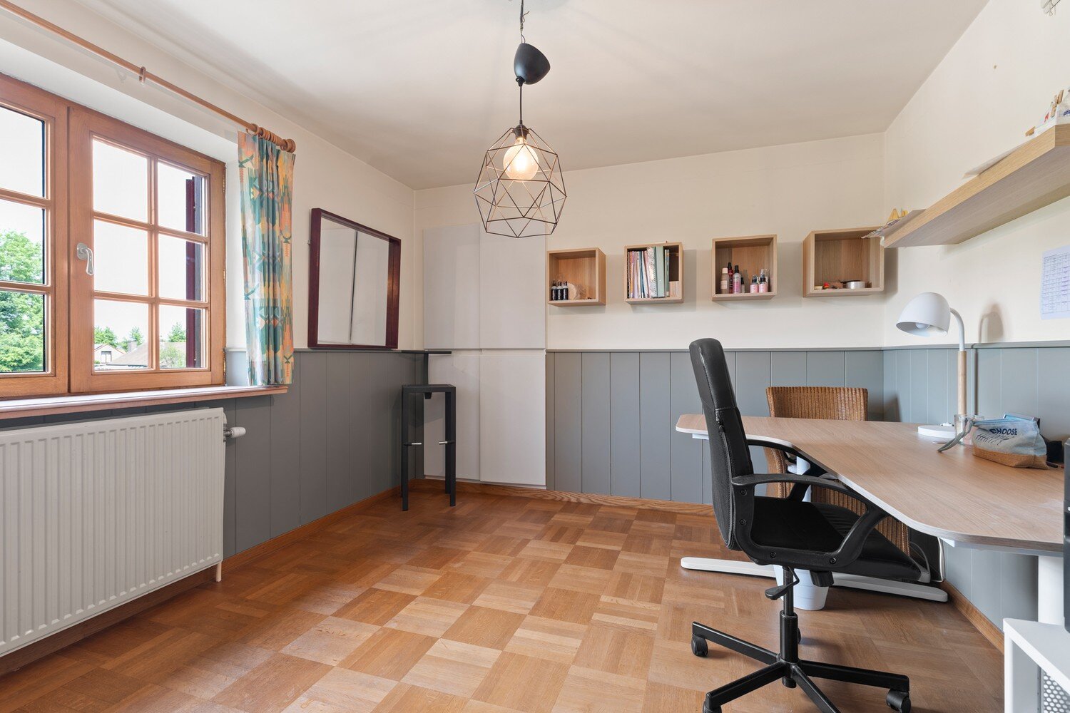 De verdieping telt drie slaapkamers, een toilet en een douchekamer, alsook een zeer grote, polyvalente ruimte die momenteel is ingericht als bureau. Tot slot is er een praktische bergzolder en een kelder.
