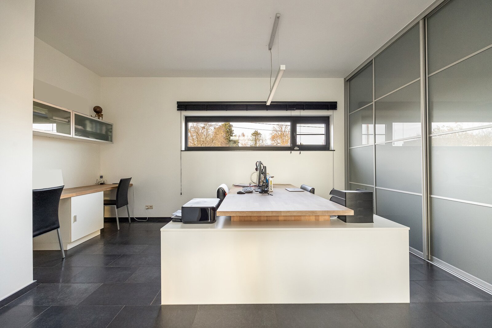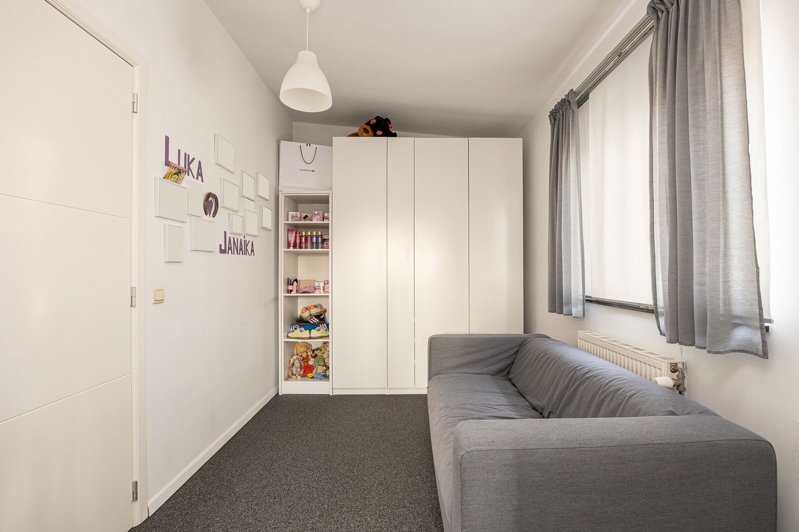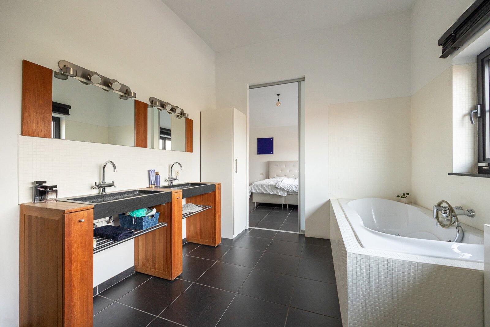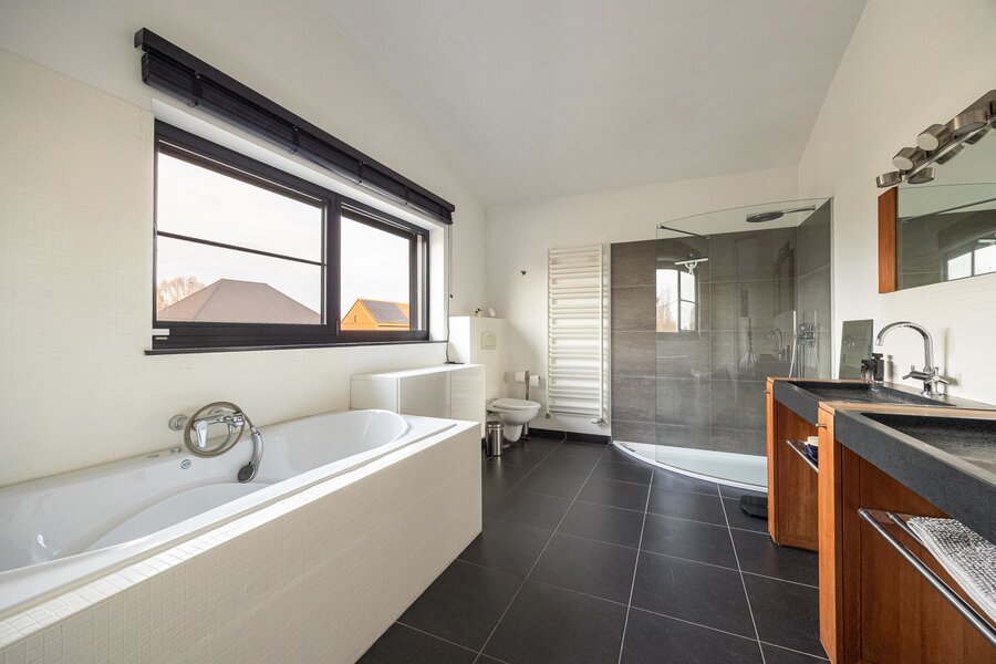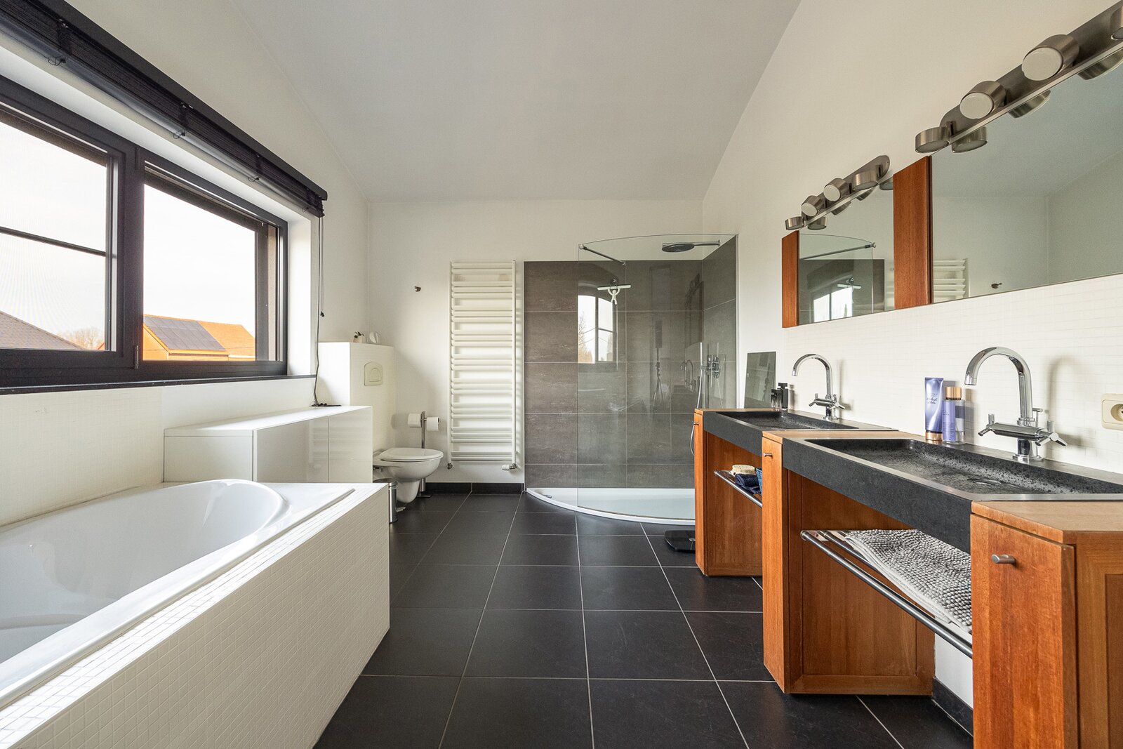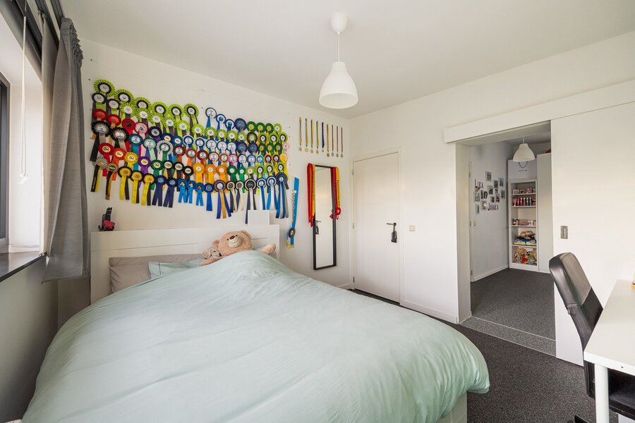 De woning beschikt over drie volwaardige slaapkamers, elk met een aansluitende dressing, en twee stijlvol afgewerkte badkamers die rust en comfort uitstralen. De dressings van de kinderkamers kunnen ook perfect als extra slaapkamer dienen waardoor men over 5 slaapkamers beschikt. Zowel op het gelijkvloers als op de verdieping is er een aparte bureauruimte, ideaal voor thuiswerk of hobby’s. Daarnaast biedt een praktische kelder extra bergruimte.