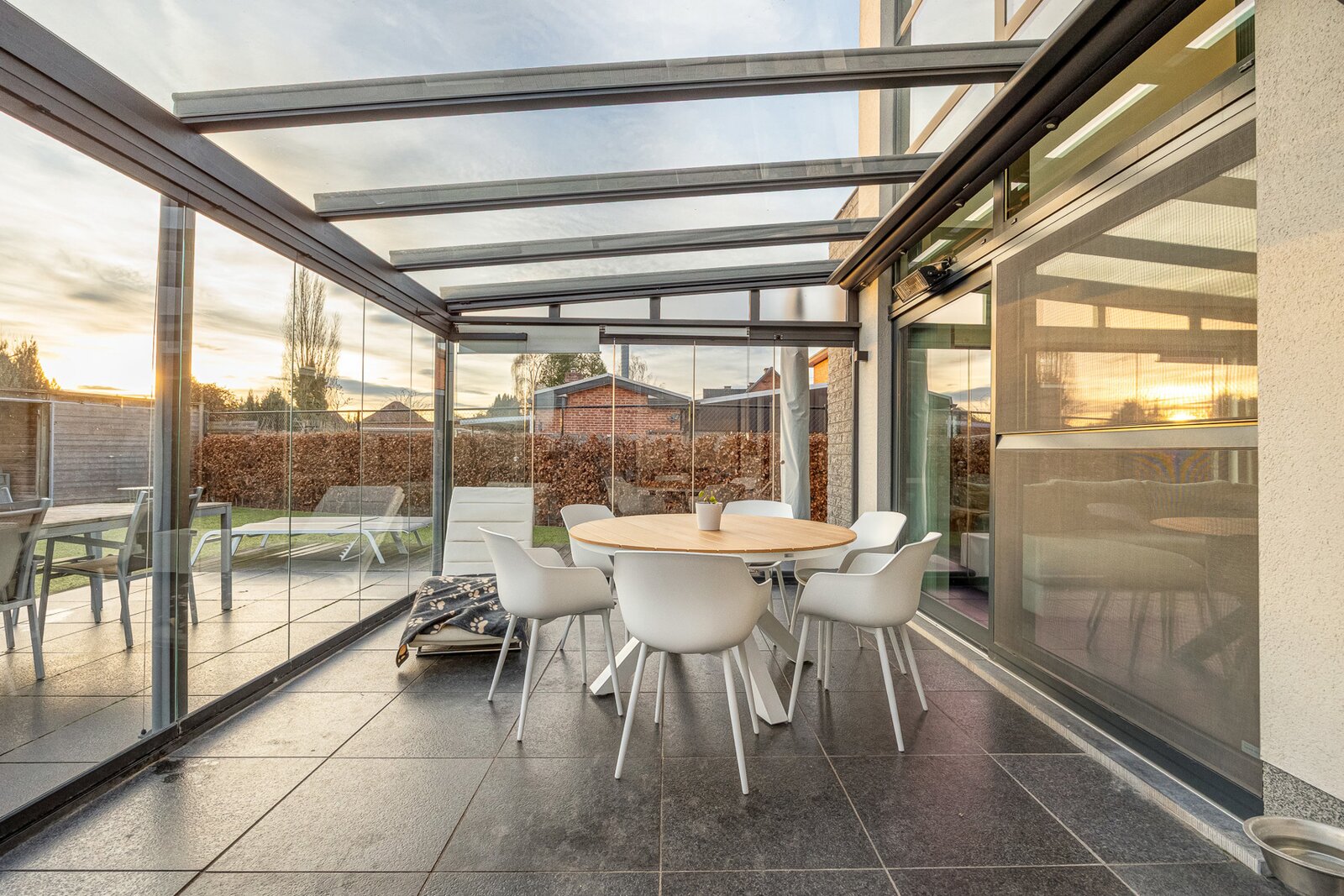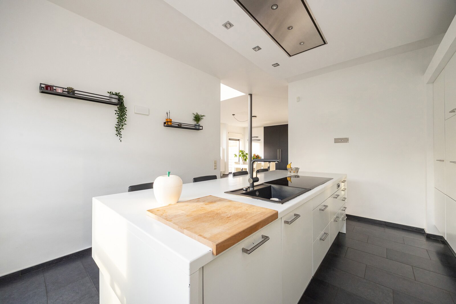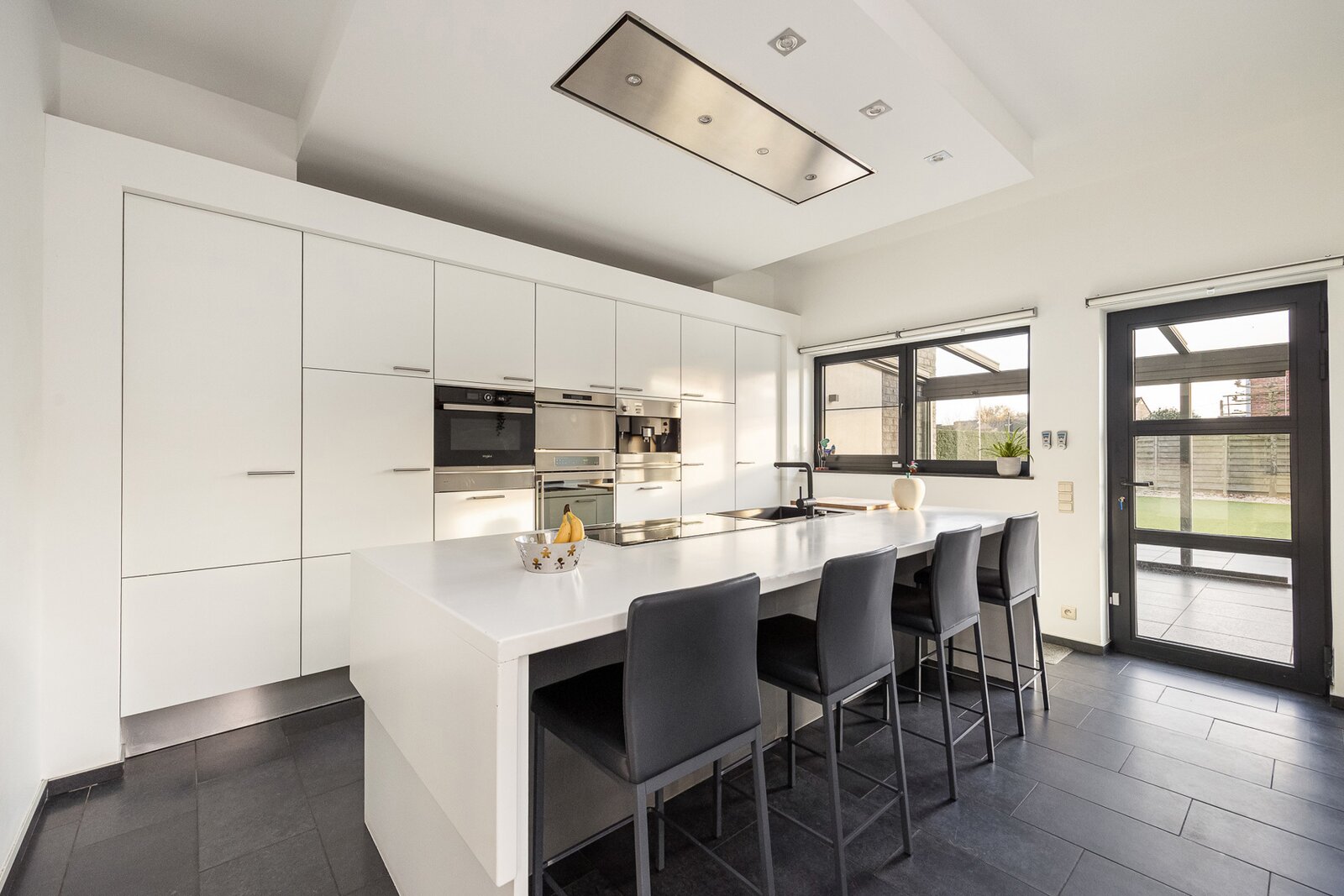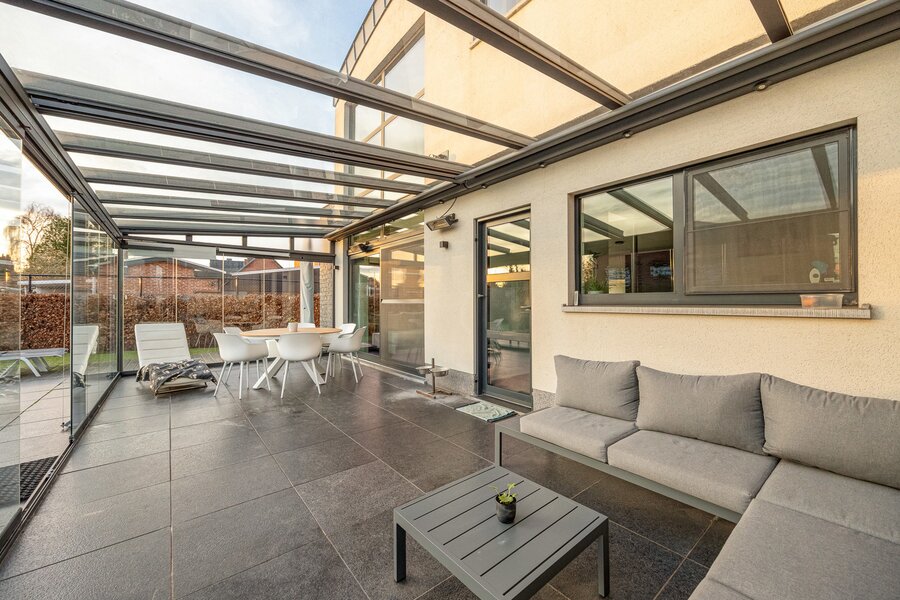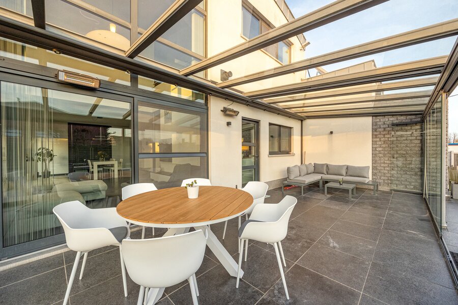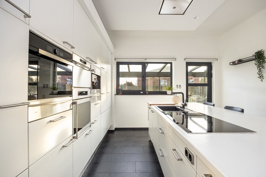 Bij het binnenkomen valt meteen de indrukwekkend hoge en lichtrijke leefruimte op, waar grote raampartijen én een sfeervolle gashaard zorgen voor een warme, uitnodigende atmosfeer. De prachtige open keuken is volledig uitgerust met kwalitatieve A-merk toestellen en vormt het kloppend hart van het huis. Aansluitend aan de leefruimte en met zicht op de tuin ligt een charmante veranda, een heerlijke plek om te genieten van het buitengevoel in alle seizoenen.