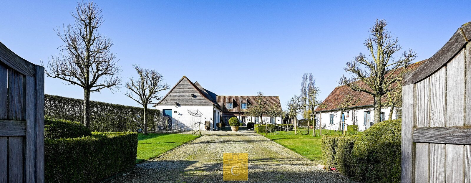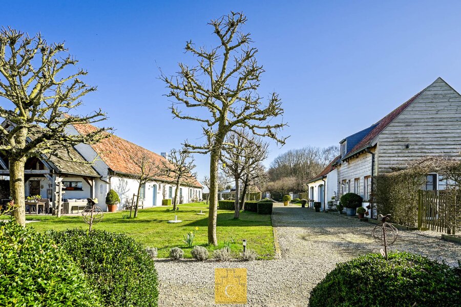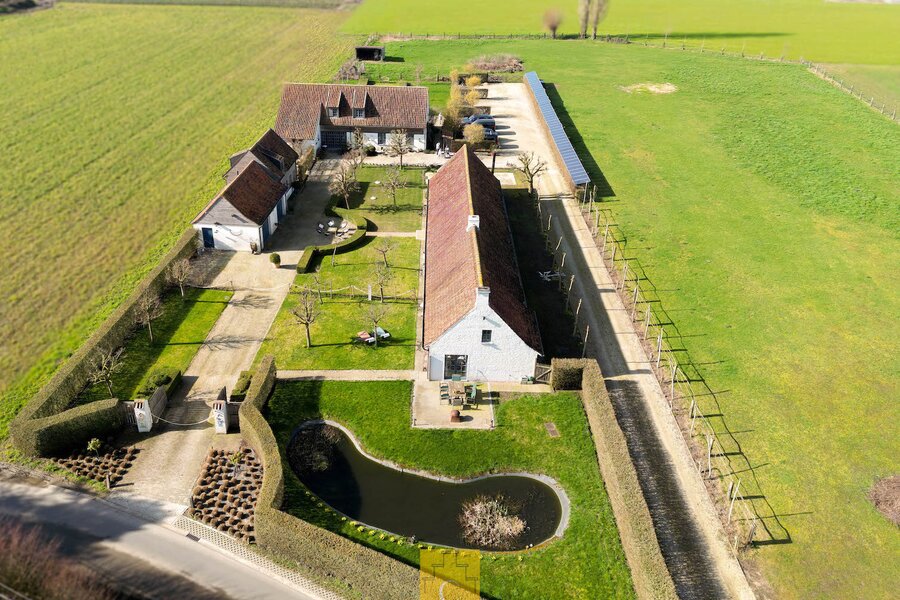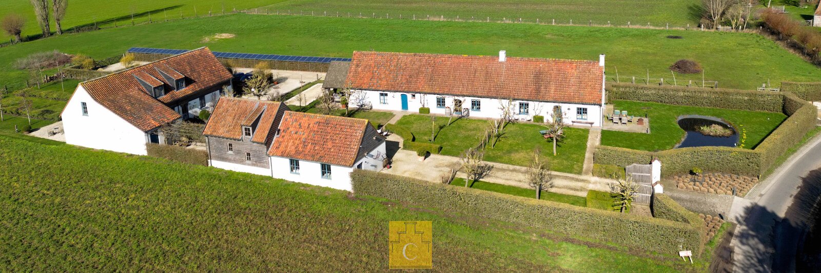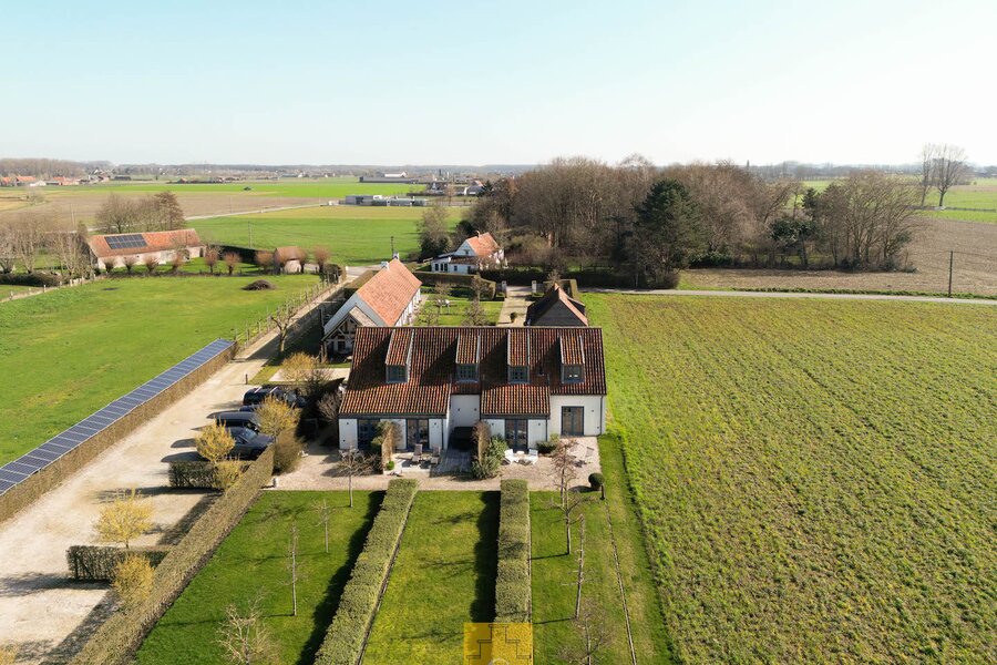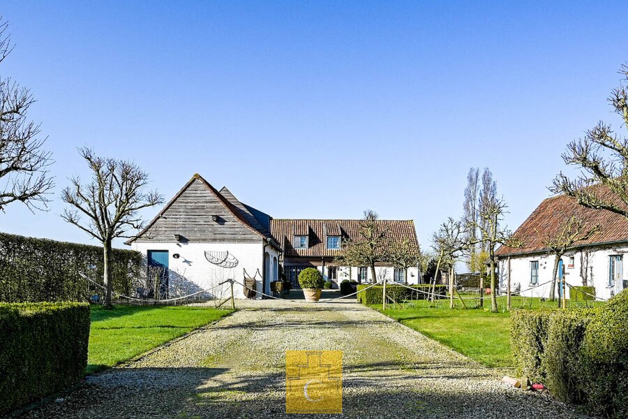 In het landelijke Doomkerke, een deelgemeente van Ruiselede-Wingene, in het brede hinterland tussen Brugge en Gent, vinden we deze voormalige hoeve met bijgebouwen, groot erf, dito parking en weiland, dit alles op een oppervlakte van 10.518 m2. De hoeve met zijn verankerde, wit beschilderde bakstenen gevels onder een zadeldak in Vlaamse pannen is opgenomen in de inventaris van het bouwkundig erfgoed en was reeds aangeduid op de Ferraris-kaart (1770-1778). Een schilderachtige locatie in landschappelijk waardevol agrarisch gebied. Het woongedeelte met zijn royale leefruimte open tot in de hoge nok van het dak werd in 1996 met heel veel spirit en een open blik verbouwd (met vergunning). Met 4 bijkomende stedenbouwkundige vergunningen tussen 2005 en 2018 werden de bijgebouwen verbouwd tot een vakantieverblijf met 6 luxe gastenkamers (15 slaapplaatsen/4* classificatie) en een welness. Het vakantieverblijf is tevens erkend als vakantiewoning (5* classificatie). Indeling : De woning werd in 1996 volledig verbouwd. Sindsdien zijn geen ingrijpende wijzigingen meer gebeurd. Het pand is heel origineel qua architectuur met behoud van de authentieke elementen. Het omvat op het gelijkvloers een inkom, toilet, ruime keuken met kleine leefplaats in het verlengde, grote berging met cv ketel mazout, kleine provisieberging met toegang tot kelder, een WOW living met brede schouw, grotendeels open tot in de nok van het dak (roostering werd verwijderd, een passerelle in glas verbindt de slaapkamers op het verdiep). Op het verdiep een grote slaapkamer op de topgevel met lavabo, een voorkamer (bevloering gedeeltelijk in glas) aansluitend bij de 1ste slaapkamer, een grote slaapkamer aan de andere kant van de woning (deze kamer en de voorkamer zijn verbonden door de glazen passerelle) met douche-, bad- en dressingkamer. Garage voor 2 wagens. Ze heeft energielabel D (306 kWh/m2 jaar). Vakantieverblijf (B & B of vakantiewoning) : Op het gelijkvloers een inkom met trap, een overloop naar het welnessgedeelte, een grote gemeenschappelijke gastenruimte met zit- en ontbijthoek en ingerichte keuken, 2 toiletten, klein bureau, een sauna met aansluitend een rustruimte met douche, uitgevend op het terras/ligweide met jacuzzi. Verder op het gelijkvloers gastenkamer 1 met volledige badkamer.