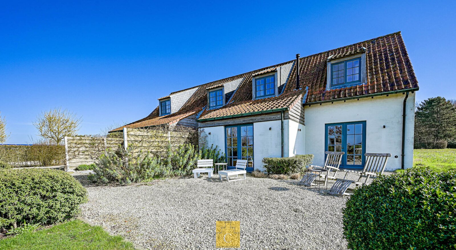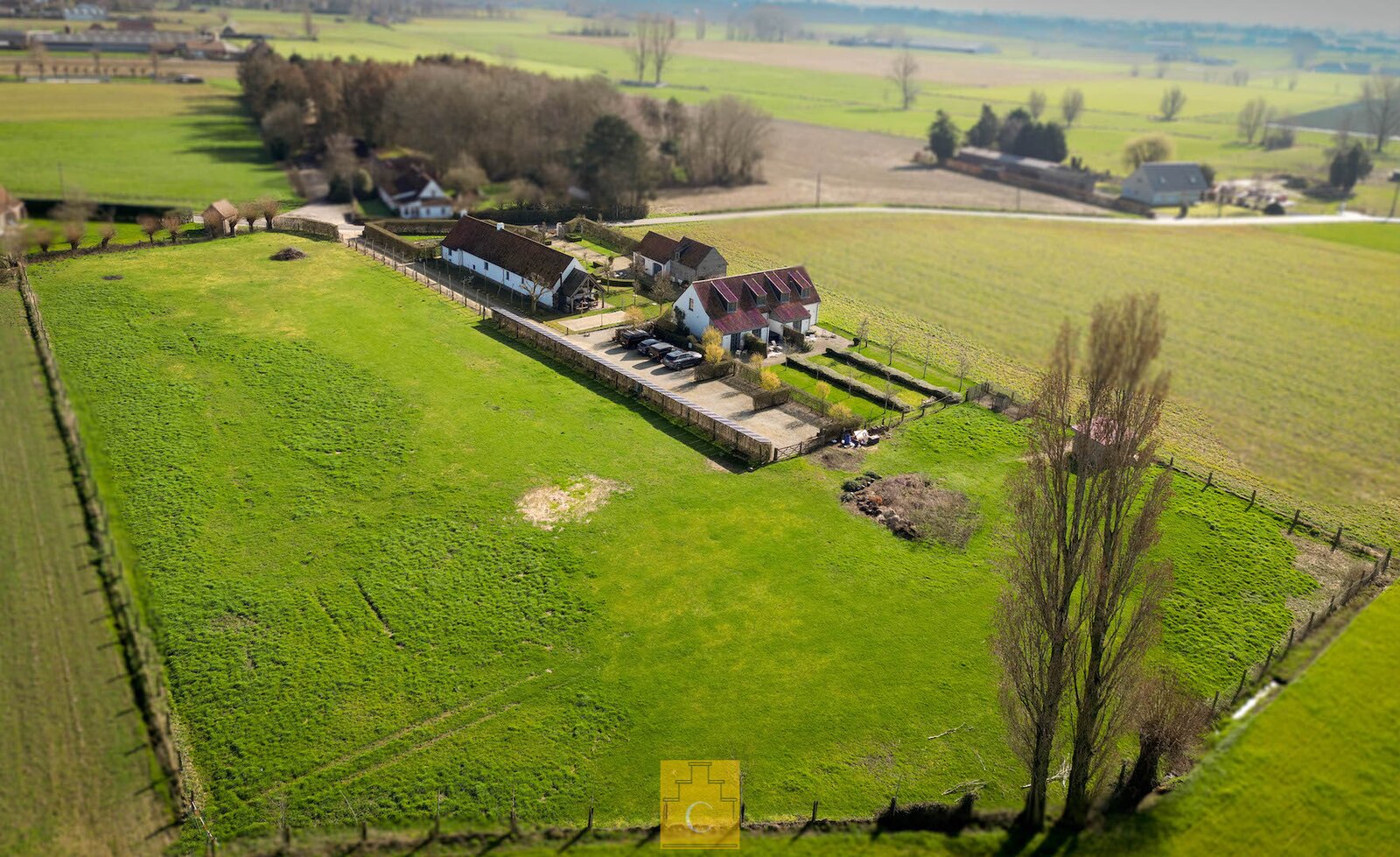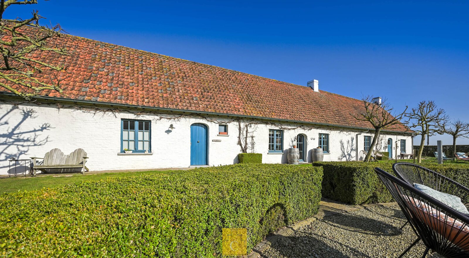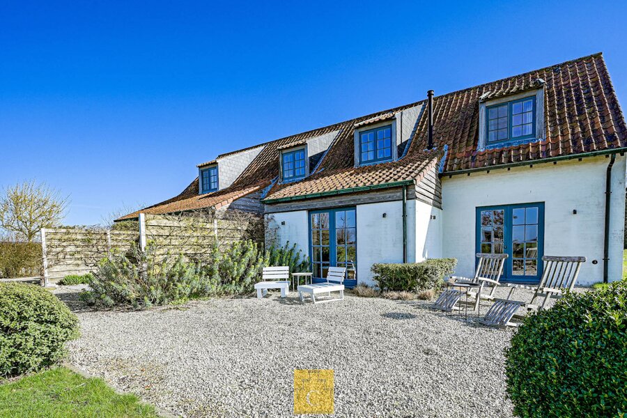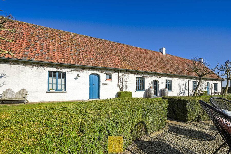 In het landelijke Doomkerke, een deelgemeente van Ruiselede-Wingene, in het brede hinterland tussen Brugge en Gent, vinden we deze voormalige hoeve met bijgebouwen, groot erf, dito parking en weiland, dit alles op een oppervlakte van 10.518 m2. De hoeve met zijn verankerde, wit beschilderde bakstenen gevels onder een zadeldak in Vlaamse pannen is opgenomen in de inventaris van het bouwkundig erfgoed en was reeds aangeduid op de Ferraris-kaart (1770-1778). Een schilderachtige locatie in landschappelijk waardevol agrarisch gebied. Het woongedeelte met zijn royale leefruimte open tot in de hoge nok van het dak werd in 1996 met heel veel spirit en een open blik verbouwd (met vergunning). Met 4 bijkomende stedenbouwkundige vergunningen tussen 2005 en 2018 werden de bijgebouwen verbouwd tot een vakantieverblijf met 6 luxe gastenkamers (15 slaapplaatsen/4* classificatie) en een welness. Het vakantieverblijf is tevens erkend als vakantiewoning (5* classificatie). Indeling : De woning werd in 1996 volledig verbouwd. Sindsdien zijn geen ingrijpende wijzigingen meer gebeurd. Het pand is heel origineel qua architectuur met behoud van de authentieke elementen. Het omvat op het gelijkvloers een inkom, toilet, ruime keuken met kleine leefplaats in het verlengde, grote berging met cv ketel mazout, kleine provisieberging met toegang tot kelder, een WOW living met brede schouw, grotendeels open tot in de nok van het dak (roostering werd verwijderd, een passerelle in glas verbindt de slaapkamers op het verdiep). Op het verdiep een grote slaapkamer op de topgevel met lavabo, een voorkamer (bevloering gedeeltelijk in glas) aansluitend bij de 1ste slaapkamer, een grote slaapkamer aan de andere kant van de woning (deze kamer en de voorkamer zijn verbonden door de glazen passerelle) met douche-, bad- en dressingkamer. Garage voor 2 wagens. Ze heeft energielabel D (306 kWh/m2 jaar). Vakantieverblijf (B & B of vakantiewoning) : Op het gelijkvloers een inkom met trap, een overloop naar het welnessgedeelte, een grote gemeenschappelijke gastenruimte met zit- en ontbijthoek en ingerichte keuken, 2 toiletten, klein bureau, een sauna met aansluitend een rustruimte met douche, uitgevend op het terras/ligweide met jacuzzi. Verder op het gelijkvloers gastenkamer 1 met volledige badkamer.