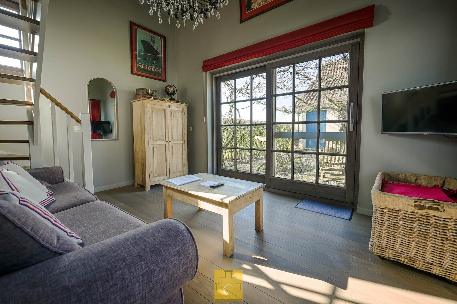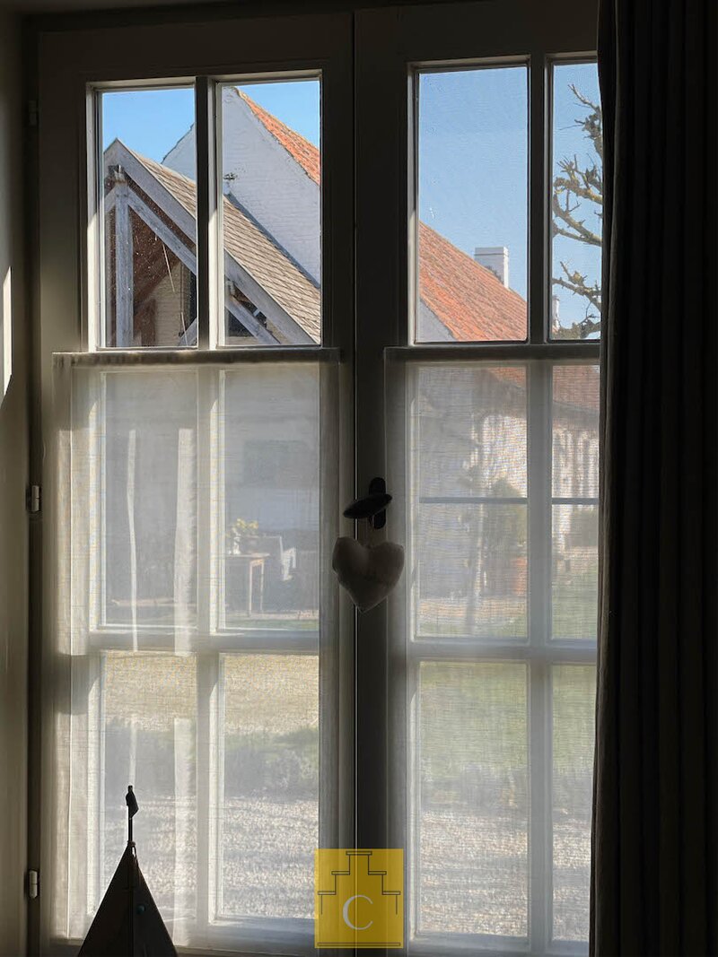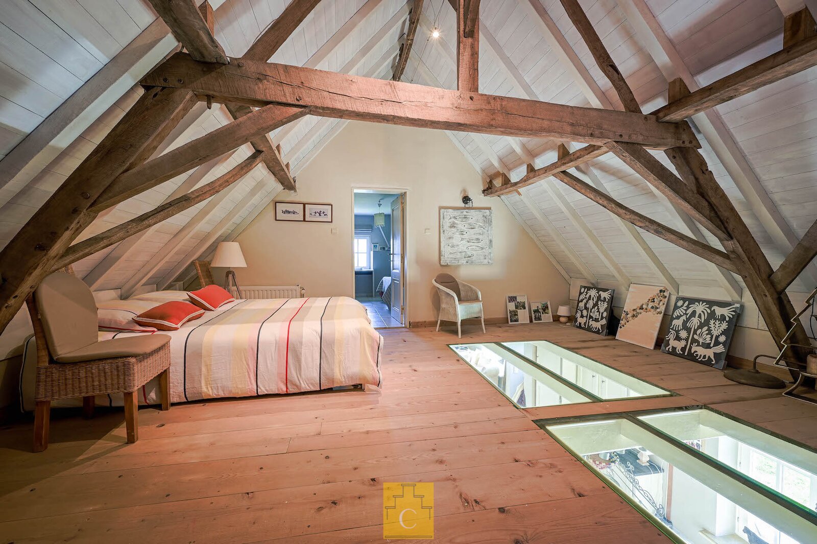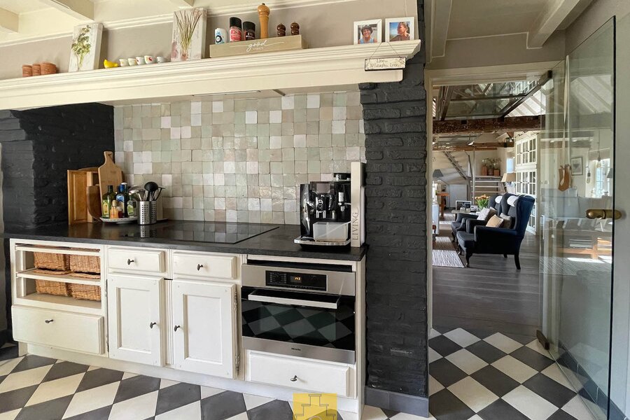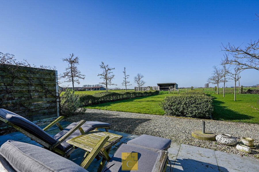 In het landelijke Doomkerke, een deelgemeente van Ruiselede-Wingene, in het brede hinterland tussen Brugge en Gent, vinden we deze voormalige hoeve met bijgebouwen, groot erf, dito parking en weiland, dit alles op een oppervlakte van 10.518 m2. De hoeve met zijn verankerde, wit beschilderde bakstenen gevels onder een zadeldak in Vlaamse pannen is opgenomen in de inventaris van het bouwkundig erfgoed en was reeds aangeduid op de Ferraris-kaart (1770-1778). Een schilderachtige locatie in landschappelijk waardevol agrarisch gebied. Het woongedeelte met zijn royale leefruimte open tot in de hoge nok van het dak werd in 1996 met heel veel spirit en een open blik verbouwd (met vergunning). Met 4 bijkomende stedenbouwkundige vergunningen tussen 2005 en 2018 werden de bijgebouwen verbouwd tot een vakantieverblijf met 6 luxe gastenkamers (15 slaapplaatsen/4* classificatie) en een welness. Het vakantieverblijf is tevens erkend als vakantiewoning (5* classificatie). Indeling : De woning werd in 1996 volledig verbouwd. Sindsdien zijn geen ingrijpende wijzigingen meer gebeurd. Het pand is heel origineel qua architectuur met behoud van de authentieke elementen. Het omvat op het gelijkvloers een inkom, toilet, ruime keuken met kleine leefplaats in het verlengde, grote berging met cv ketel mazout, kleine provisieberging met toegang tot kelder, een WOW living met brede schouw, grotendeels open tot in de nok van het dak (roostering werd verwijderd, een passerelle in glas verbindt de slaapkamers op het verdiep). Op het verdiep een grote slaapkamer op de topgevel met lavabo, een voorkamer (bevloering gedeeltelijk in glas) aansluitend bij de 1ste slaapkamer, een grote slaapkamer aan de andere kant van de woning (deze kamer en de voorkamer zijn verbonden door de glazen passerelle) met douche-, bad- en dressingkamer. Garage voor 2 wagens. Ze heeft energielabel D (306 kWh/m2 jaar). Vakantieverblijf (B & B of vakantiewoning) : Op het gelijkvloers een inkom met trap, een overloop naar het welnessgedeelte, een grote gemeenschappelijke gastenruimte met zit- en ontbijthoek en ingerichte keuken, 2 toiletten, klein bureau, een sauna met aansluitend een rustruimte met douche, uitgevend op het terras/ligweide met jacuzzi. Verder op het gelijkvloers gastenkamer 1 met volledige badkamer.