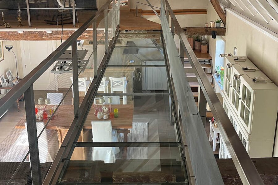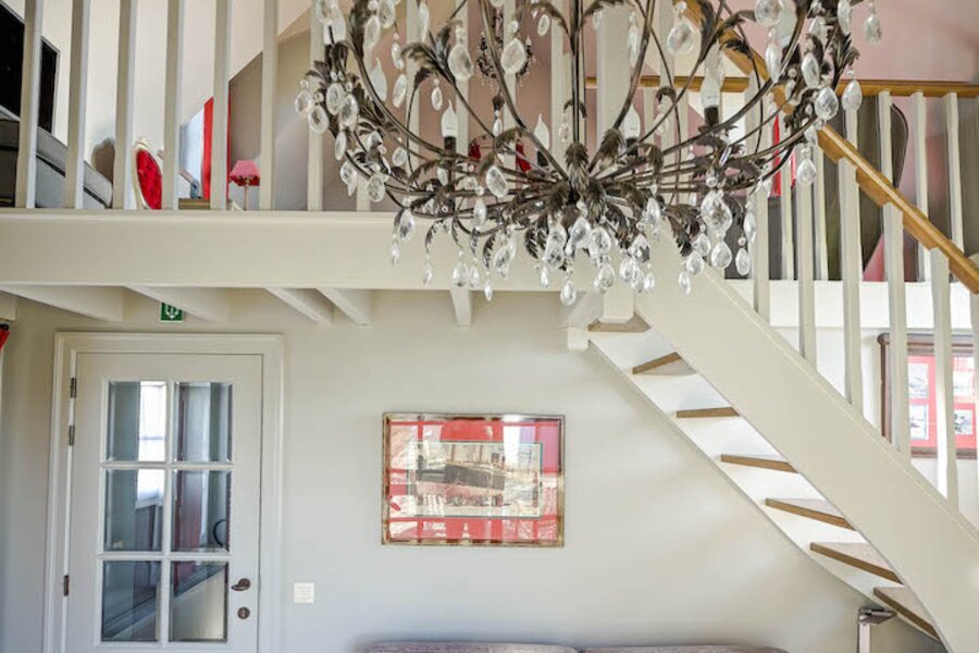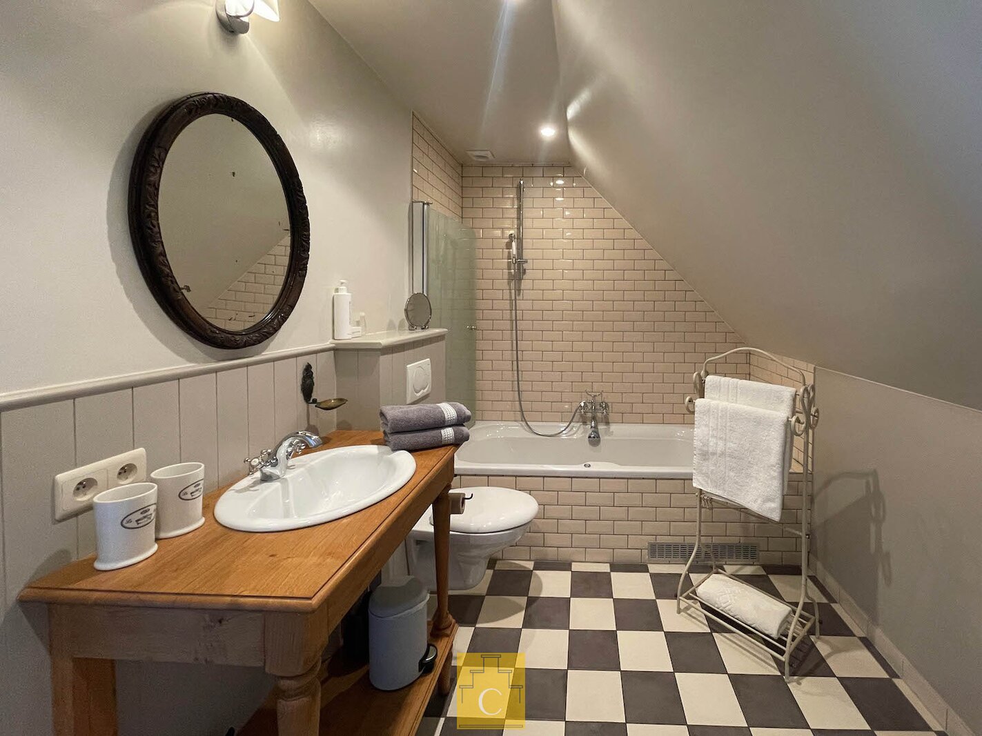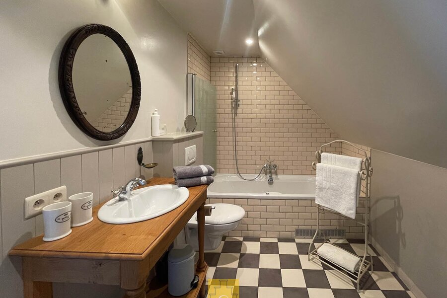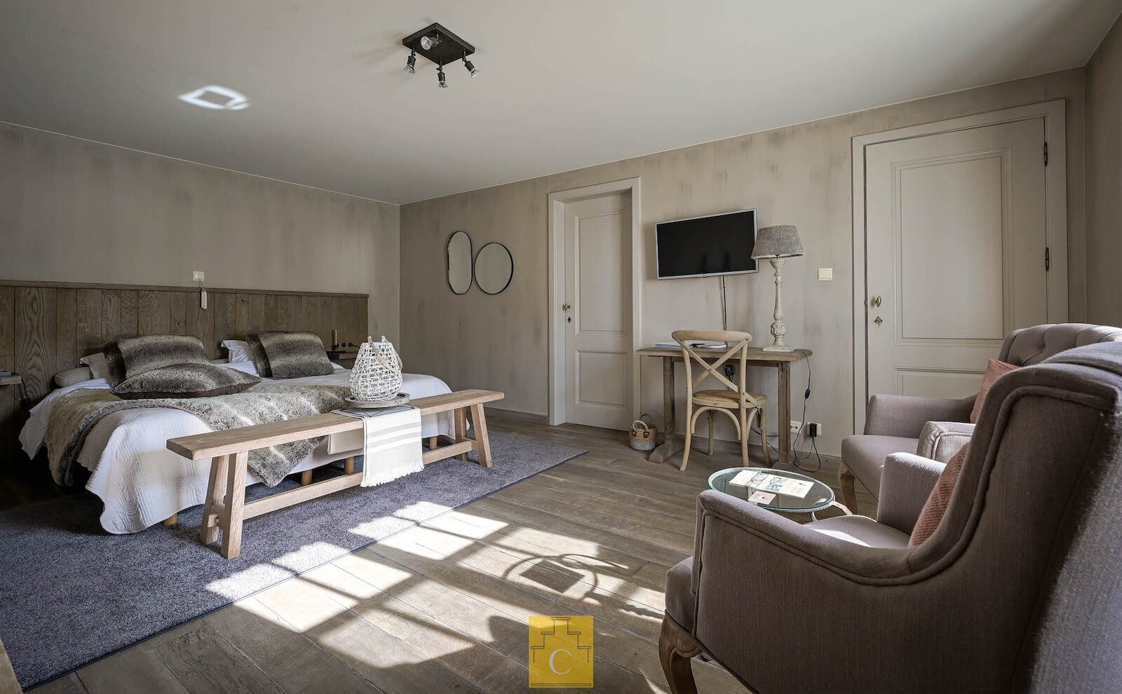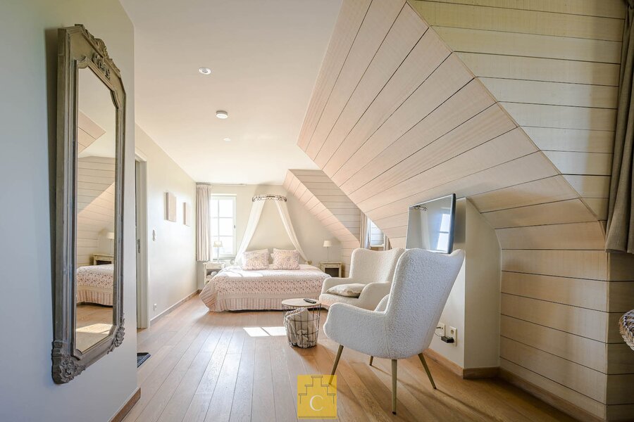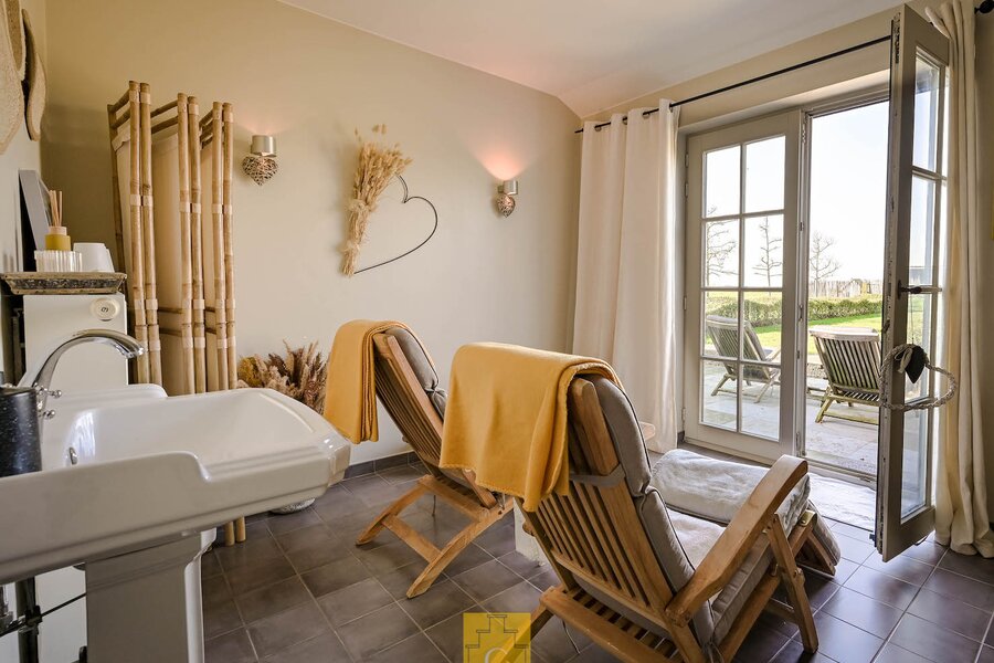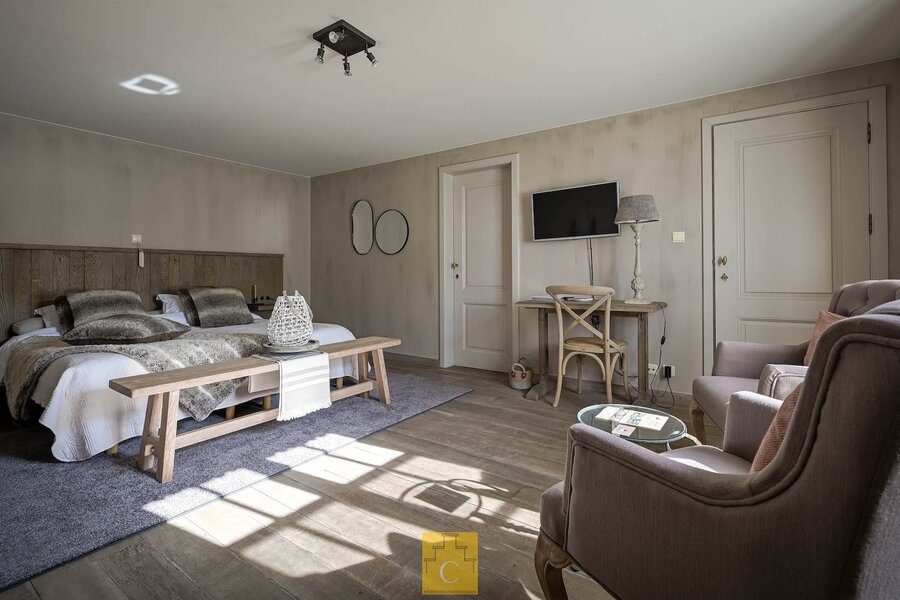 Op de verdieping : gastenkamer 2 met volledige badkamer, gastenkamer 3 en 4 (Junior suite kamers met apart bubbelbad, douche en toilet in badkamer, in de verbouwde berging palend aan het woonhuis : gastenkamer 5 met volledige badkamer en dressing, palend aan de garage gastenkamer 6 (master suite kamer met luxueuse badkamer, apart toilet, aparte zithoek en privé-tuintje). Het vakantieverblijf is ingericht in landelijke stijl en werd regelmatig geupdated. Het bevindt zich in perfect onderhouden staat. Het vakantieverblijf heeft energielabel C.