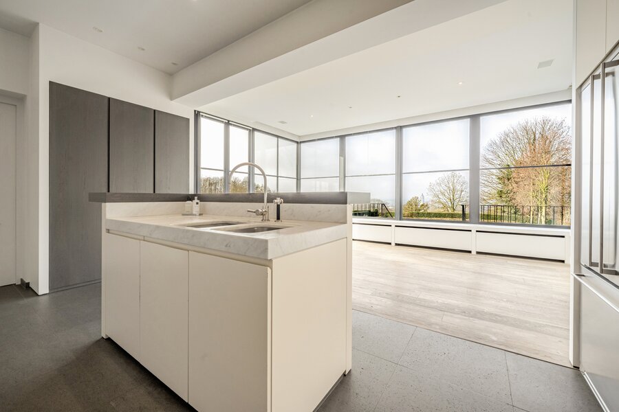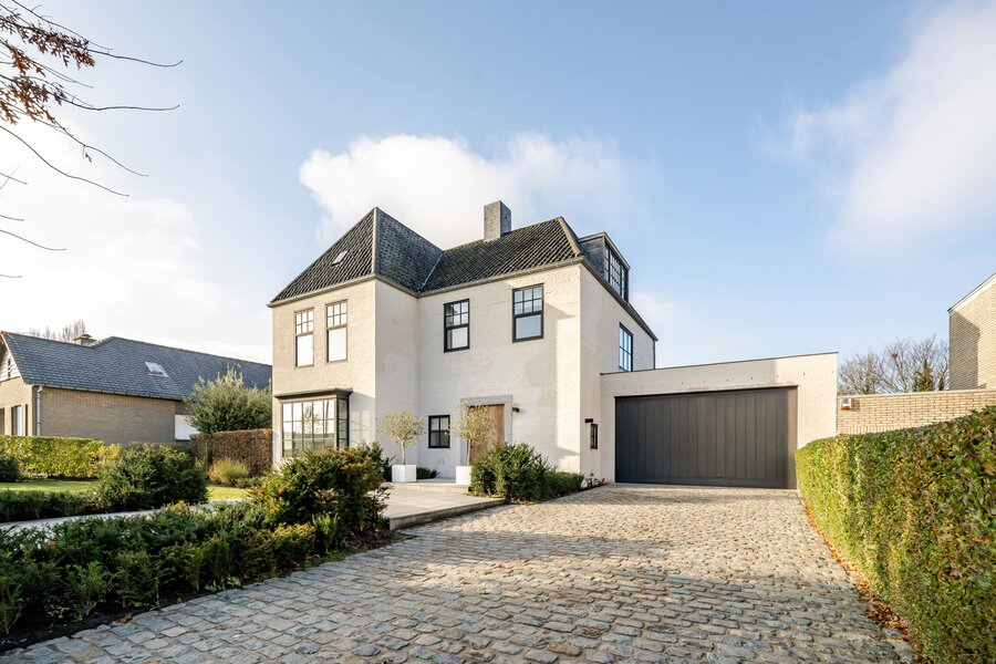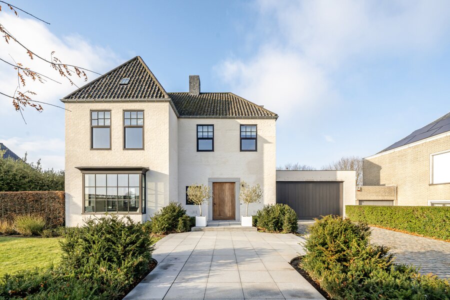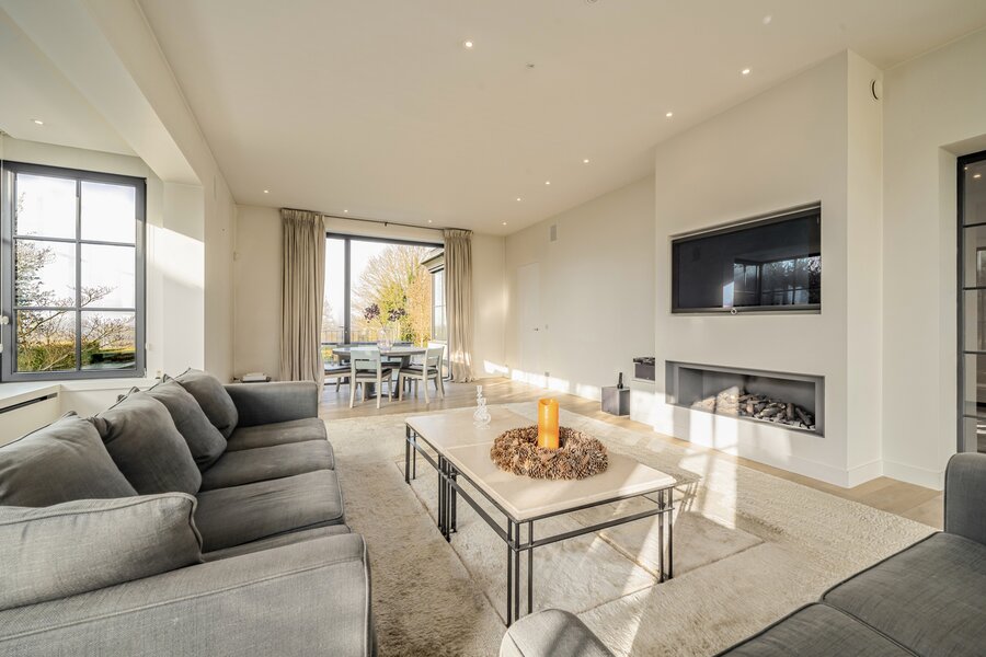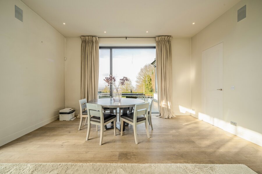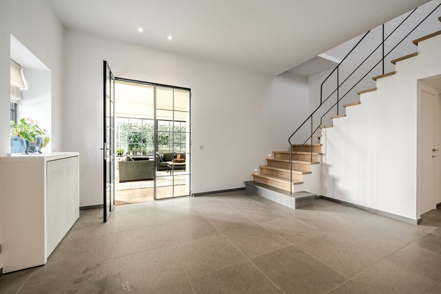 We betreden de woning via de royale inkomhal, voorzien van een aparte dressing en gastentoilet. Vervolgens komen we in de lichtrijke eet- en leefruimte met gezellige haard. Aansluitend bevindt zich de volledig geïnstalleerde keuken. Op het gelijkvloers beschikt de woning bovendien over een praktische wasruimte en een ruime dubbele garage.