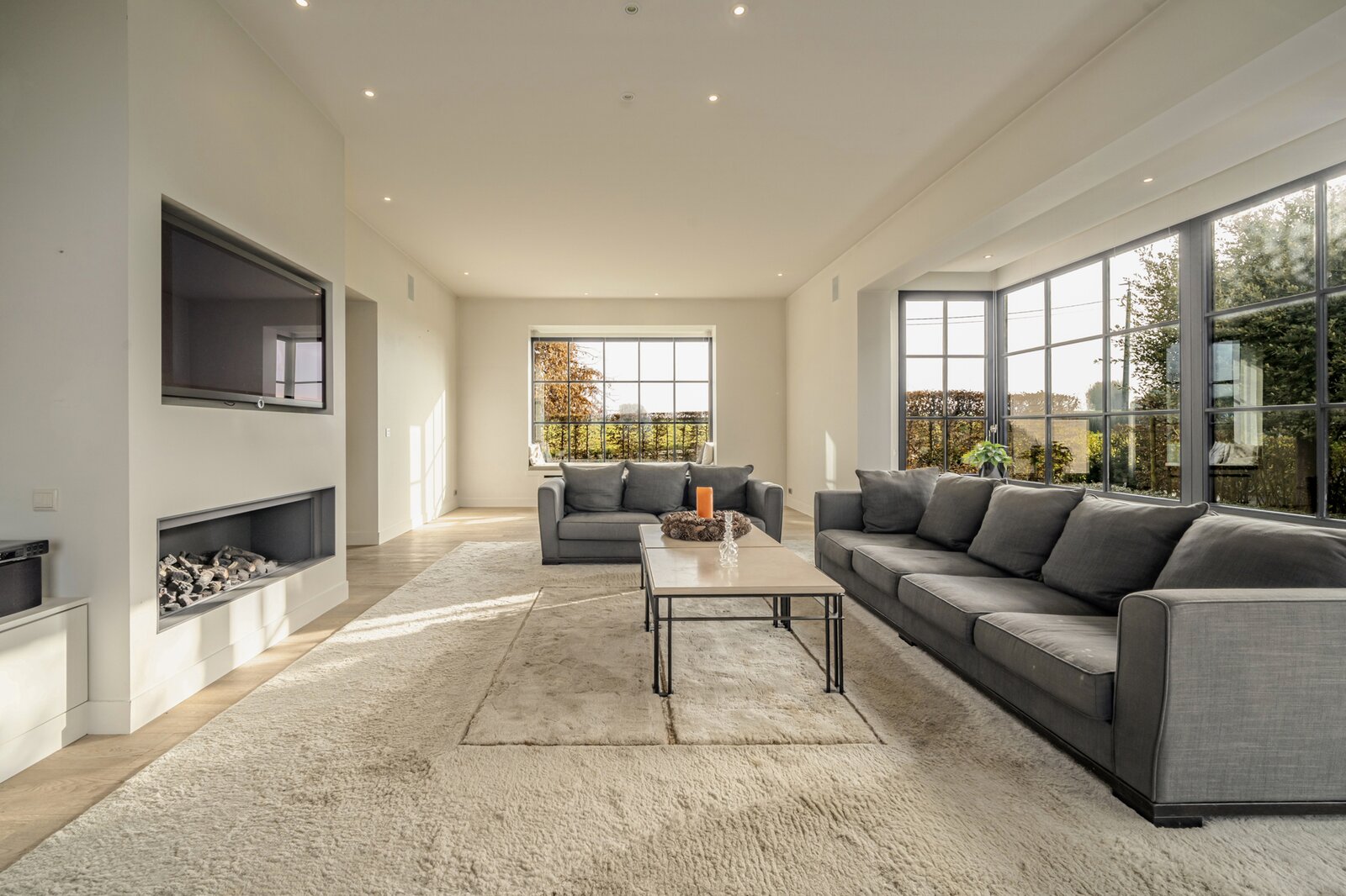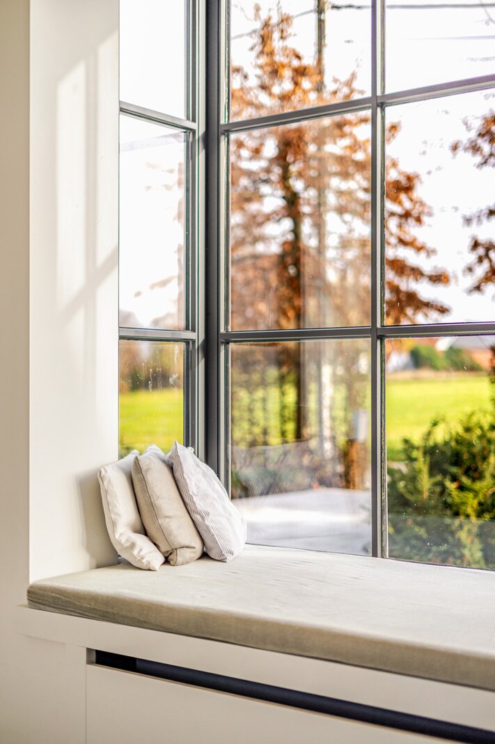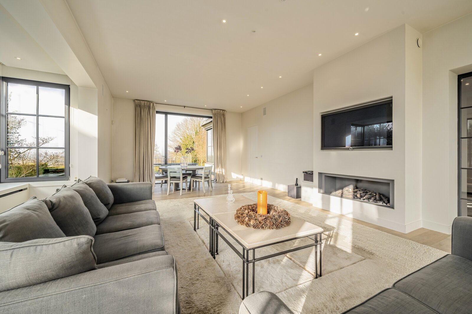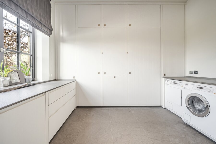 We betreden de woning via de royale inkomhal, voorzien van een aparte dressing en gastentoilet. Vervolgens komen we in de lichtrijke eet- en leefruimte met gezellige haard. Aansluitend bevindt zich de volledig geïnstalleerde keuken. Op het gelijkvloers beschikt de woning bovendien over een praktische wasruimte en een ruime dubbele garage.