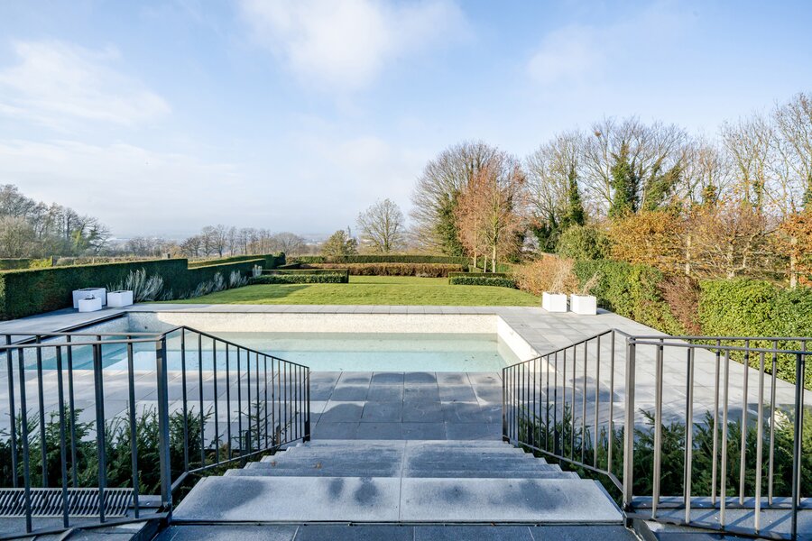 Ook buiten is het puur genieten: de aangelegde tuin met terras en zwembad vormt een waar paradijs voor ontspanning en gezelligheid, met opnieuw dat prachtige panoramische uitzicht.