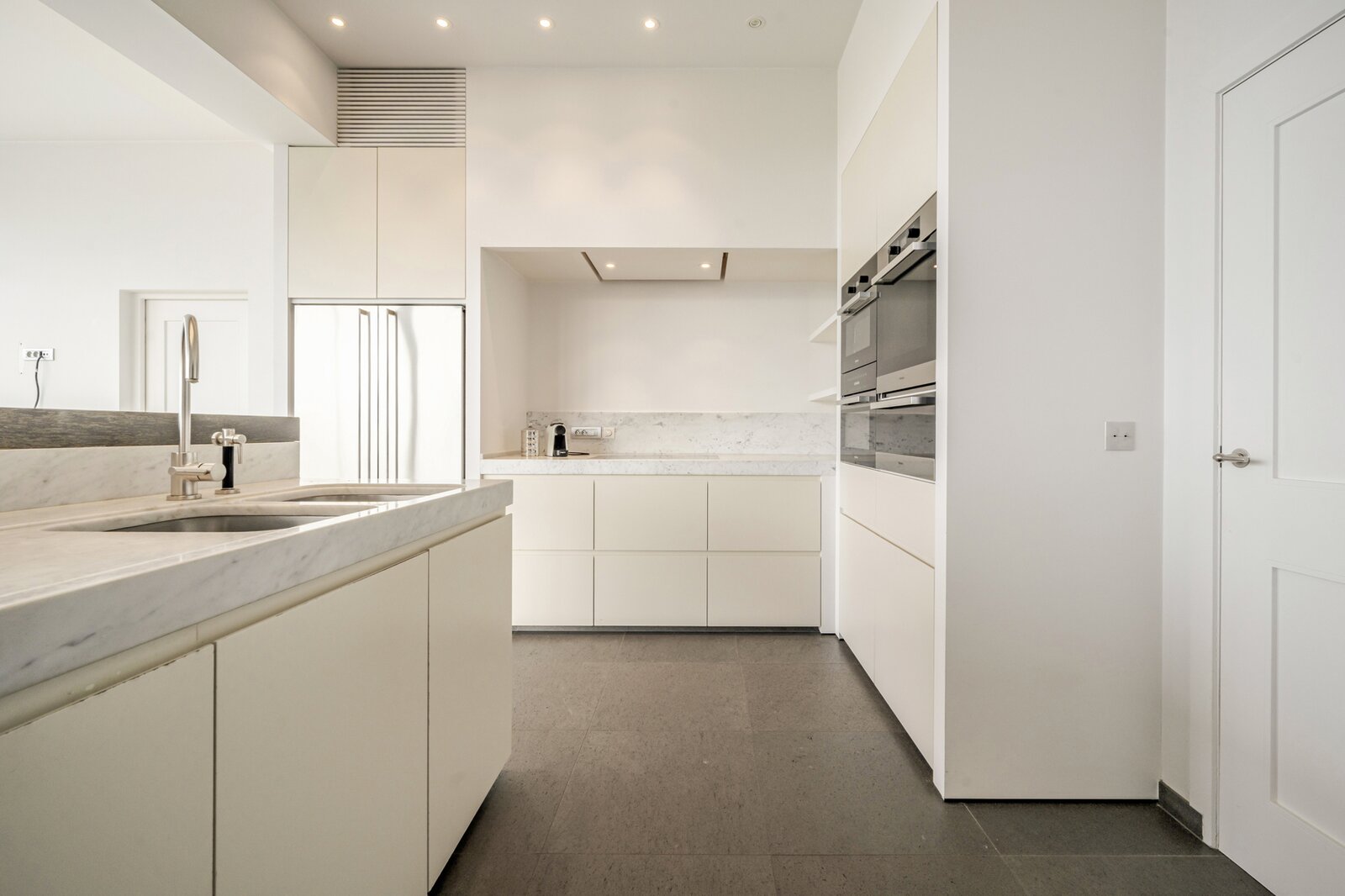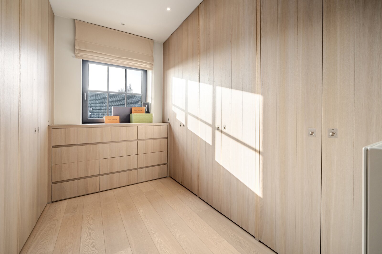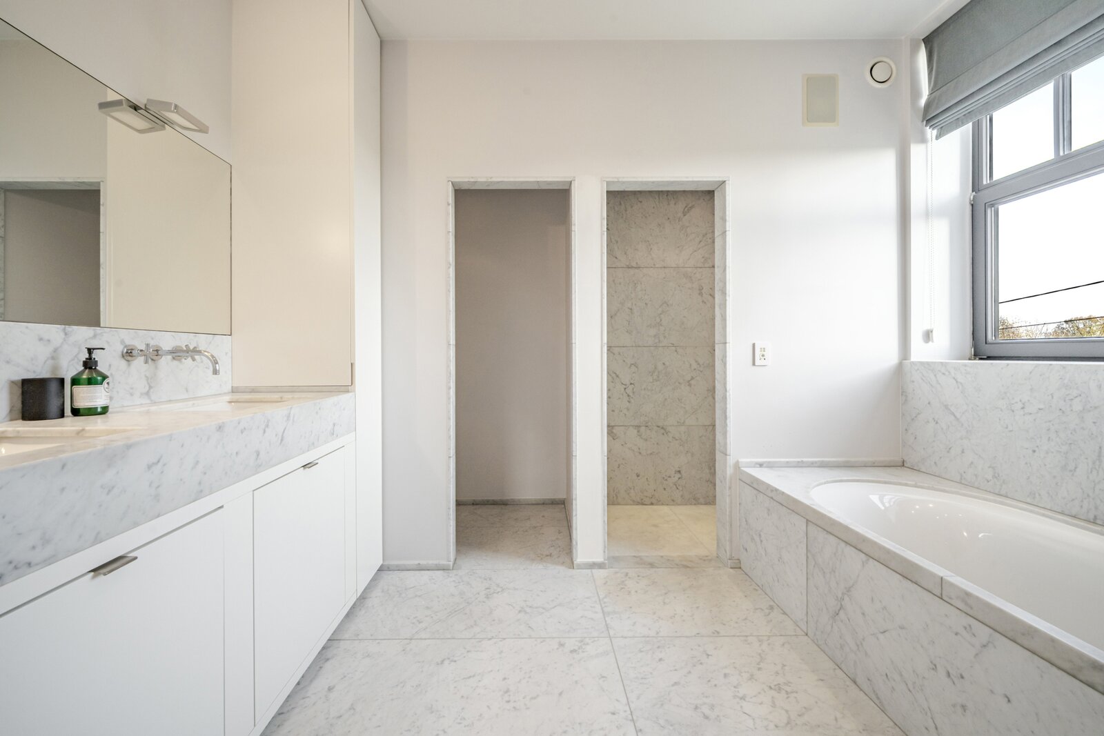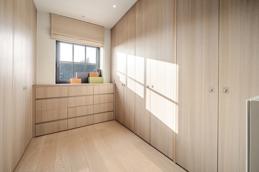 De eerste verdieping telt drie slaapkamers. De masterbedroom is uitgerust met een eigen dressing en een luxueuze badkamer met bad, douche en toilet. De twee overige slaapkamers beschikken eveneens elk over een eigen douche. Daarnaast is er nog een bureauruimte voorzien, ideaal voor thuiswerk of studiemomenten.