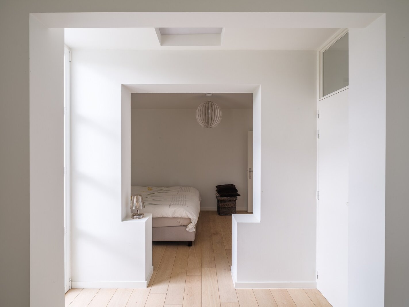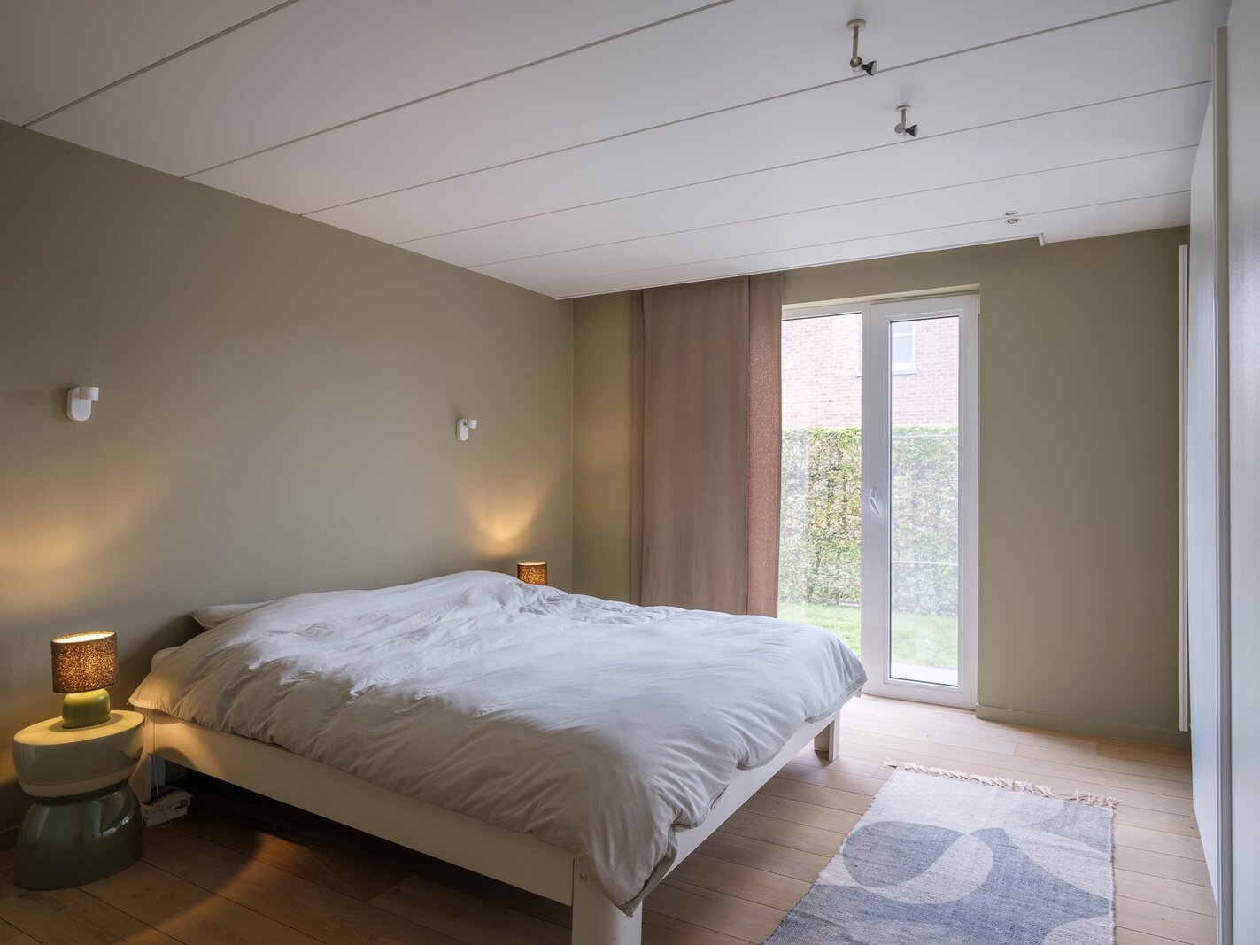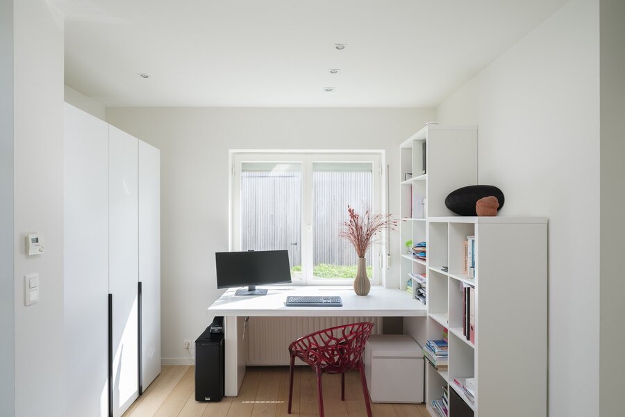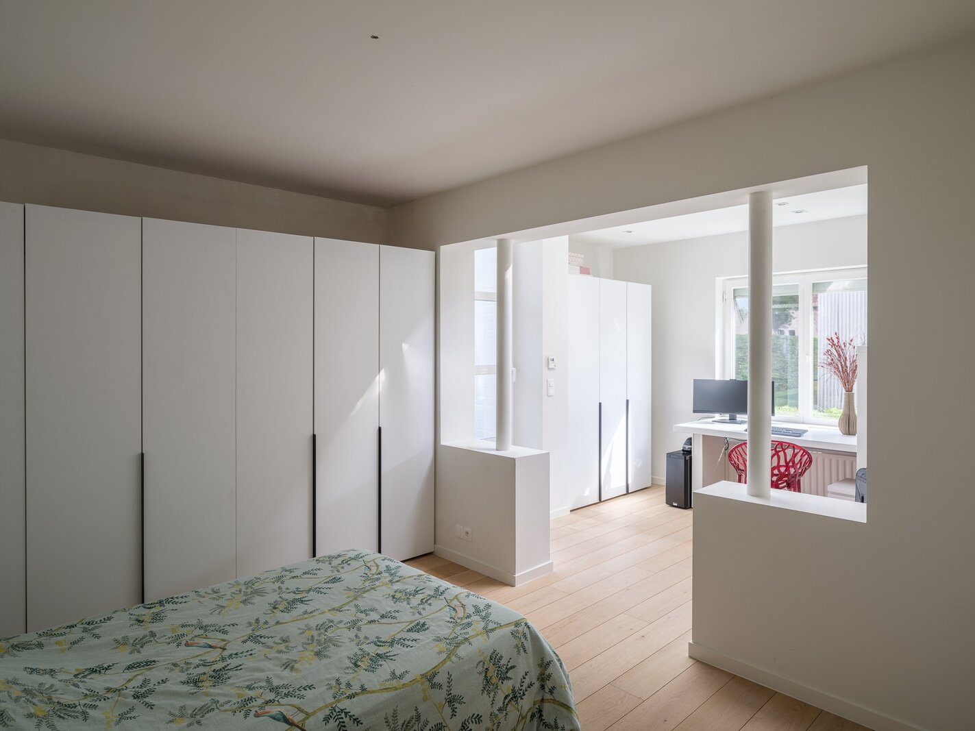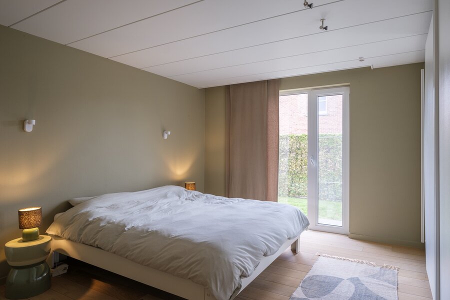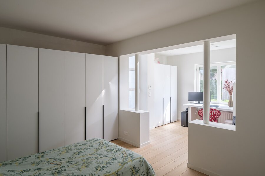 À l'intérieur, vous êtes accueilli dans un hall d'entrée avec toilettes pour invités. Le salon lumineux et ouvert, avec son poêle à bois encastré, crée une atmosphère chaleureuse et conviviale, tandis que les grandes baies vitrées offrent une vue magnifique sur l'extérieur. À côté se trouve la cuisine entièrement équipée, dotée d'appareils électroménagers de qualité et de tout le confort moderne. Dans l'autre aile de la maison se trouve la chambre principale avec sa propre salle de douche.
