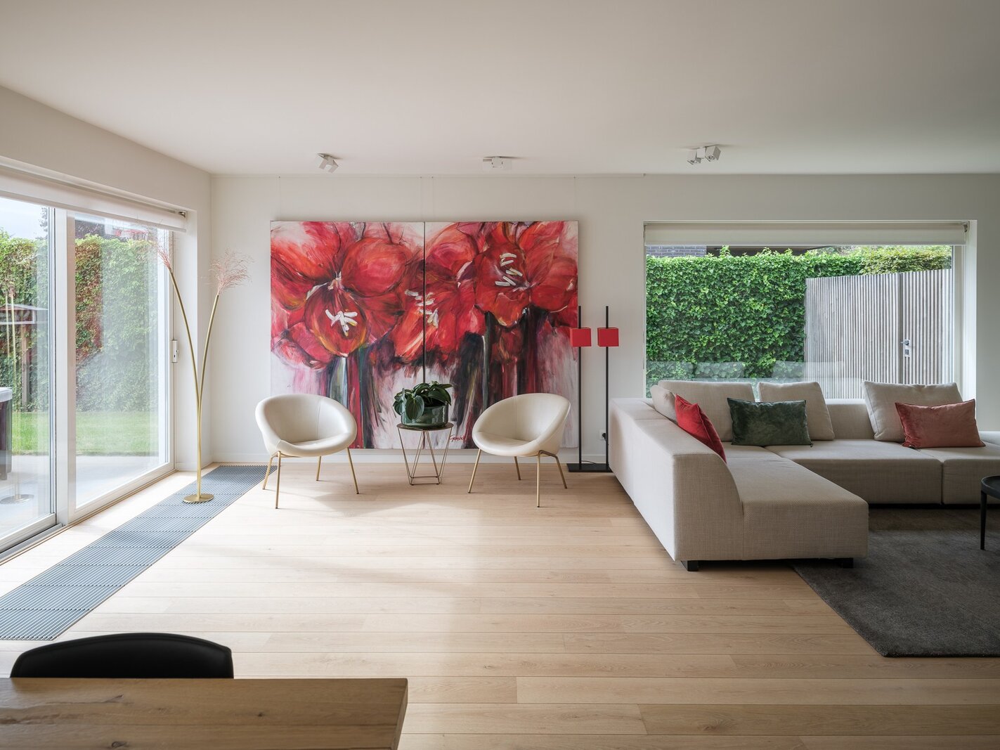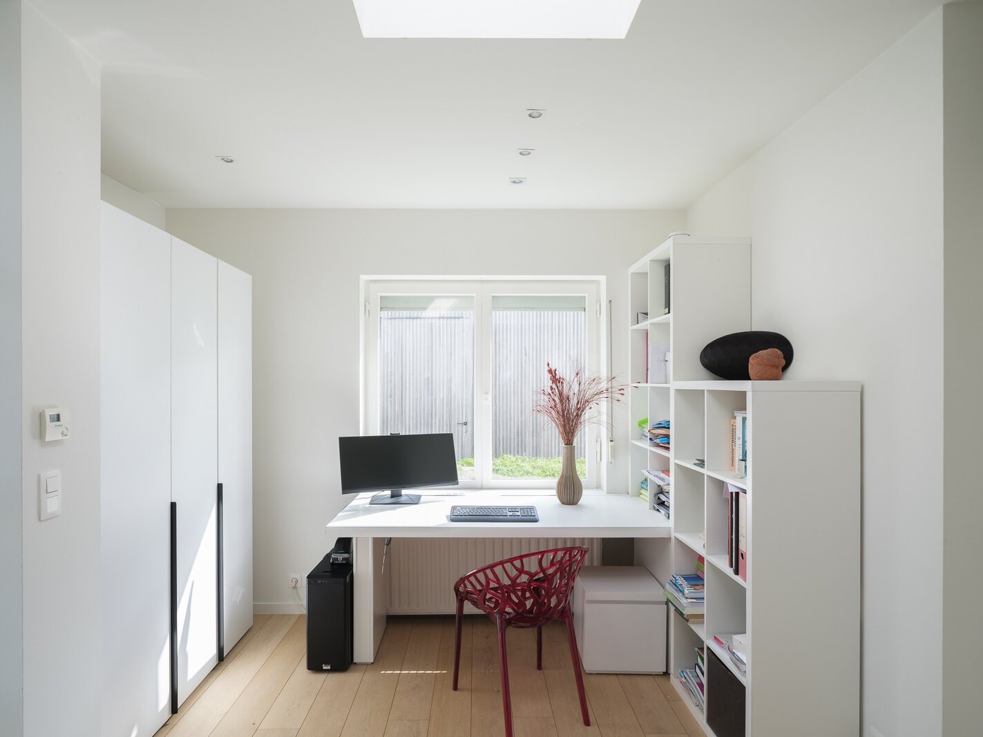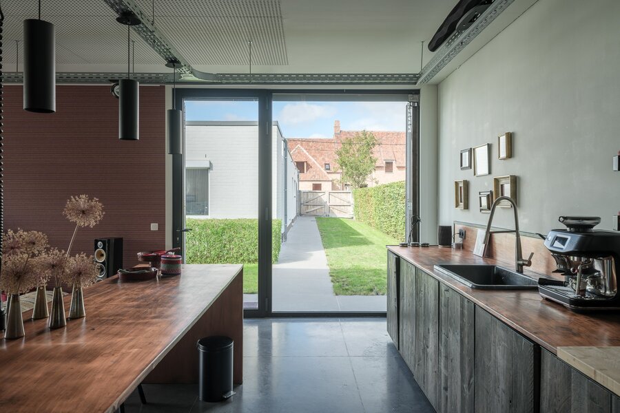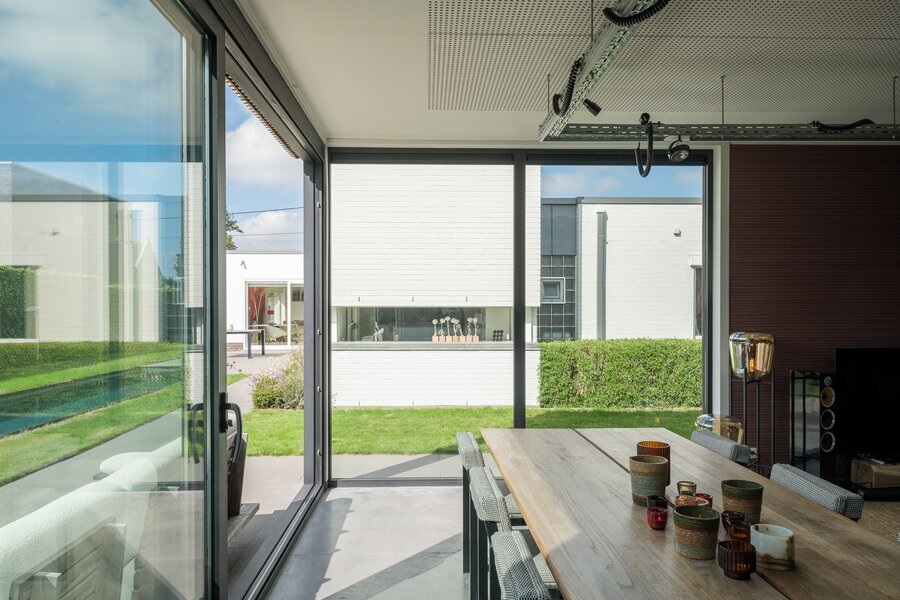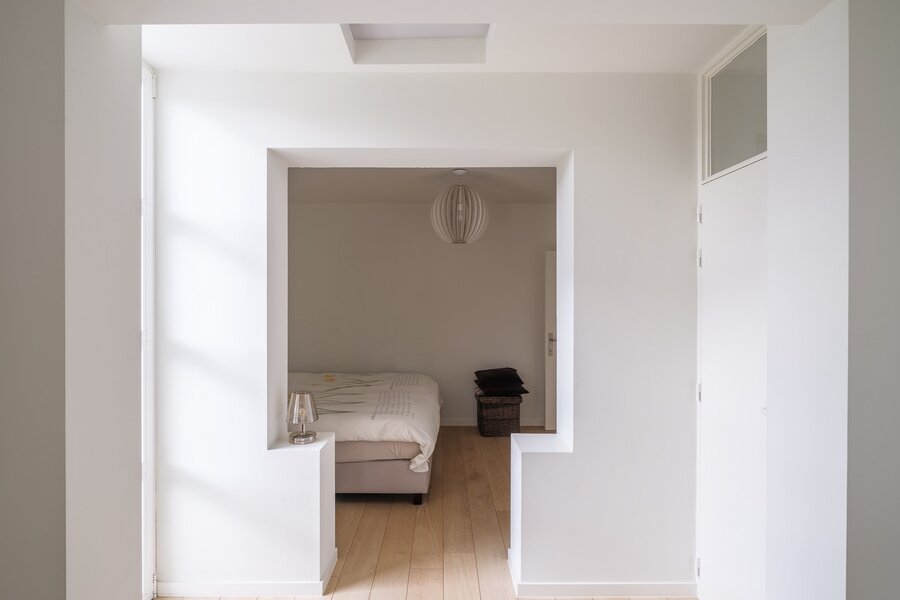 À l'intérieur, vous êtes accueilli dans un hall d'entrée avec toilettes pour invités. Le salon lumineux et ouvert, avec son poêle à bois encastré, crée une atmosphère chaleureuse et conviviale, tandis que les grandes baies vitrées offrent une vue magnifique sur l'extérieur. À côté se trouve la cuisine entièrement équipée, dotée d'appareils électroménagers de qualité et de tout le confort moderne. Dans l'autre aile de la maison se trouve la chambre principale avec sa propre salle de douche.