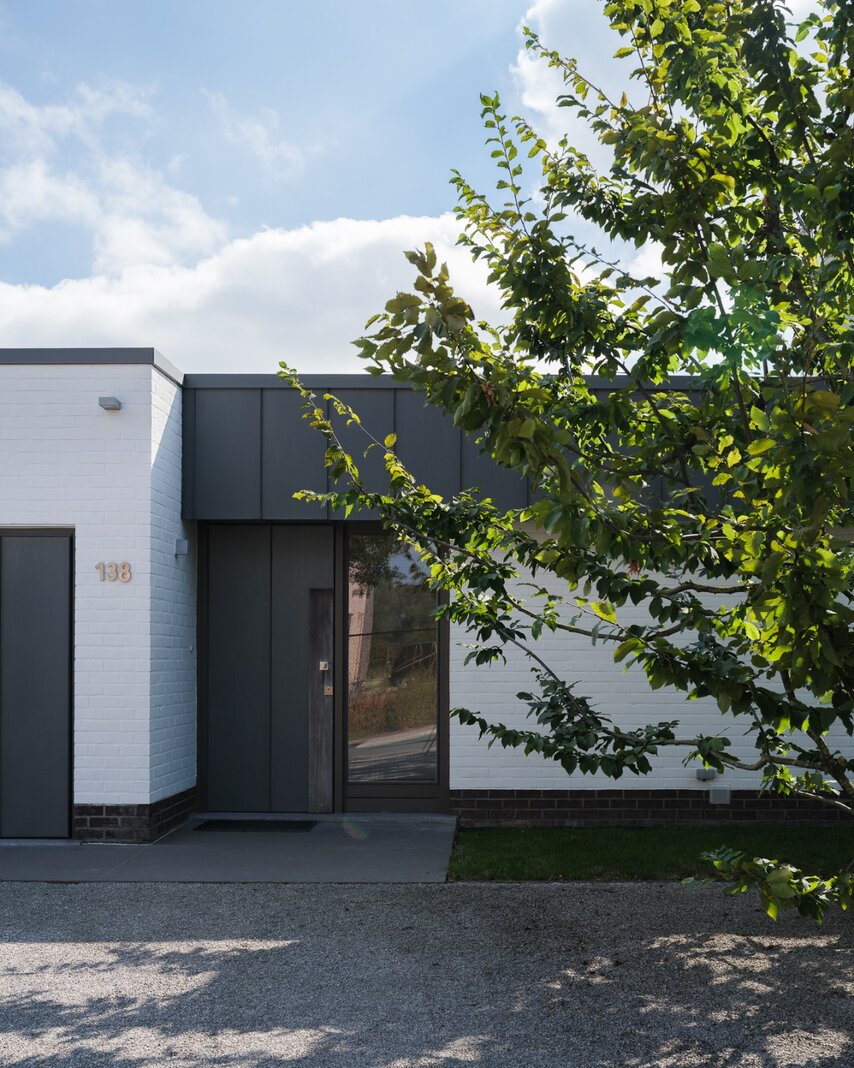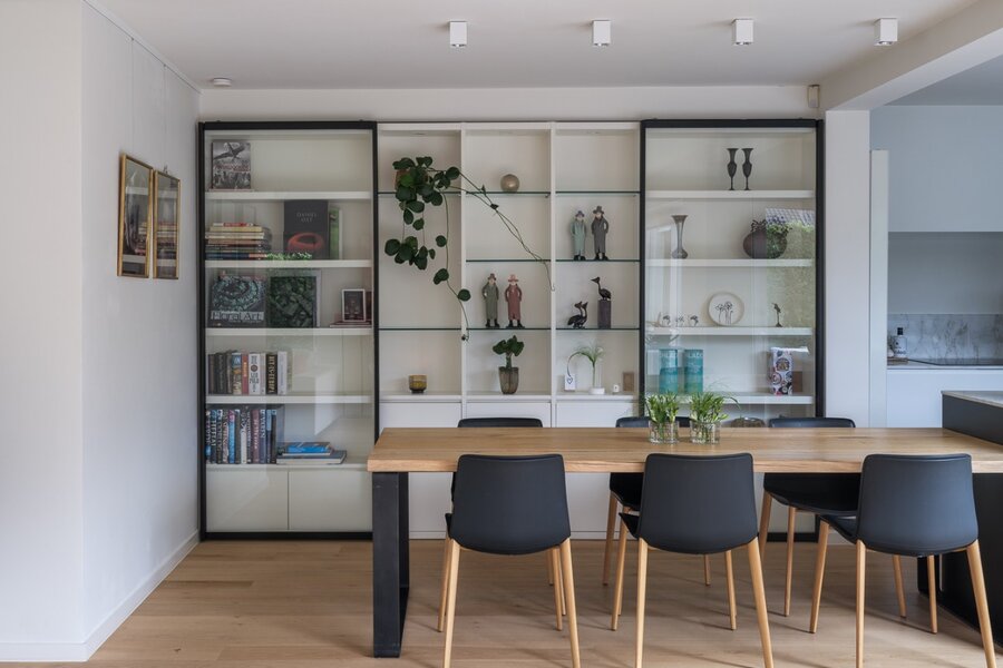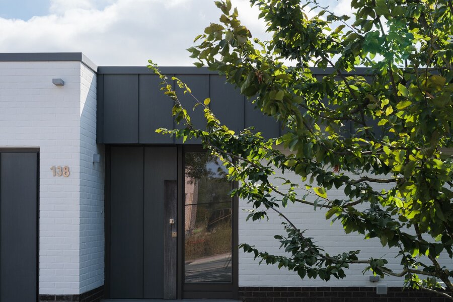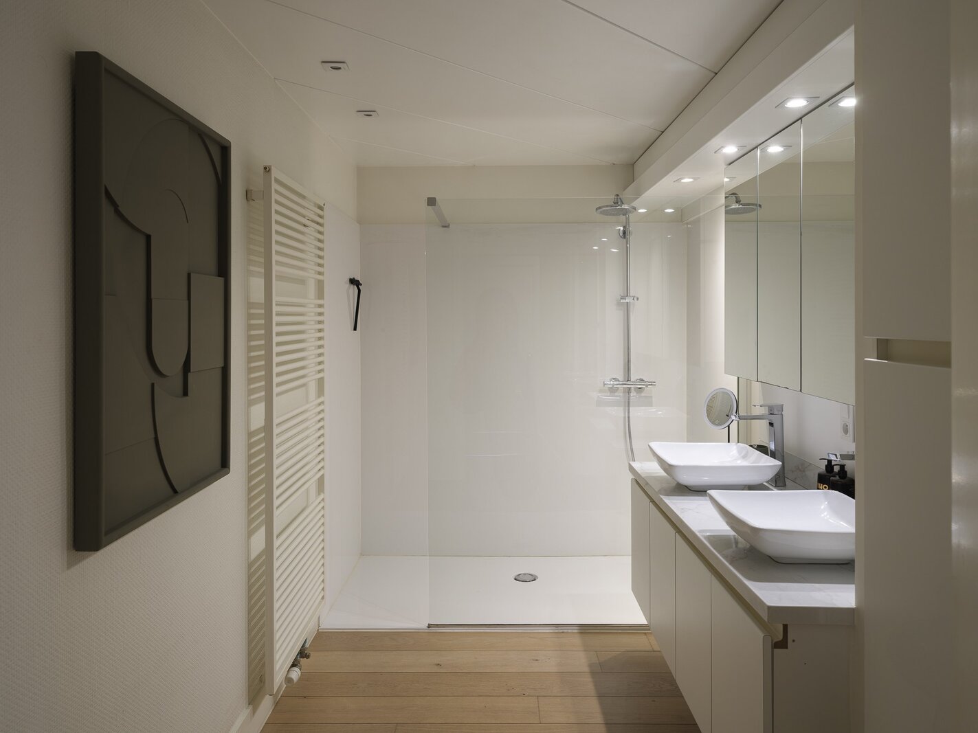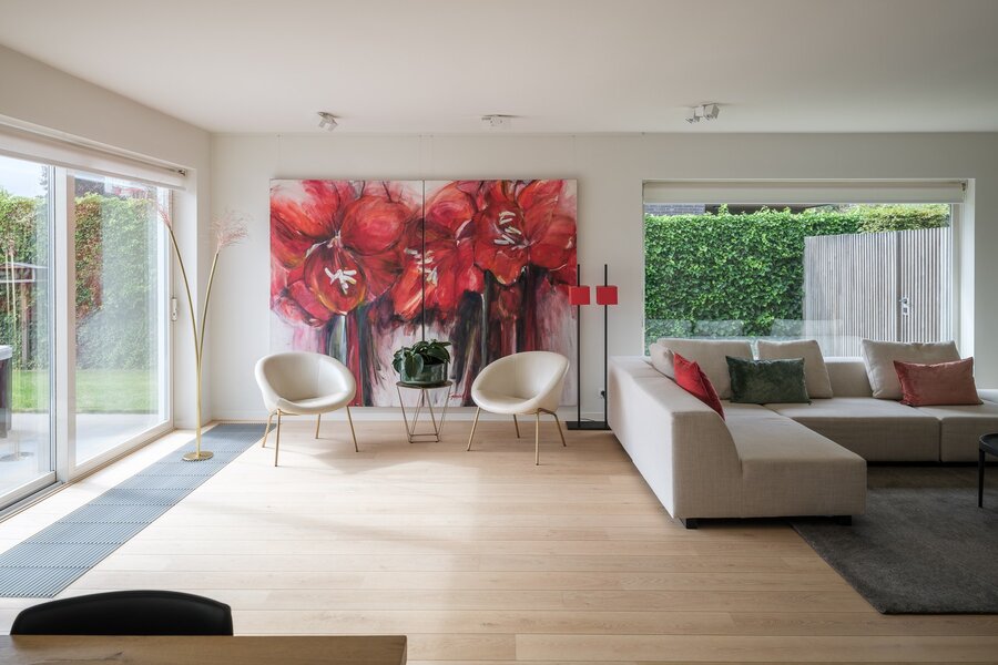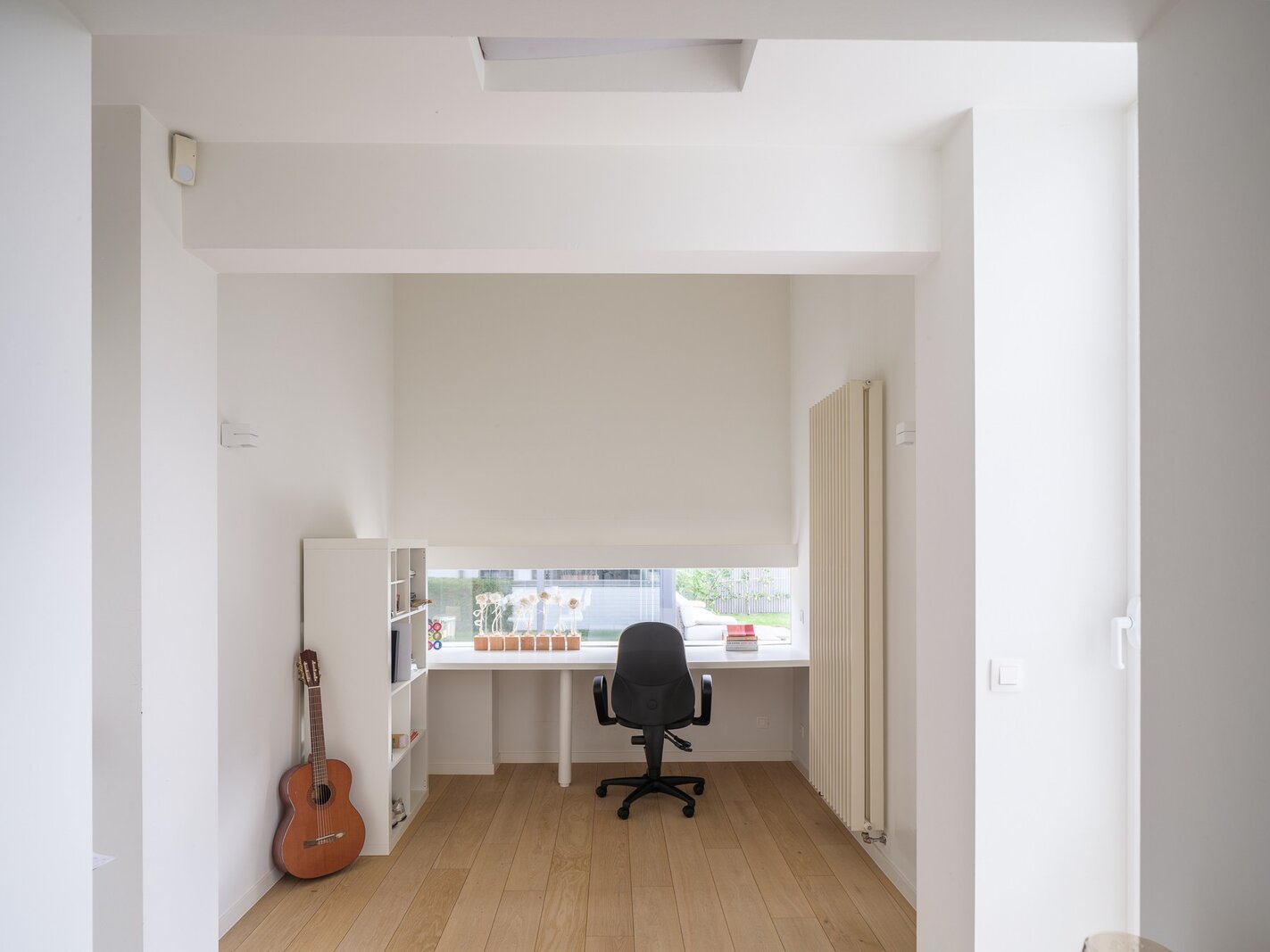À l'intérieur, vous êtes accueilli dans un hall d'entrée avec toilettes pour invités. Le salon lumineux et ouvert, avec son poêle à bois encastré, crée une atmosphère chaleureuse et conviviale, tandis que les grandes baies vitrées offrent une vue magnifique sur l'extérieur. À côté se trouve la cuisine entièrement équipée, dotée d'appareils électroménagers de qualité et de tout le confort moderne. Dans l'autre aile de la maison se trouve la chambre principale avec sa propre salle de douche.