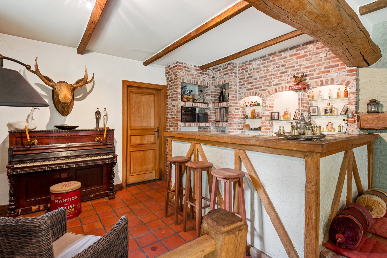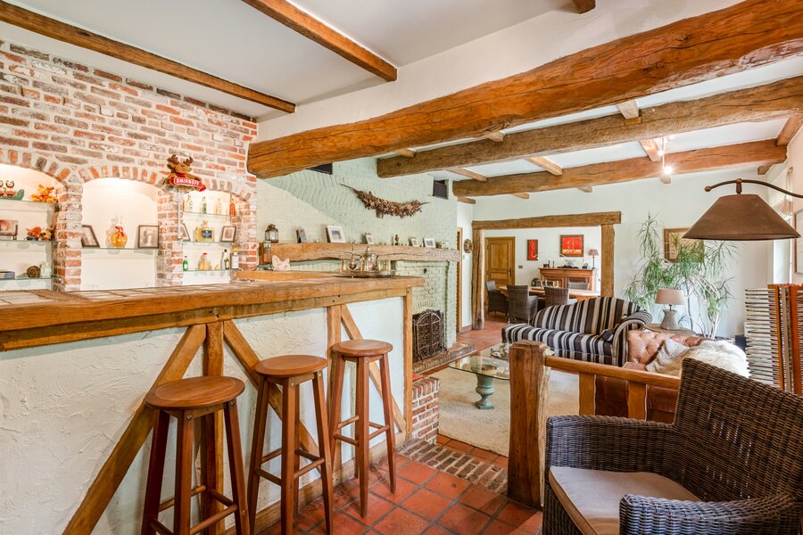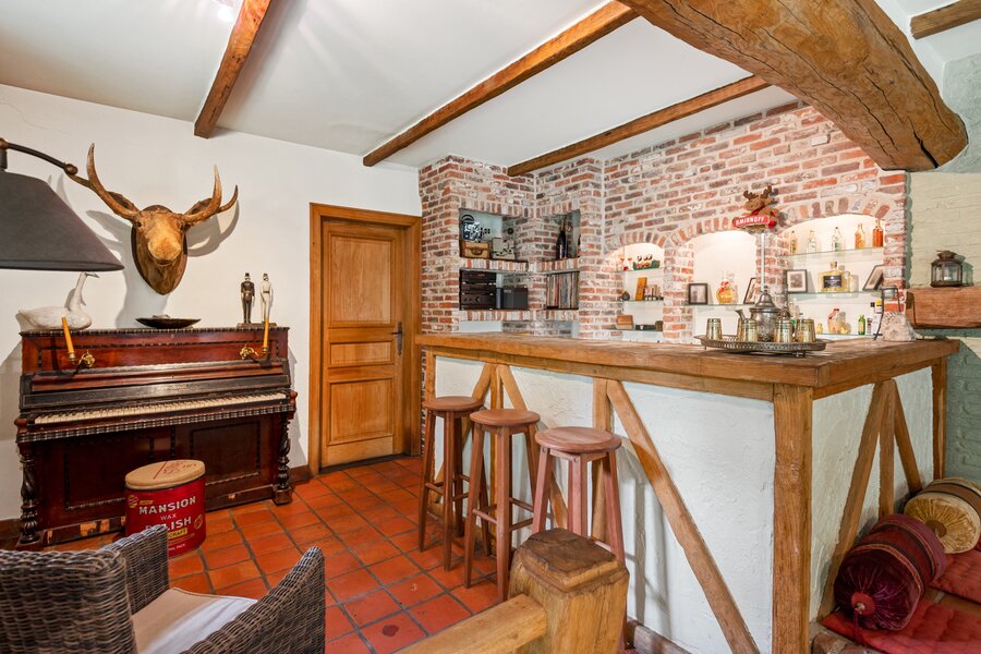 De leefruimte is ingedeeld in een salon met O.H. en bar, een eetkamer met open wijnkelder en een veranda met zicht op de tuin.