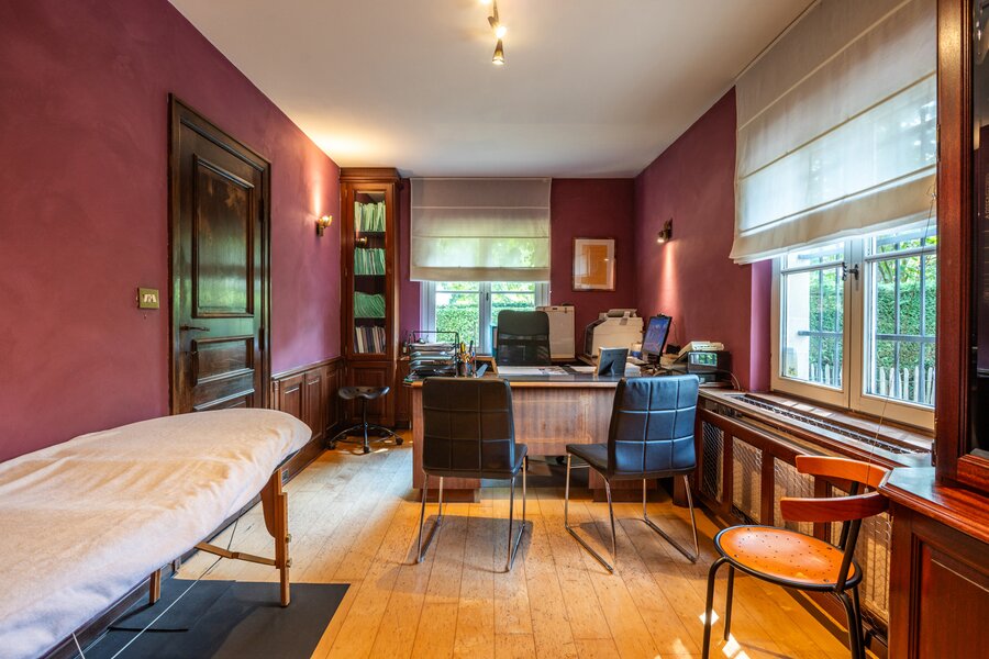 De praktijkruimte/bureau is zowel via de inkomhal als de leefruimte bereikbaar. Deze woning combineert wonen en werken op een doordachte manier waardoor professioneel gebruik perfect kan samengaan met het privéleven, zonder in te boeten aan privacy.