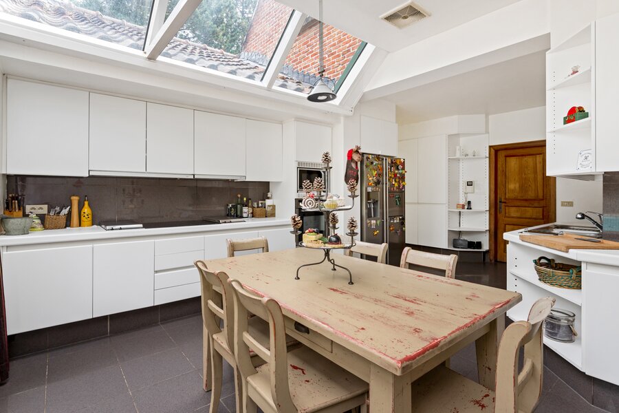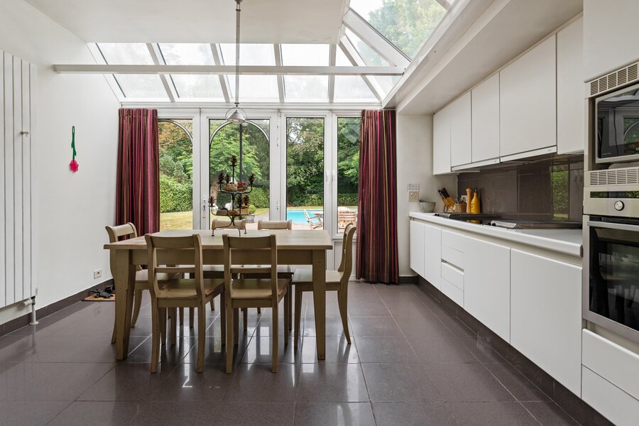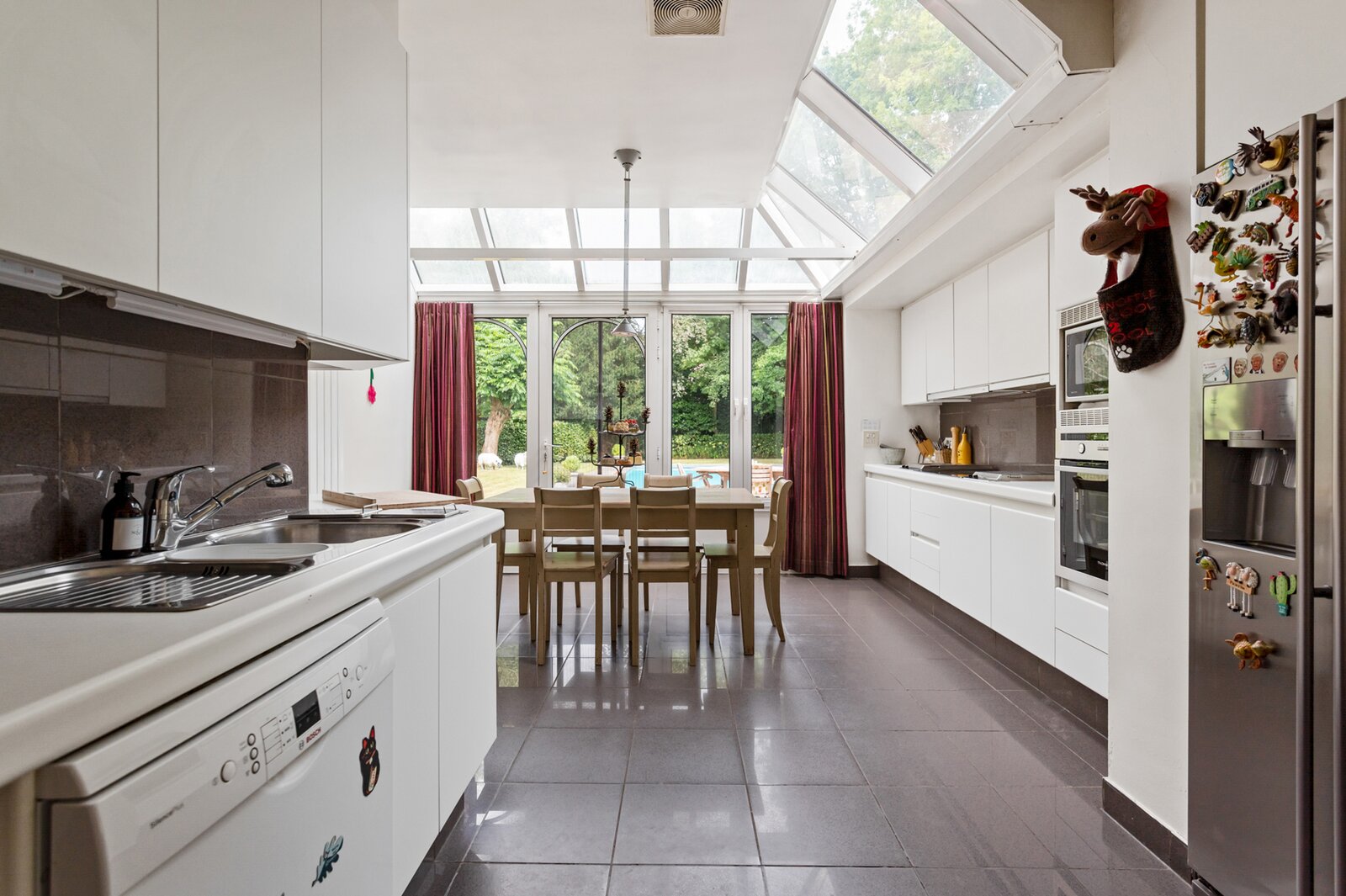Vanuit de eetkamer is er toegang tot de leefkeuken met een aparte koele berging/wasplaats. De keuken is uitgerust met een aanrecht voorzien van kookvuur, ingebouwde grill en friteuse, dubbele dampkap, oven, microgolfoven, Am. koelkast en een tweede aanrecht met dubbele spoelbak en vaatwasmachine. De eethoek geniet veel natuurlijke lichtinval en biedt zicht en toegang tot het terras en de tuin.