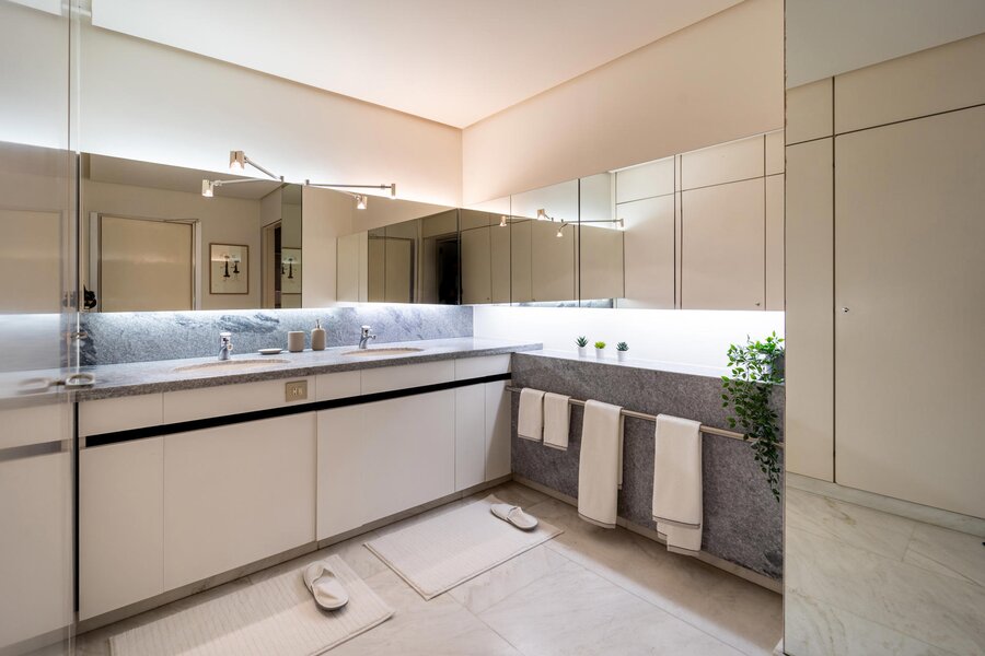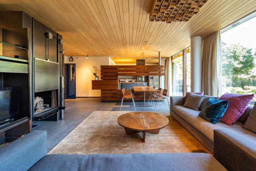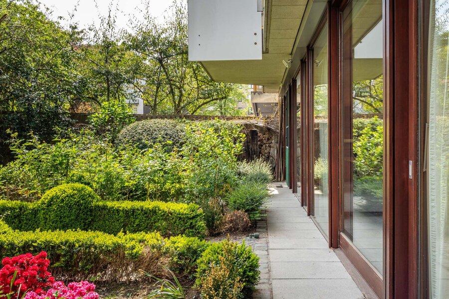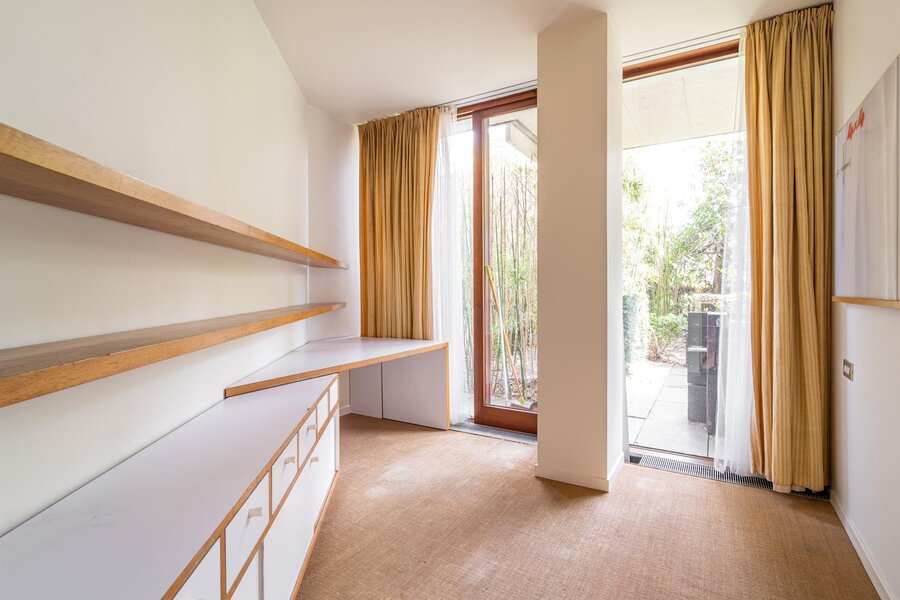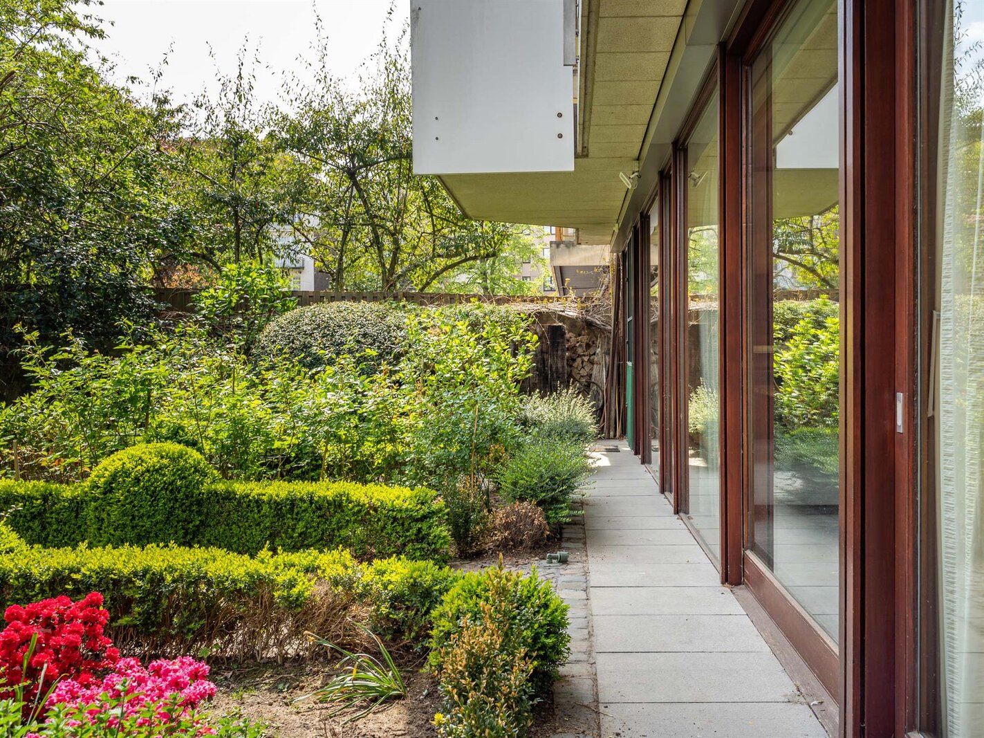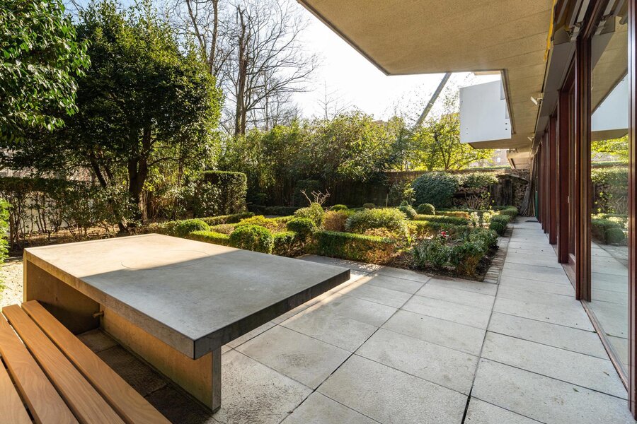 L’appartement traversant situé au rez de chaussée, entièrement aménagé par l’architecte d’intérieur Christophe Gevers s’ouvre sur un hall d’entrée avec vestiaire et toilette invités et mène à l’espace de vie agrémenté d’une cheminée et baigné de lumière grâce aux larges baies vitrées donnant accès au jardin situé face aux Étangs d’Ixelles. Il est caractérisé par son plafond en chêne et ses éléments intégrés en inox et prolongé par une cuisine équipée et une buanderie. Le couloir de nuit mène à la chambre principale avec accès au jardin, espace bureau, dressing et salle de bain privative et deux autres chambres avec accès au jardin, dressing et salle de bain privative. Ascenseur de service avec un accès direct dans l’appartement.