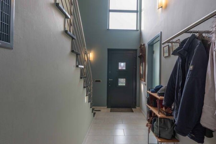 - Inkomhal met ruimte voor vestiaire. Toegang tot de diverse ruimtes. Trap naar 1ste verdieping.
