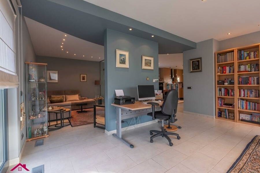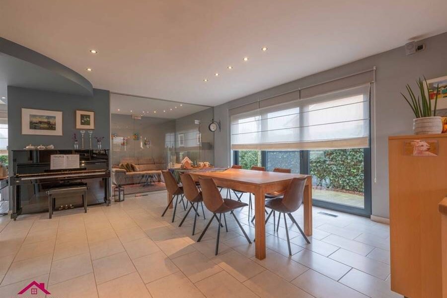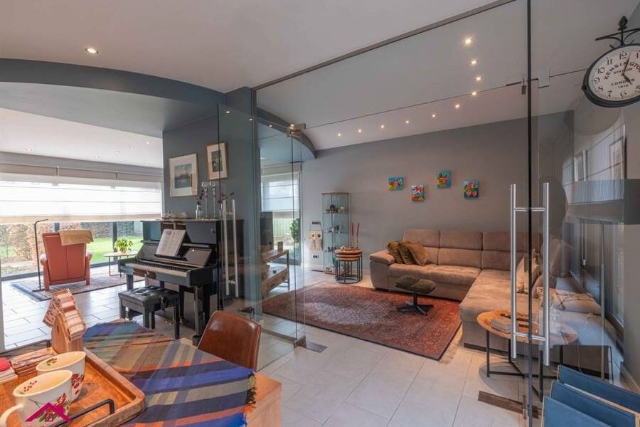 - Gezellige leefruimte, opgedeeld in een zitkamer, een tv hoek en een eetkamer, en met toegang tot de open keuken. De tv hoek werd van de eetkamer afgescheiden door middel van een glazen wand. Veel lichtinval dankzij de vele en grote raampartijen.