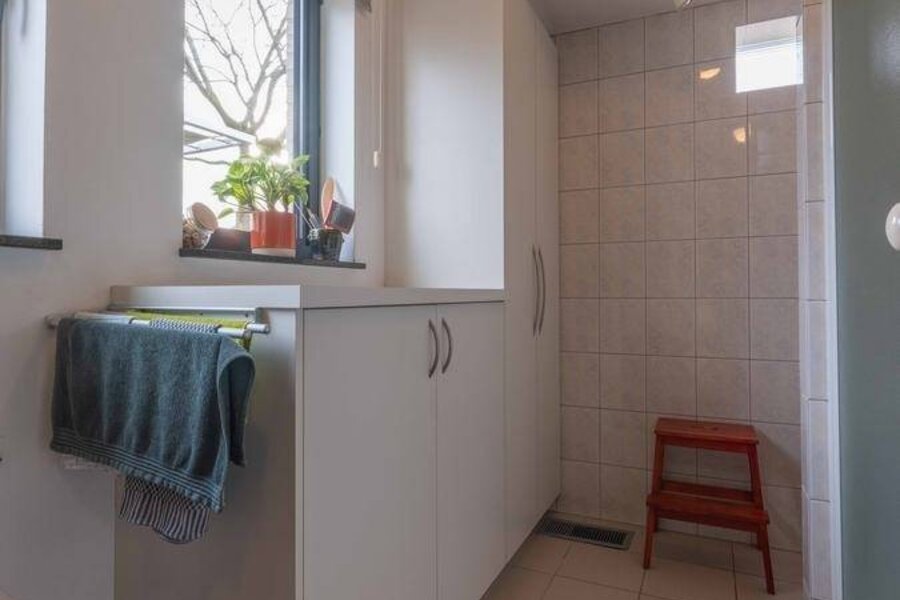 - Berging/wasplaats met aansluiting voor wasmachine. Hier bevindt zich tevens een douche en een herentoilet. Deels voorzien van wandtegels tot plafondhoogte. Ingericht met op maat gemaakte kasten. Uitgietbak met warm en koud water. Toegang tot de kelderverdieping en de tuin.