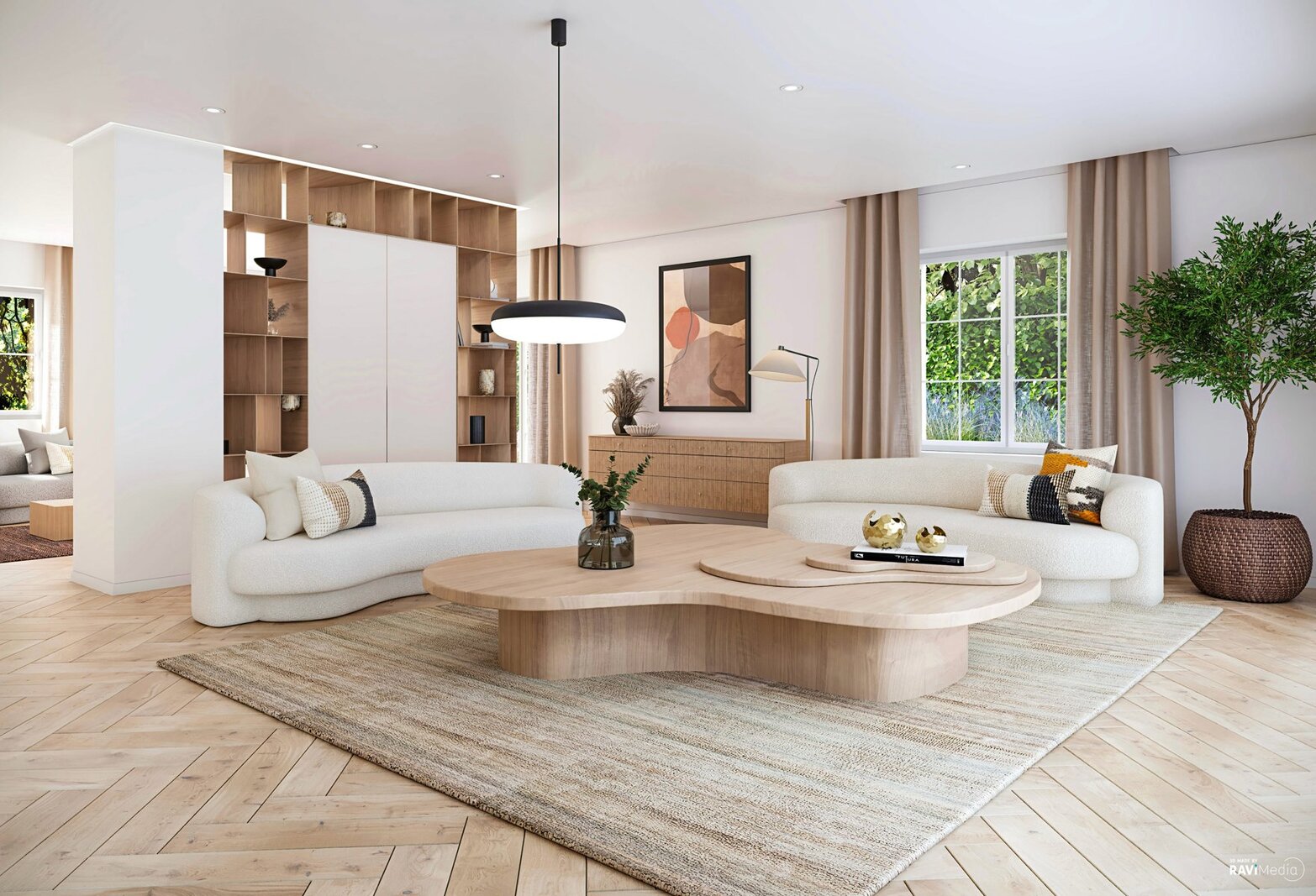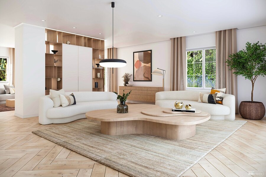 - Séjour ultra-lumineux de plus de 60 m², donnant sur la terrasse extérieur et le jardin orienté plein sud