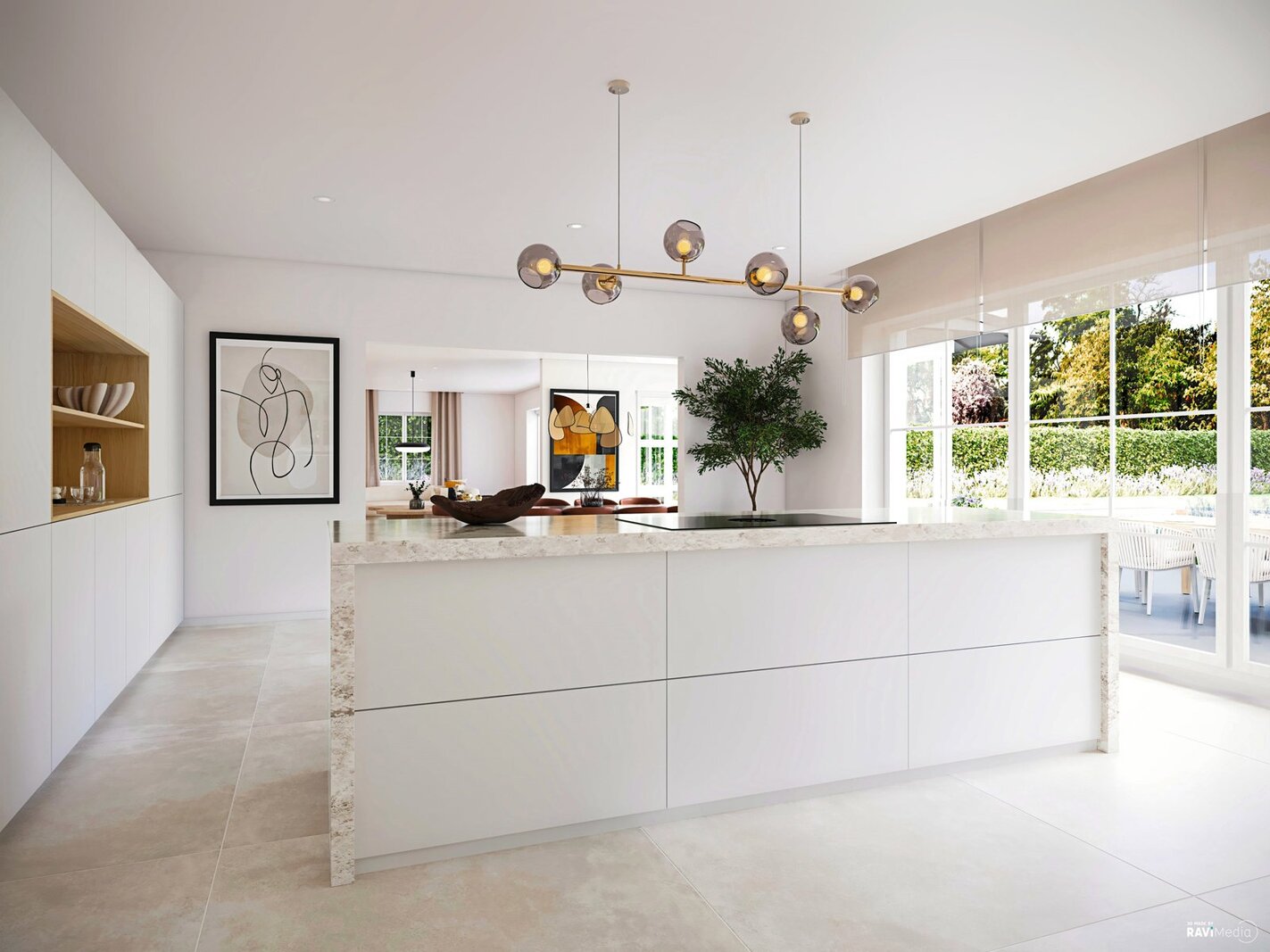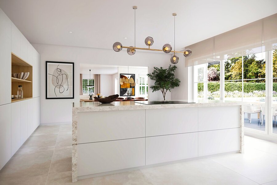 - Cuisine ouverte avec îlot central, prolongée par une vaste salle à manger