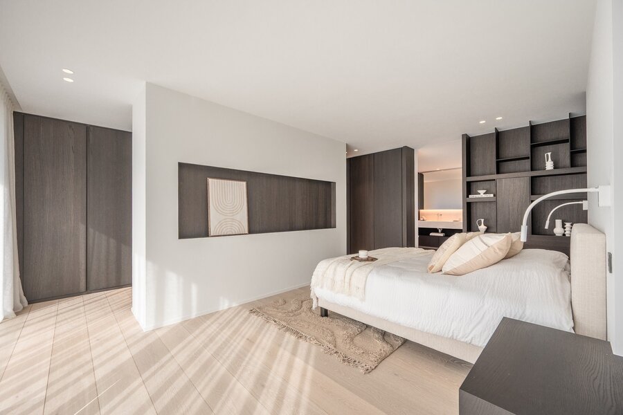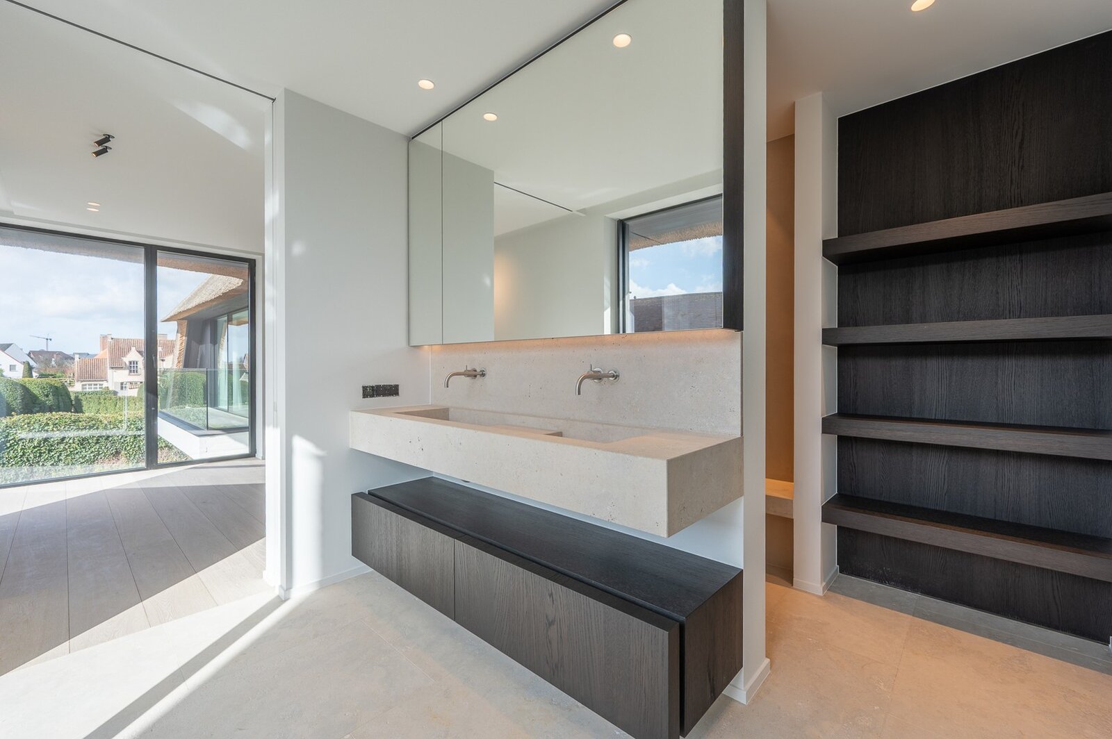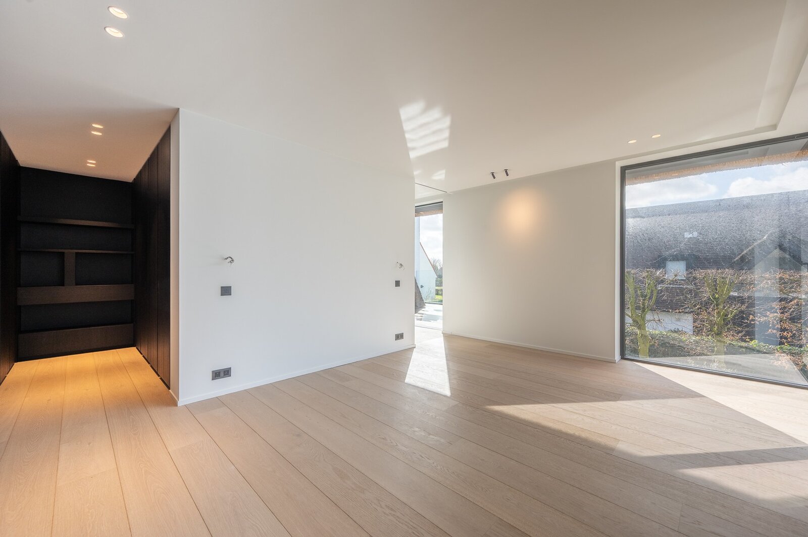 Magnifique villa neuve et individuelle, finition haut de gamme, située dans un quartier résidentiel calme de villas avec une orientation idéale. Magnifique terrain orienté plein sud de 990 m², équipé d’une piscine chauffée. Compositon: hall d’entrée spacieux avec placards encastrés et toilettes invités. Ascenseur du -1 au +1. Grâce aux grandes baies vitrées, les espaces de vie bénéficient d’une lumière naturelle abondante et d’une vue splendide sur le jardin avec piscine. Le séjour chaleureux est agrémenté d’un foyer au gaz, et mène à un bureau séparé avec rangements sur mesure. Cuisine spacieuse avec coin repas, égallement équipée d'un feu au gaz et est aménagée aves des appareils électroménagers de qualité de marque Miele (refroidisseur à vin, four, four combiné micro-ondes, lave-vaisselle, frigo/congélateur américain Liebherr). Les grandes portes coulissantes donnent accès à une terrasse couverte avec barbecue. Buanderie attenante. 1er étage : hall de nuit avec débarras, 3 chambres complètes, chacune avec dressing et salle de bain attenante (lavabo, douche, toilettes et baignoire) finies avec grand luxe.2e étage : quatrième et cinquième chambre avec placards encastrés et une salle de douche. Espace de rangement supplémentaire. Garage pour deux voitures et une voiturette de golf, parking extérieur. Cave avec plusieurs pièces dont local technique, possibilité de cave à vin, rangement, ... Architecture : Luc De Beir, décoration intérieure : Brian Chielens, jardin : Dominik Eeman. Arrosage automatique, éclairage de jardin, caméras, robinetterie Vola, piscine (pompe à chaleur), ascenseur, géothermie.