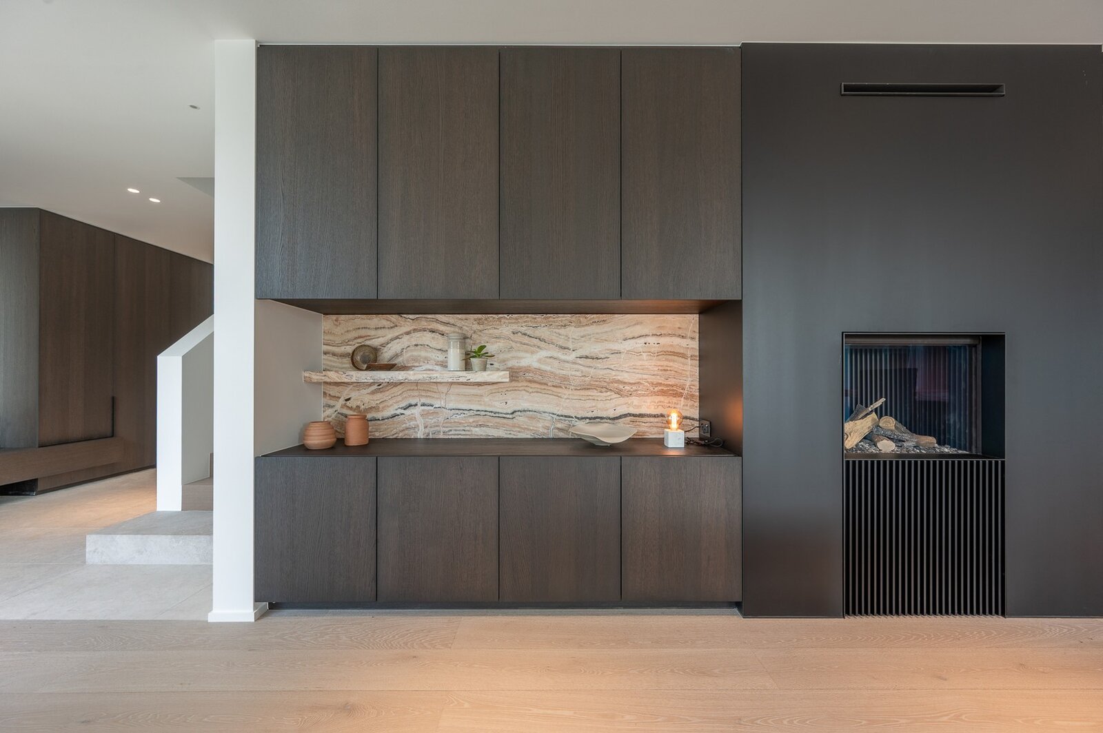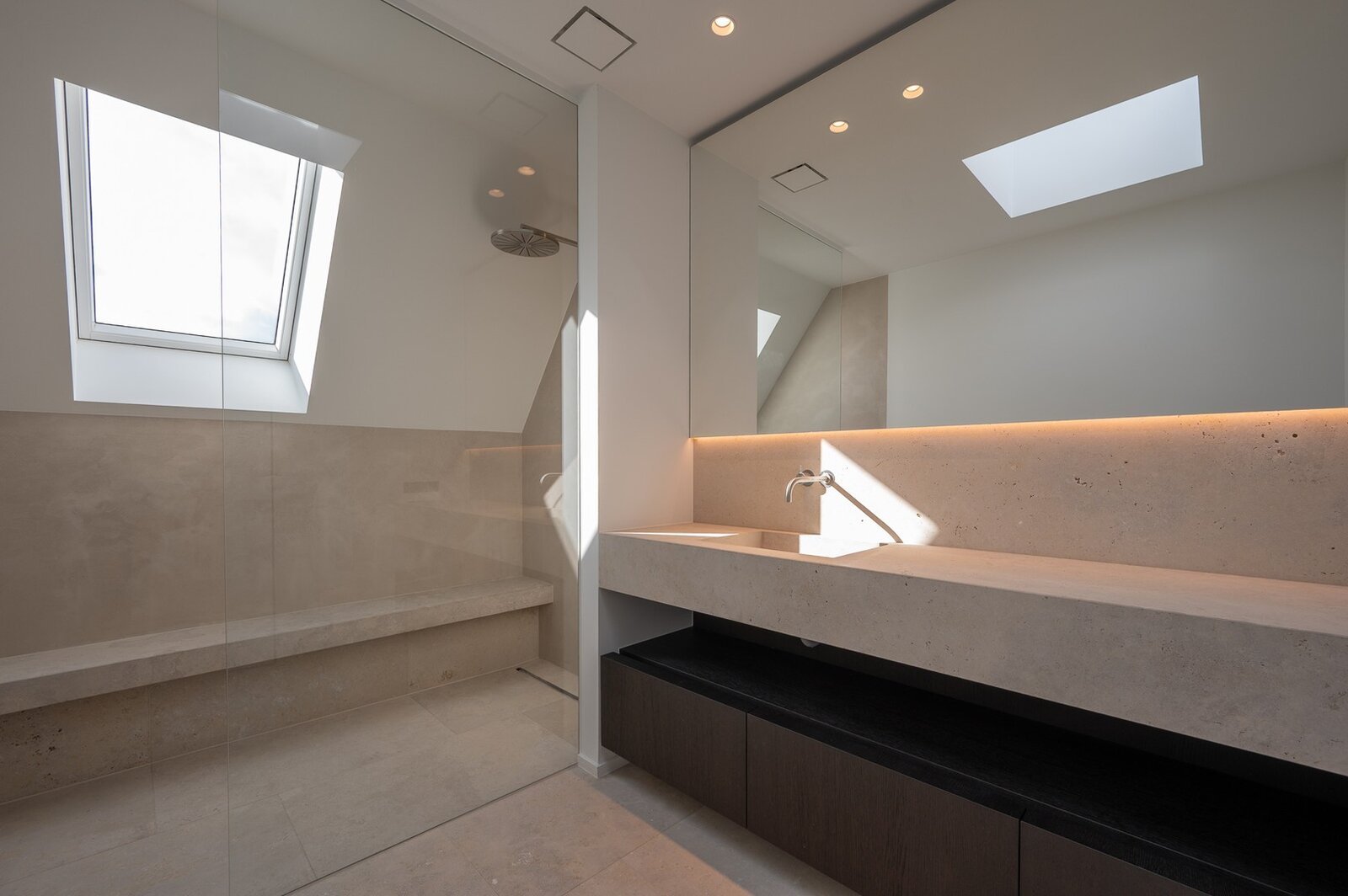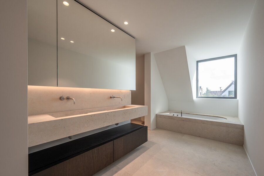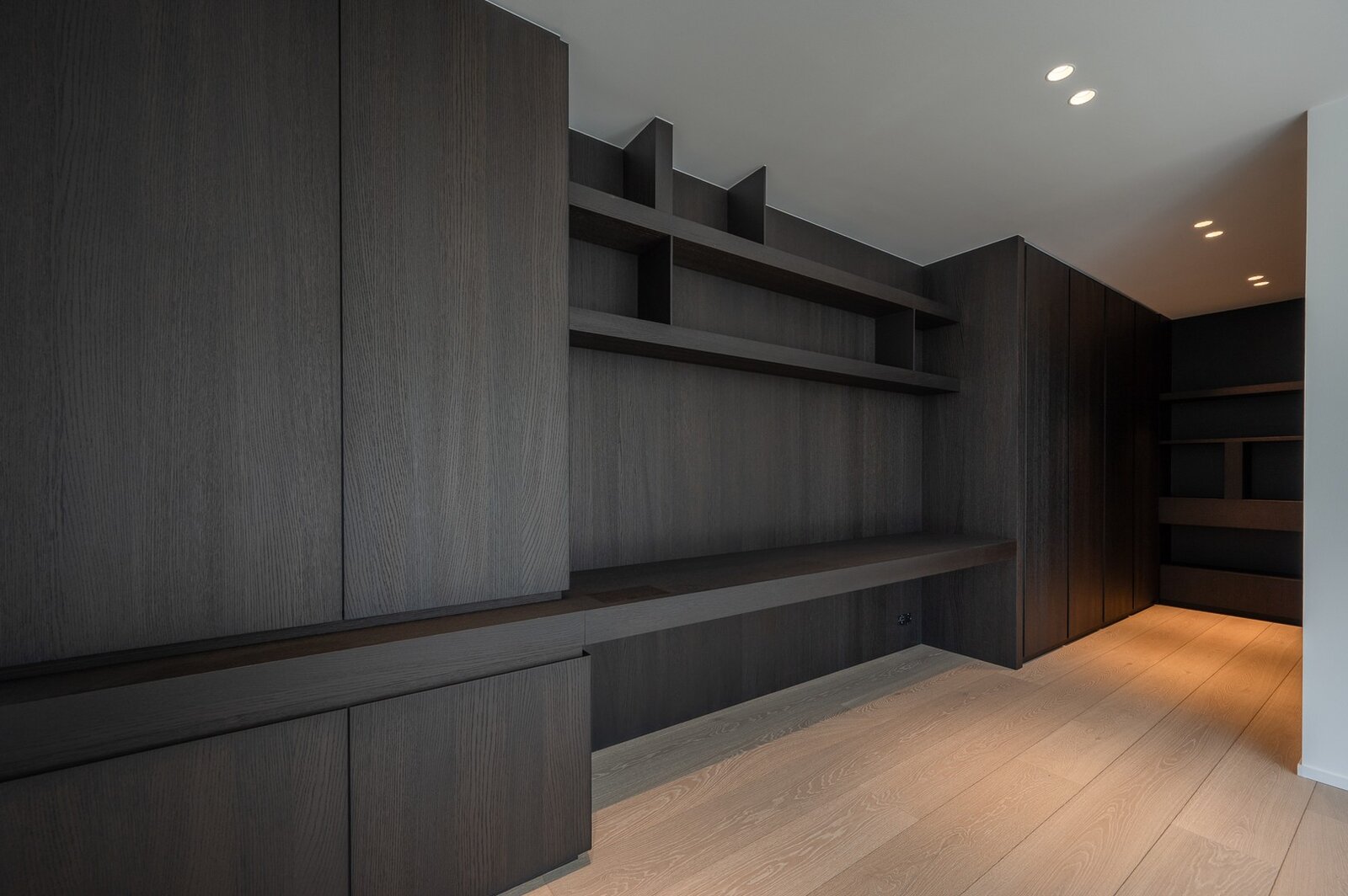 Magnifique villa neuve et individuelle, finition haut de gamme, située dans un quartier résidentiel calme de villas avec une orientation idéale. Magnifique terrain orienté plein sud de 990 m², équipé d’une piscine chauffée. Compositon: hall d’entrée spacieux avec placards encastrés et toilettes invités. Ascenseur du -1 au +1. Grâce aux grandes baies vitrées, les espaces de vie bénéficient d’une lumière naturelle abondante et d’une vue splendide sur le jardin avec piscine. Le séjour chaleureux est agrémenté d’un foyer au gaz, et mène à un bureau séparé avec rangements sur mesure. Cuisine spacieuse avec coin repas, égallement équipée d'un feu au gaz et est aménagée aves des appareils électroménagers de qualité de marque Miele (refroidisseur à vin, four, four combiné micro-ondes, lave-vaisselle, frigo/congélateur américain Liebherr). Les grandes portes coulissantes donnent accès à une terrasse couverte avec barbecue. Buanderie attenante. 1er étage : hall de nuit avec débarras, 3 chambres complètes, chacune avec dressing et salle de bain attenante (lavabo, douche, toilettes et baignoire) finies avec grand luxe.2e étage : quatrième et cinquième chambre avec placards encastrés et une salle de douche. Espace de rangement supplémentaire. Garage pour deux voitures et une voiturette de golf, parking extérieur. Cave avec plusieurs pièces dont local technique, possibilité de cave à vin, rangement, ... Architecture : Luc De Beir, décoration intérieure : Brian Chielens, jardin : Dominik Eeman. Arrosage automatique, éclairage de jardin, caméras, robinetterie Vola, piscine (pompe à chaleur), ascenseur, géothermie.