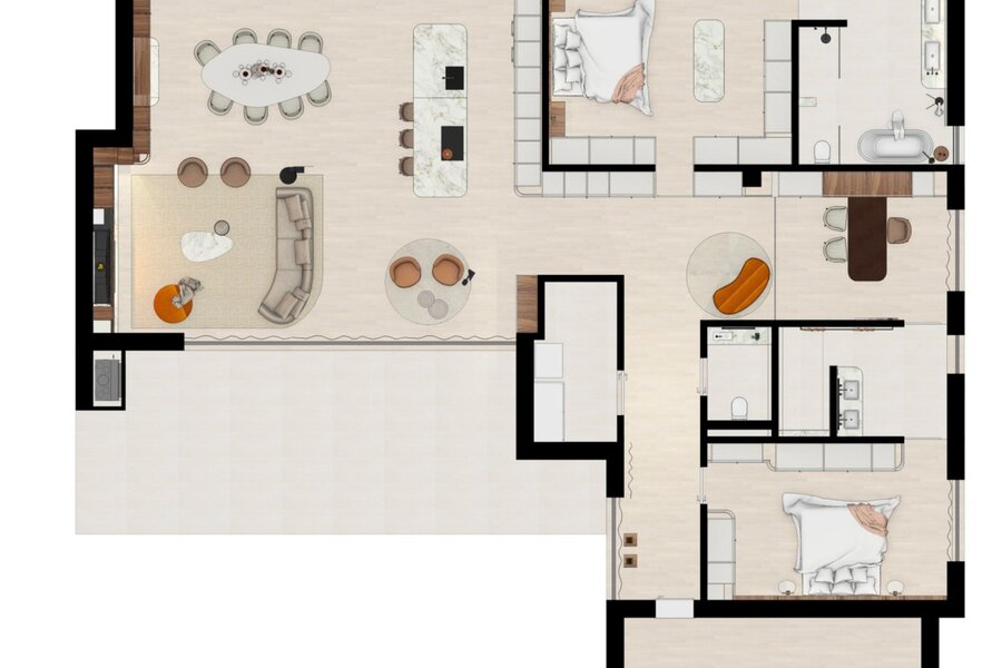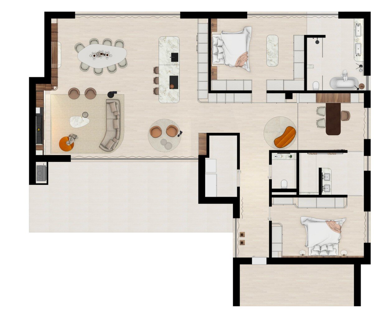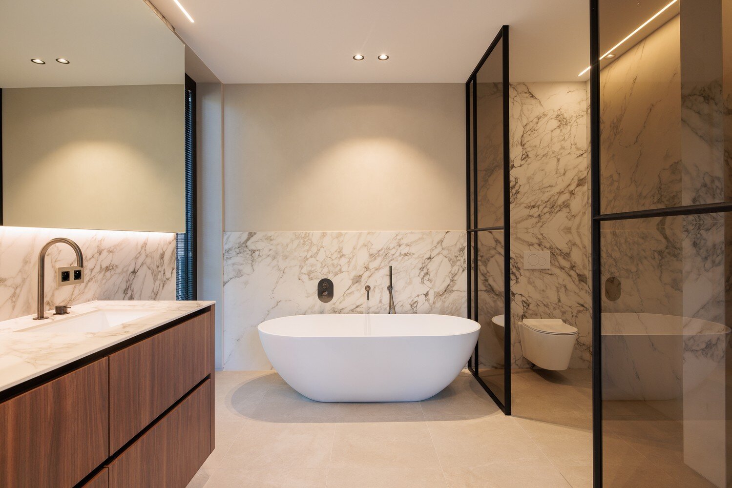 Het penthouse beschikt over een masterbedroom met ensuite badkamer (ligbad, inloopdouche, dubbele lavabo en toilet), een 2e slaapkamer met eigen badkamer, een apart gastentoilet en een prachtig thuisbureau dat eventueel als derde slaapkamer kan worden ingericht en een praktische berging.