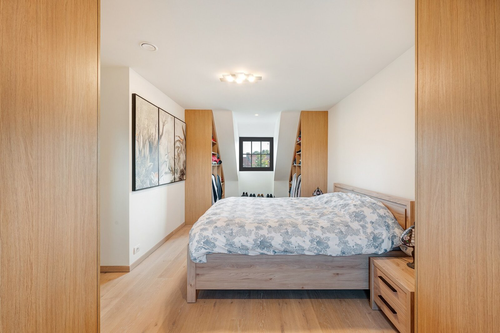 Premier étage : trois chambres entièrement aménagées. La chambre principale dispose de sa propre salle de bains avec baignoire. Les deux autres chambres se partagent une élégante salle de bains traversante avec douche à l’italienne. À cet étage se trouve également un espace de rangement pratique.