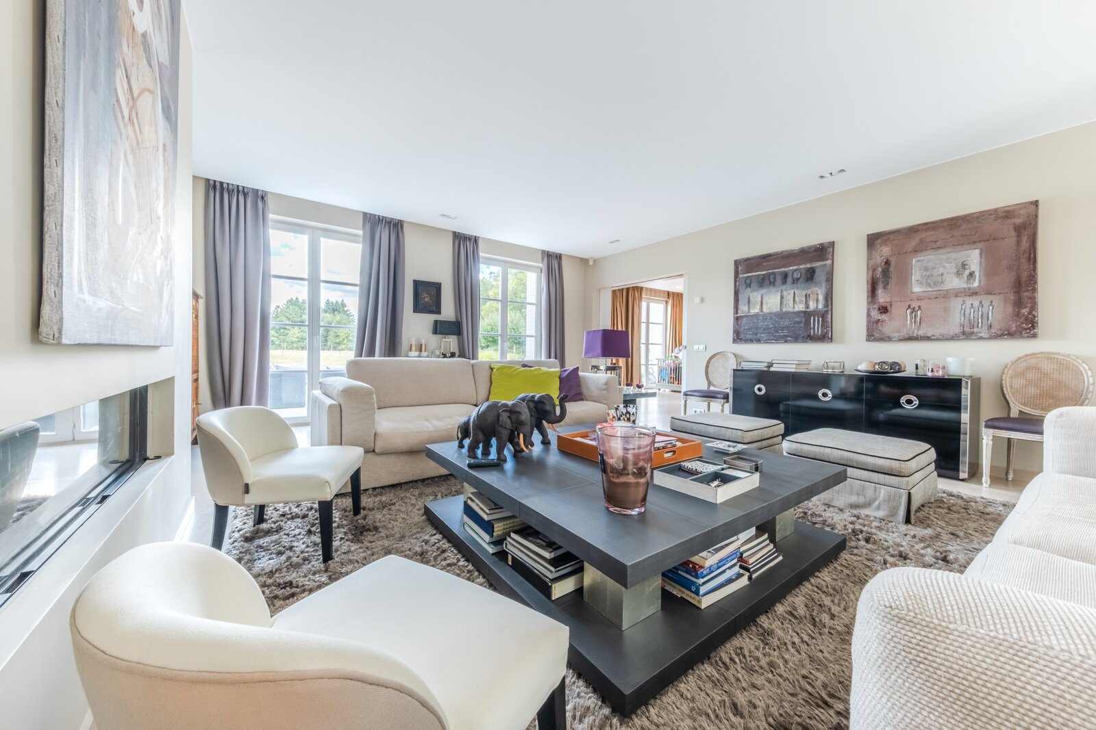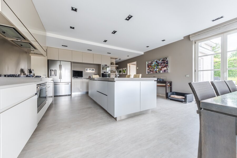 Au rez-de-chaussée du corps de logis principal, le spacieux hall d’entrée, agrémenté de toilettes invités et d’un grand vestiaire, vous mène aux vastes réceptions comprenant un élégant salon principal avec insert au gaz, un salon plus intime ou salon TV avec feu ouvert, ainsi qu’une spacieuse salle à manger. La magnifique cuisine dinatoire, moderne et conviviale, s’ouvre sur une grande buanderie.