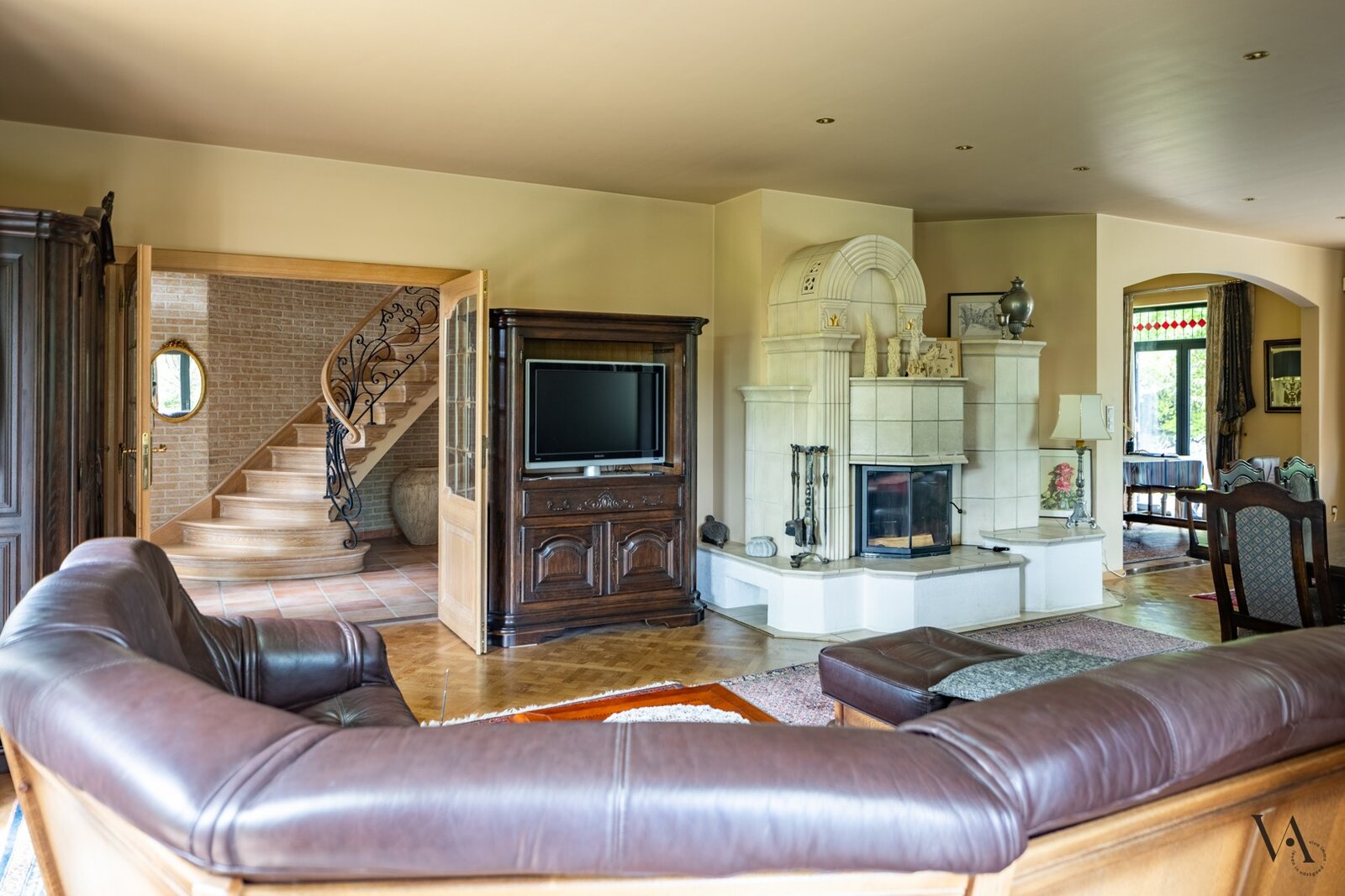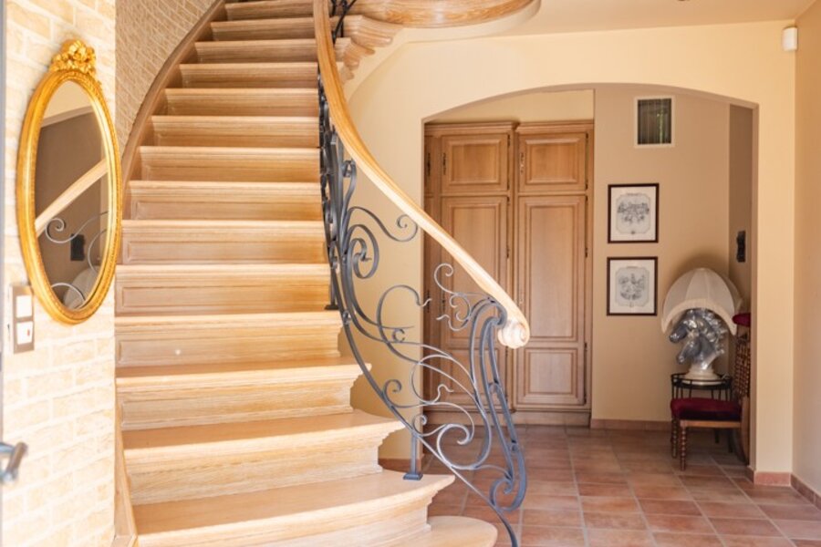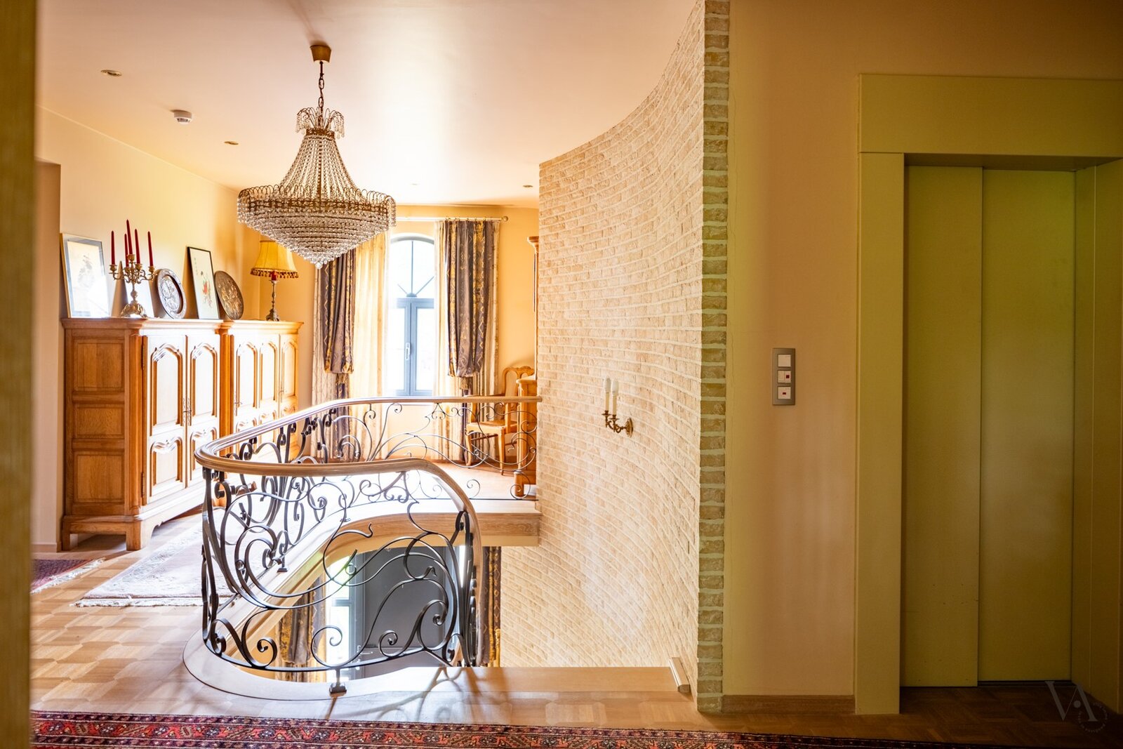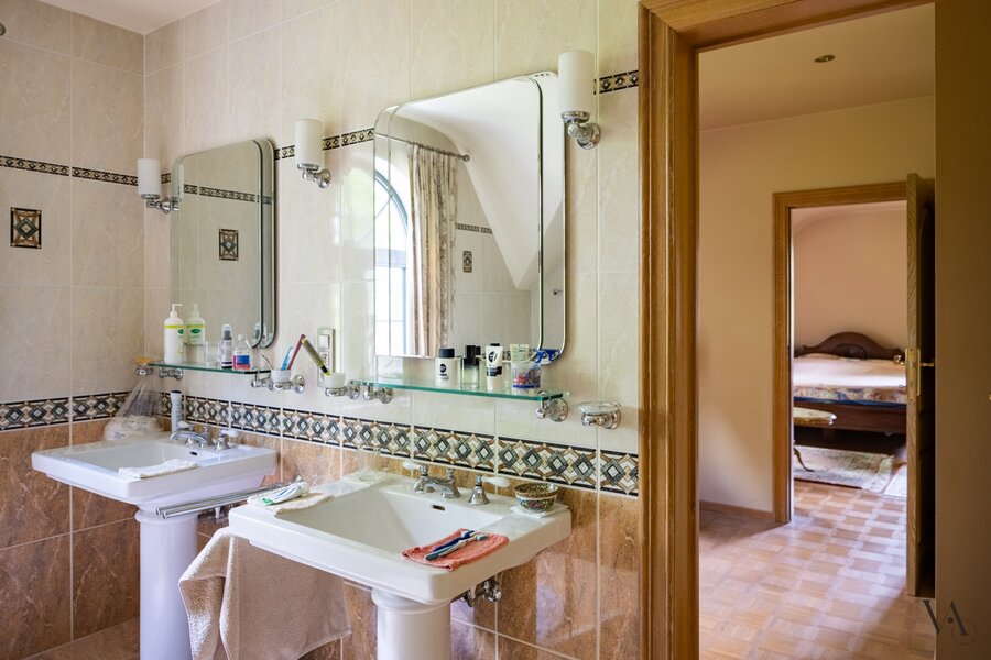 Op de gelijkvloerse verdieping werd bovendien een bureauruimte/slaapkamer voorzien met aansluitende badkamer. De knappe inkomhal biedt tevens een vestiaire en toegang tot een apart toilet.