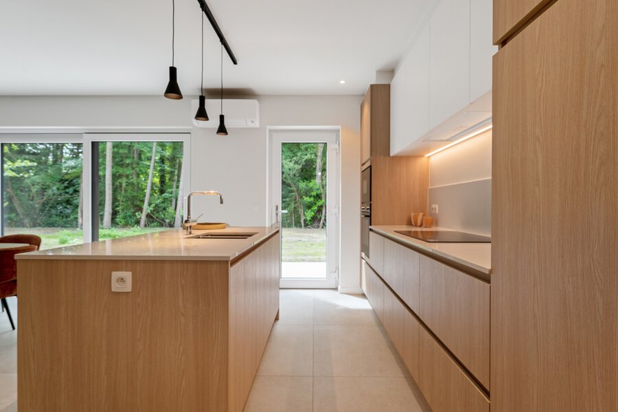 inkomhal met gastentoilet - leefruimte ingedeeld in een zithoek - eetkamer en open ingerichte keuken met eiland - aangrenzend toegang tot de berging/wasplaats en de inpandige garage