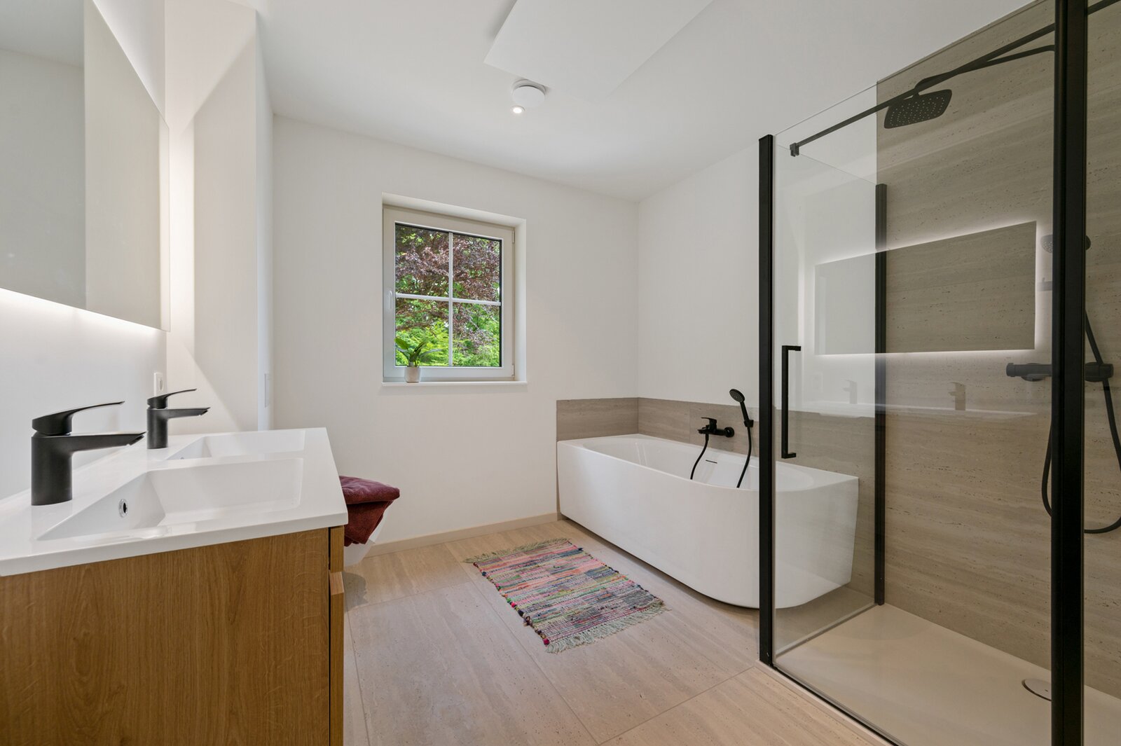 overloop met toegang tot 3 kamers - badkamer 1 uitgerust met dubbele lavabo - ligbad - inloopdouche en toilet