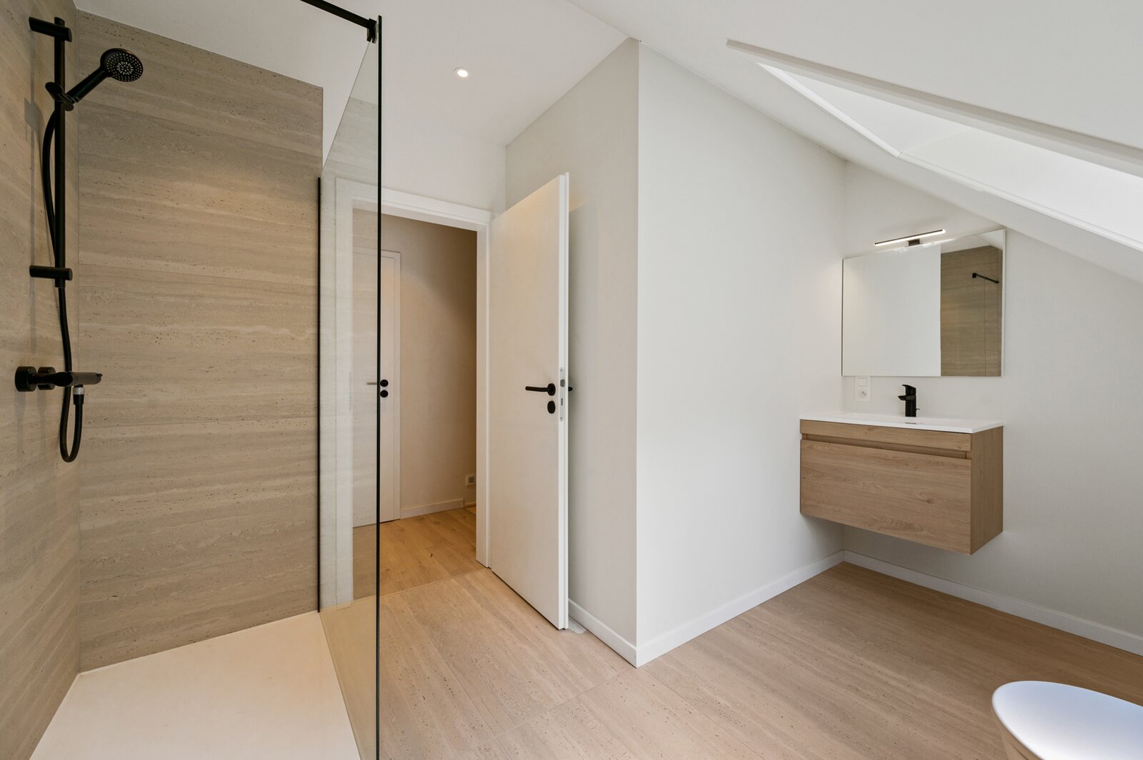 overloop met toegang tot 1 grote kamer - badkamer 2 uitgerust met lavabo - inloopdouche en toilet en een aparte berging.