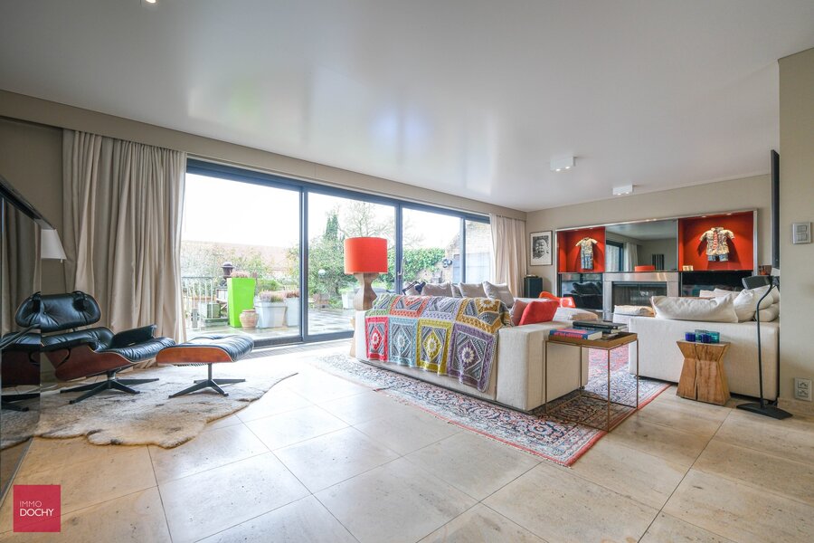 Eerste verdieping: Ruime living met open haard, eetruimte, afzonderlijk bureel of bibliotheek, prachtig ingerichte keuken met kookeiland en eetplaats, grote bijkeuken, zalig zonnig terras van ca 80m².