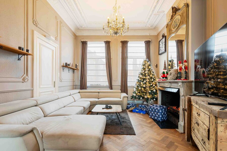 U betreedt de woning via een royale inkomhal die meteen de grandeur van het huis onthult. De lichtrijke leefruimte van ca. 38 m², uitgerust met een gezellige houthaard, vormt het hart van de woning. Aansluitend vindt u een volledig ingerichte keuken en een gastentoilet.