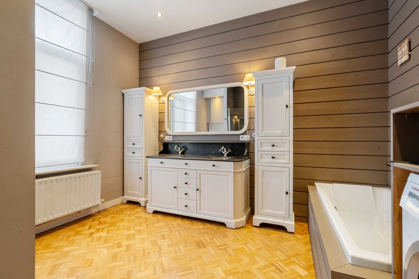 Hier geniet u ook van een volledig uitgeruste badkamer met ligbad, douche, toilet en dubbele wastafel