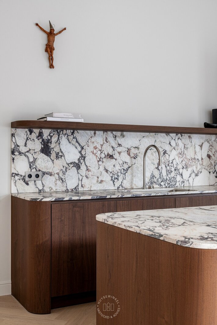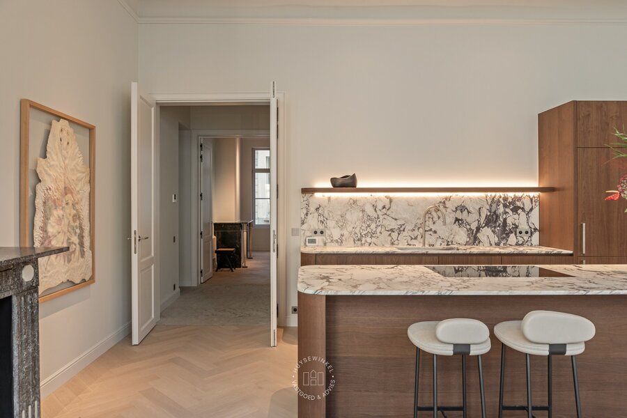 De keuken is naadloos geïntegreerd in de leefruimte en werd opgevat als een verfijnd architecturaal geheel. Strak maatwerk, hoogwaardige materialen en een doordachte indeling maken van deze keuken niet alleen een esthetisch statement, maar ook een uiterst functionele leefkeuken die perfect aansluit bij het high-end karakter van het appartement.