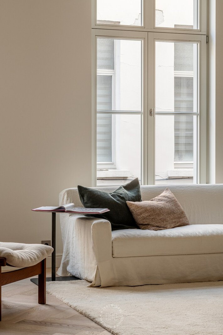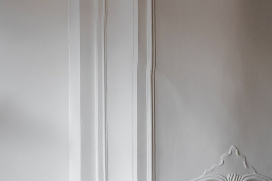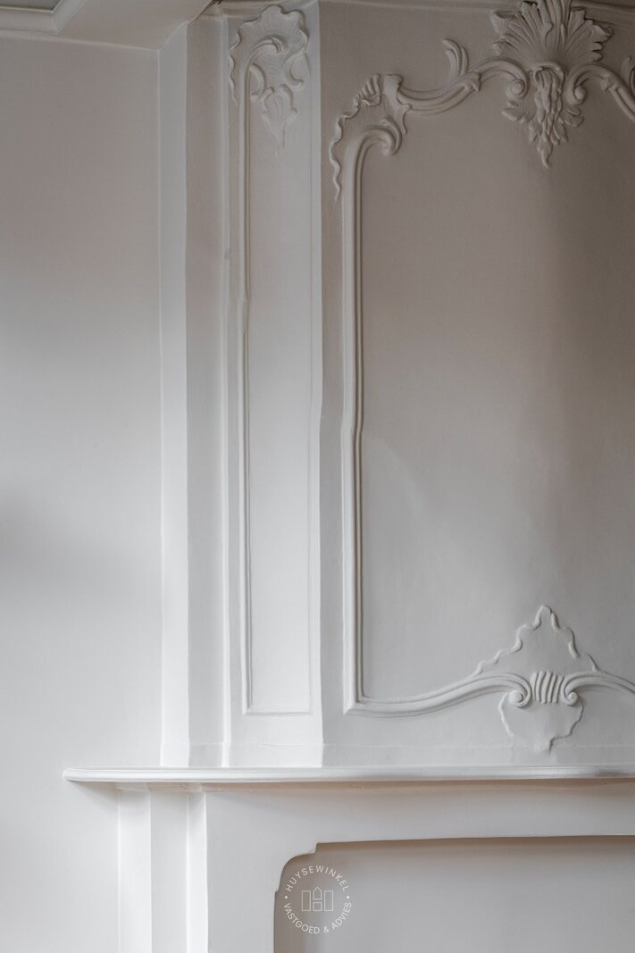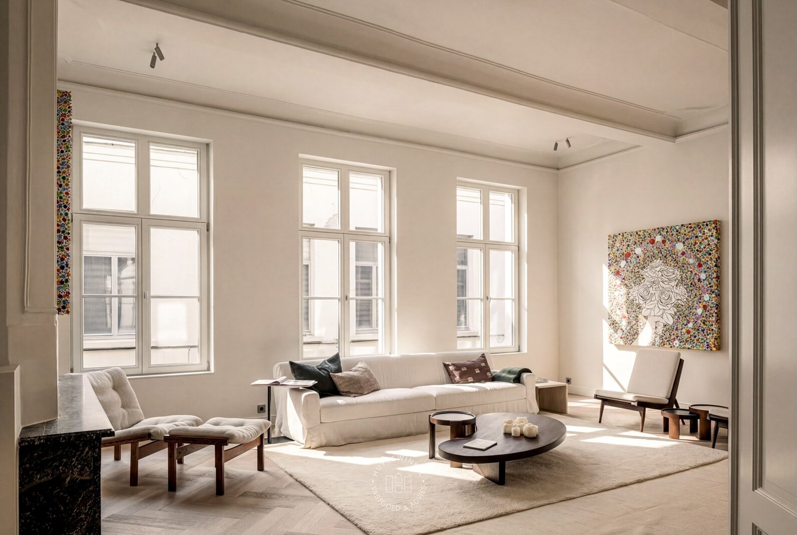 De ruime woonkamer, harmonieus geïntegreerd binnen het geheel, is perfect georiënteerd en ademt karakter. Net zoals in de rest van het appartement zorgen authentieke elementen zoals sierlijke schouwen en hoogwaardige parketvloeren voor een warme, tijdloze elegantie.