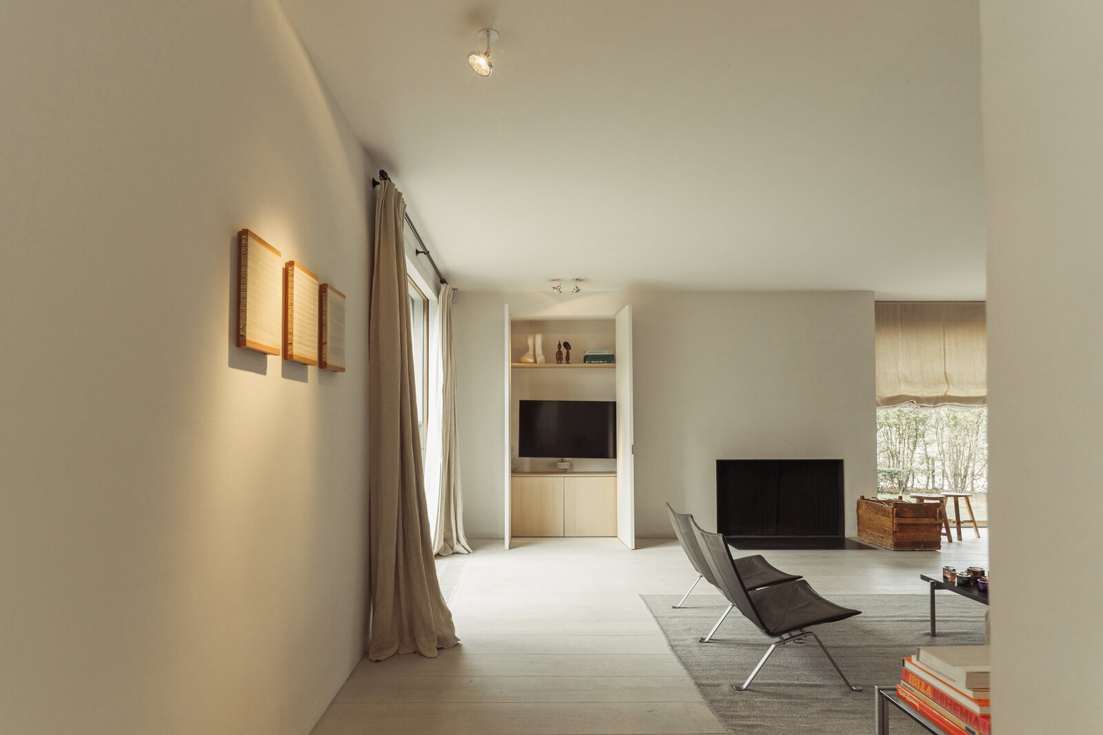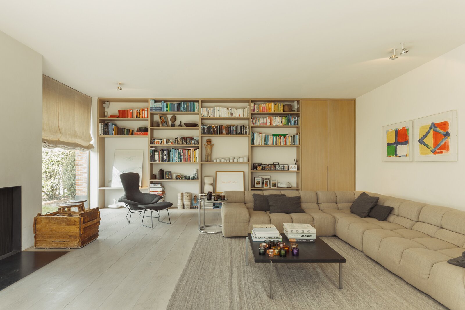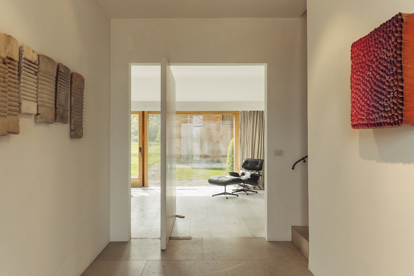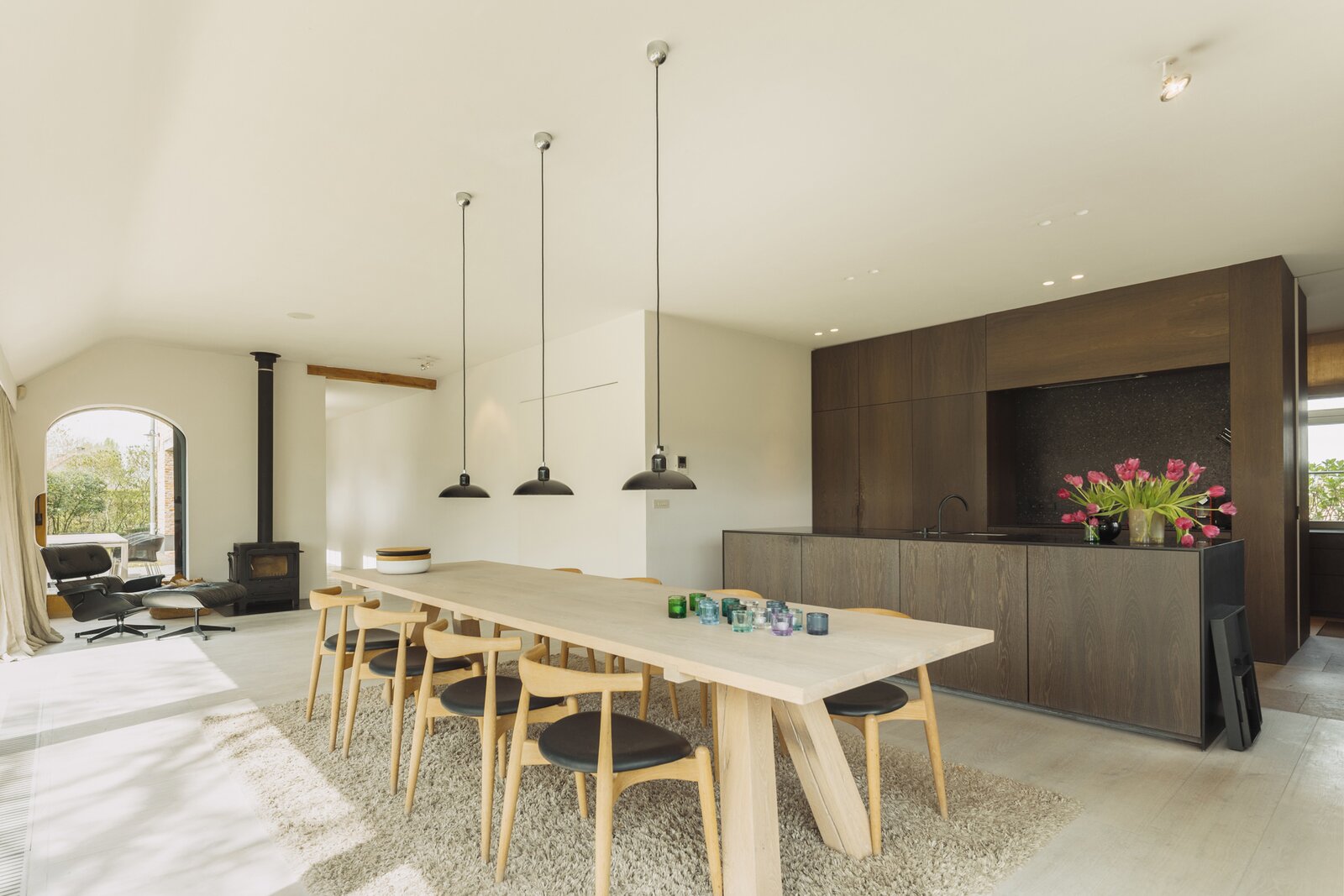 Hall spacieux avec, à gauche, une arrière-cuisine pratique, de nombreux rangements et une chambre froide. À droite : toilettes invités et vestiaire. Cave et garage intégré. Porte pivotante donnant sur des pièces à vivre lumineuses : cuisine ouverte équipée d'appareils Miele et pouvant accueillir une grande table à manger, coin salon convivial près du poêle. À côté, un salon élégant avec cheminée, bibliothèque et meuble TV. Parquet et vue imprenable sur les prairies. Une architecture intemporelle et des matériaux chaleureux créent une atmosphère sereine.