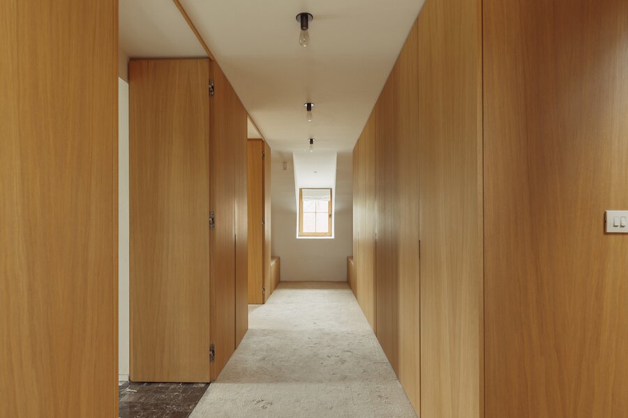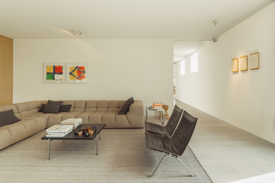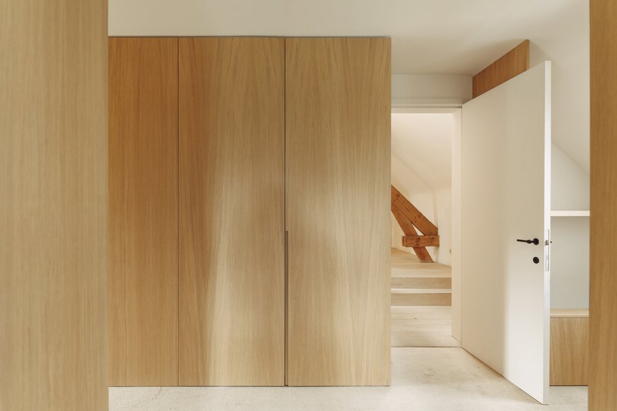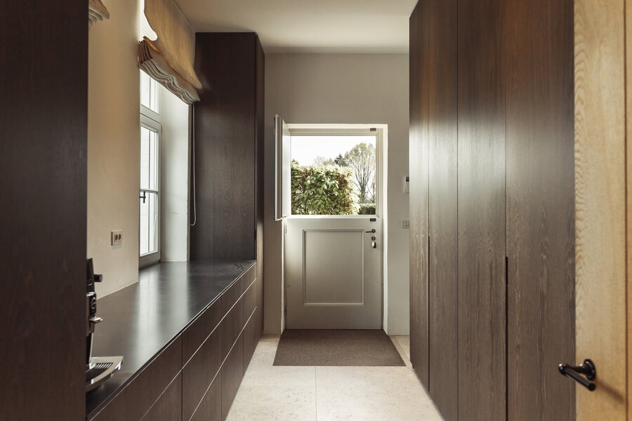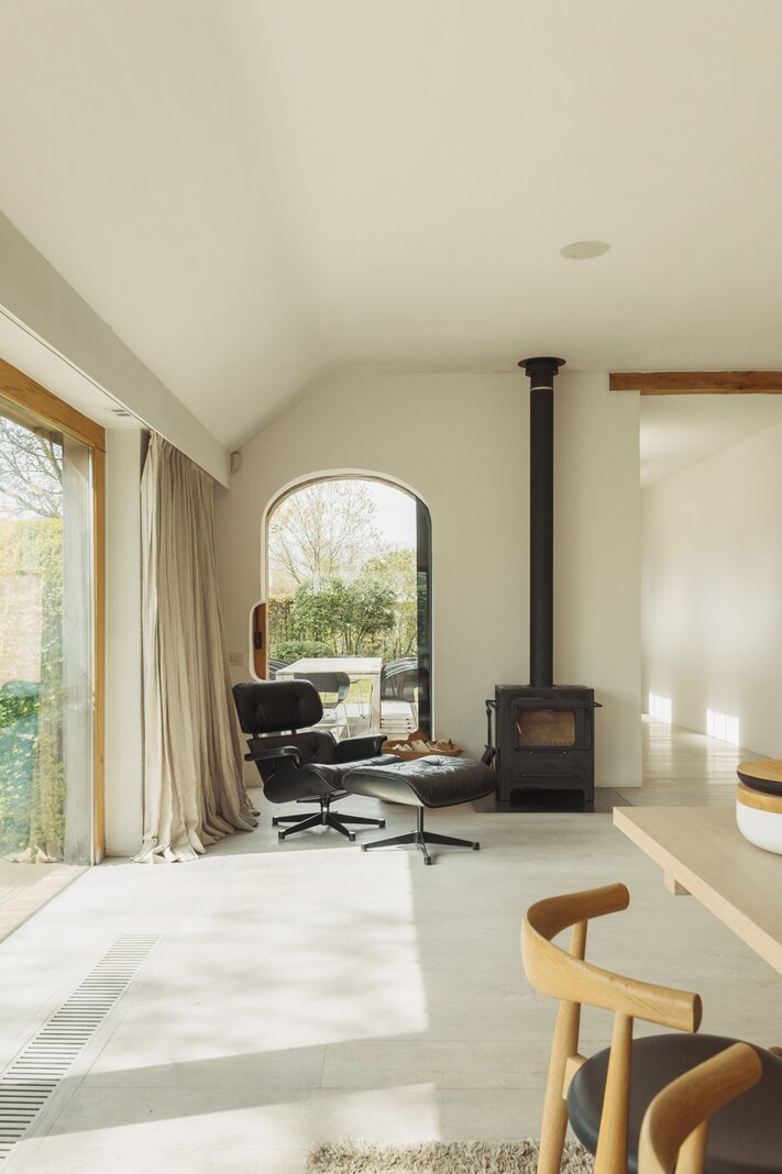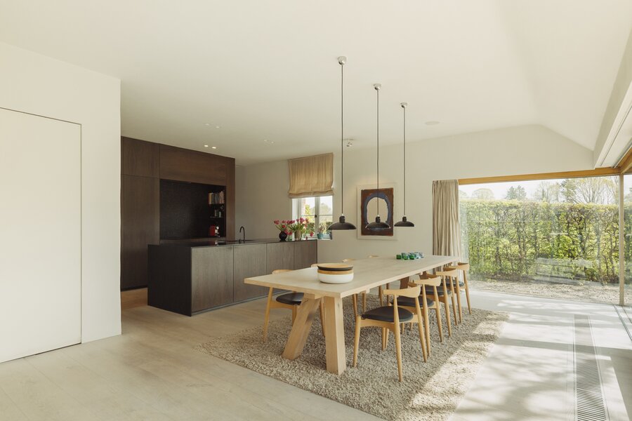 Hall spacieux avec, à gauche, une arrière-cuisine pratique, de nombreux rangements et une chambre froide. À droite : toilettes invités et vestiaire. Cave et garage intégré. Porte pivotante donnant sur des pièces à vivre lumineuses : cuisine ouverte équipée d'appareils Miele et pouvant accueillir une grande table à manger, coin salon convivial près du poêle. À côté, un salon élégant avec cheminée, bibliothèque et meuble TV. Parquet et vue imprenable sur les prairies. Une architecture intemporelle et des matériaux chaleureux créent une atmosphère sereine.