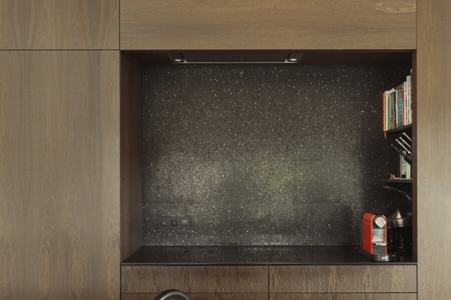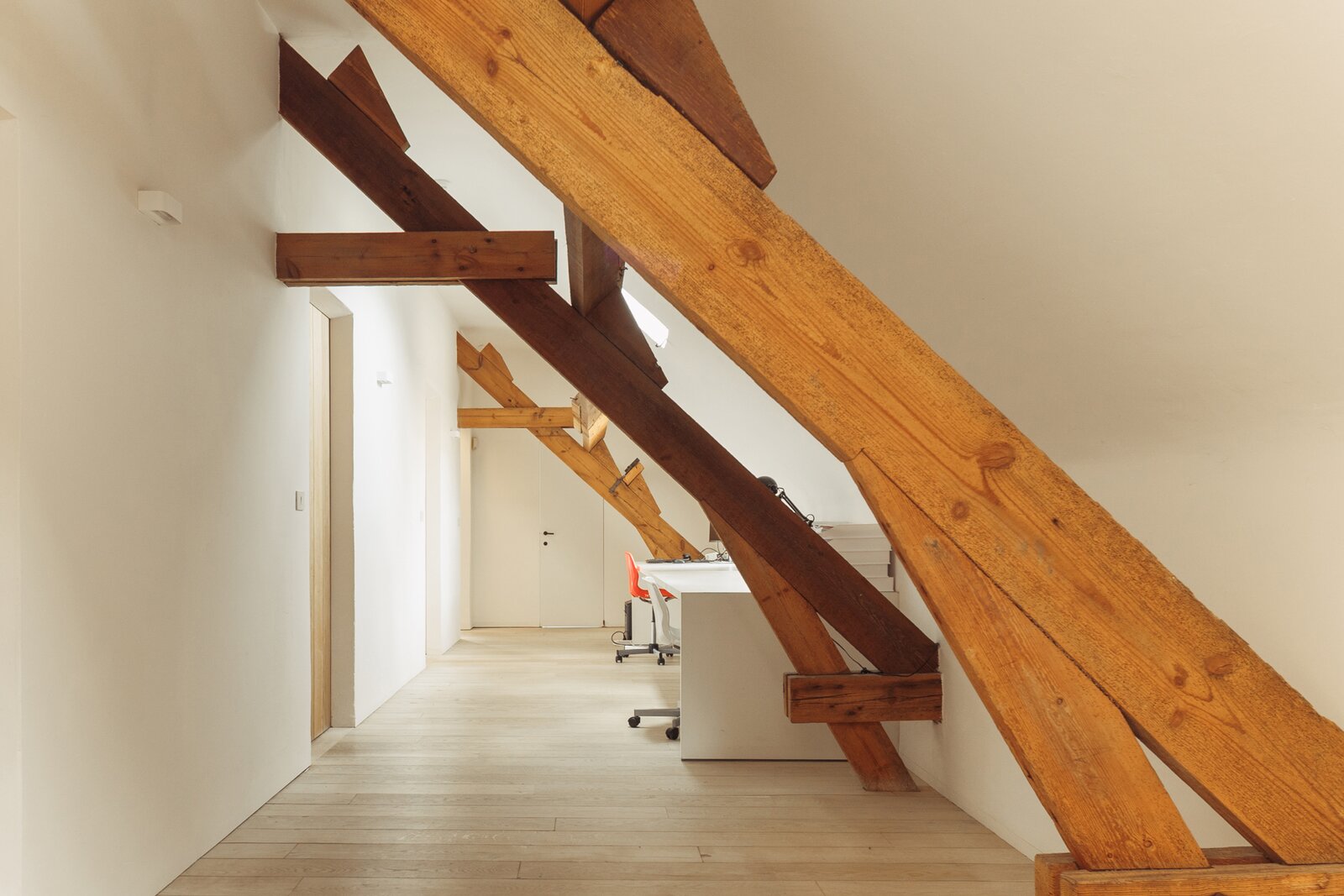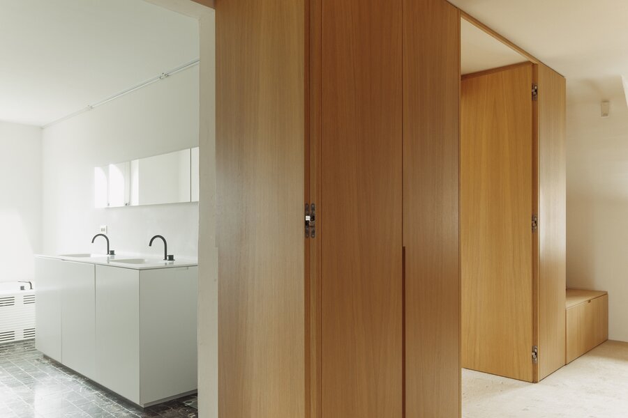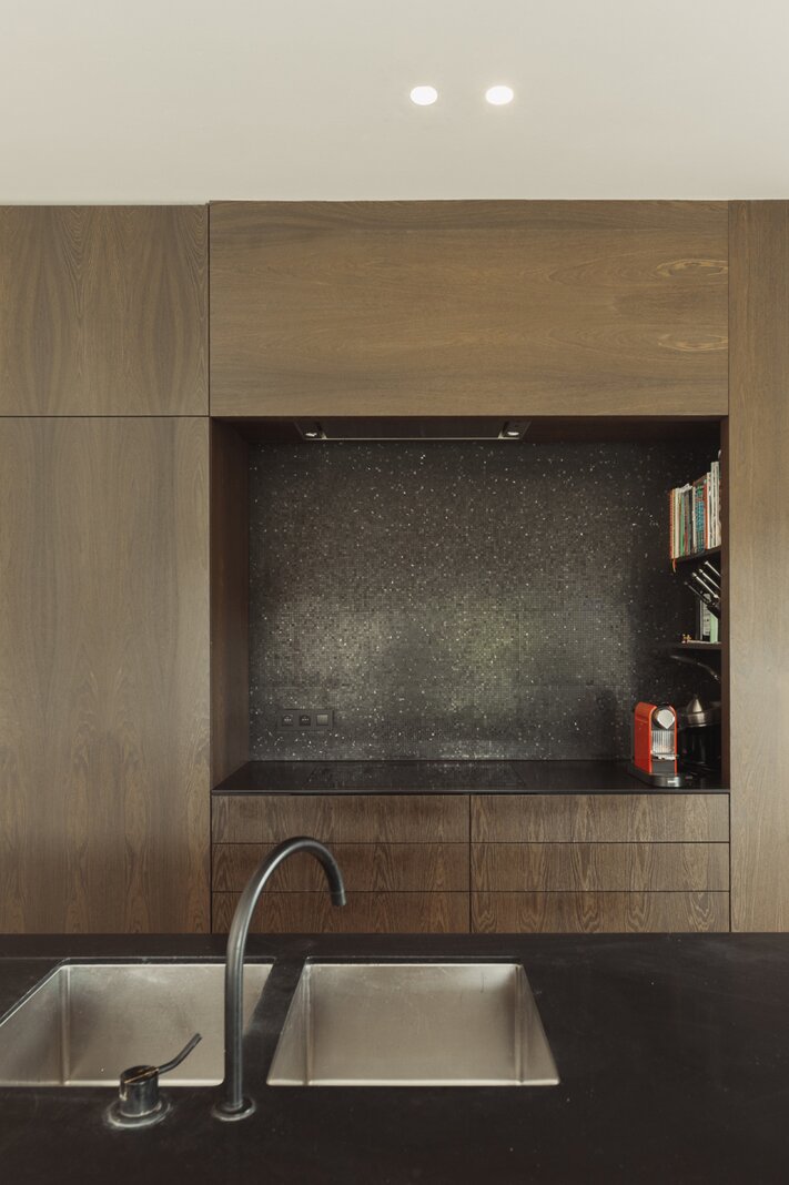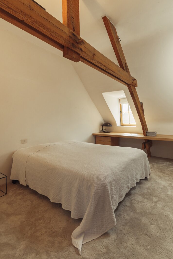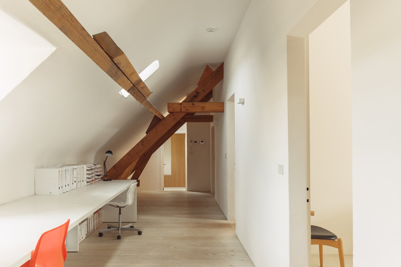 Hall spacieux avec, à gauche, une arrière-cuisine pratique, de nombreux rangements et une chambre froide. À droite : toilettes invités et vestiaire. Cave et garage intégré. Porte pivotante donnant sur des pièces à vivre lumineuses : cuisine ouverte équipée d'appareils Miele et pouvant accueillir une grande table à manger, coin salon convivial près du poêle. À côté, un salon élégant avec cheminée, bibliothèque et meuble TV. Parquet et vue imprenable sur les prairies. Une architecture intemporelle et des matériaux chaleureux créent une atmosphère sereine.