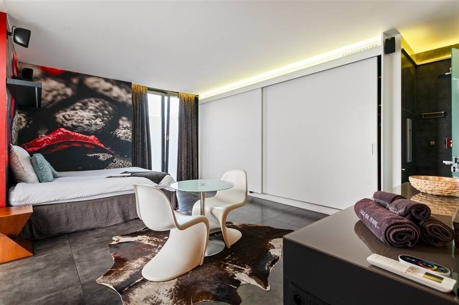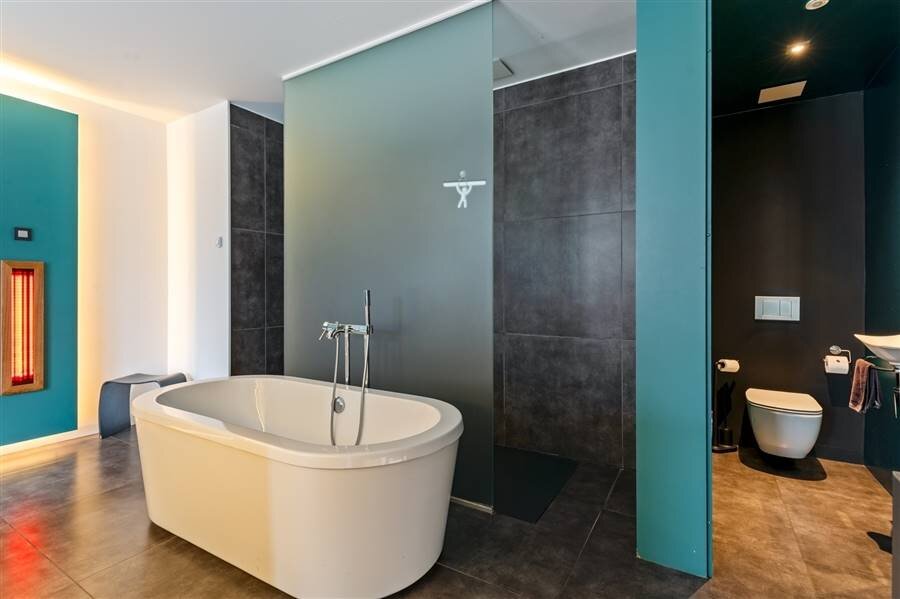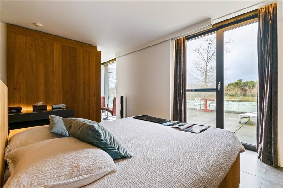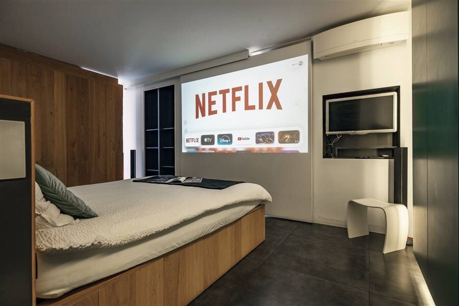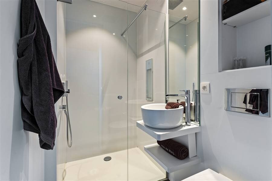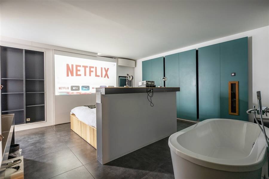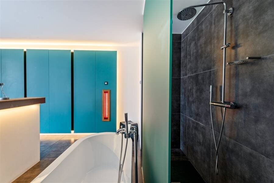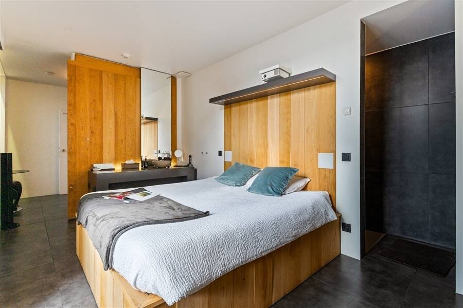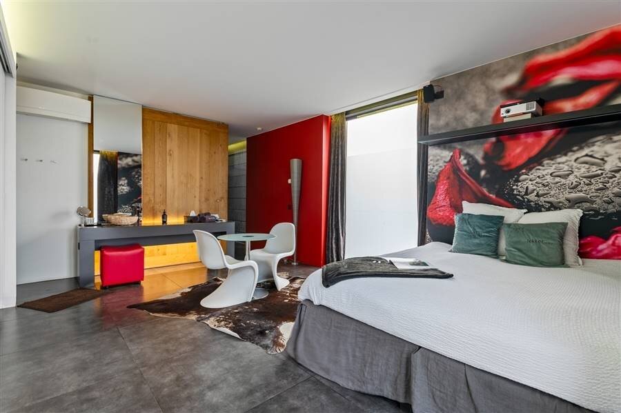 Le loft comprend quatre chambres de taille normale, une au rez-de-chaussée et trois à l'étage. La chambre arrière bénéficie d'une terrasse spacieuse donnant sur l'eau. La chambre avant gauche dispose également d'une grande terrasse privée. Chaque chambre est conçue comme une suite privée exclusive avec un lit lounge design pour deux personnes, un cinéma privé en qualité cinéma depuis le lit, des ambiances de couleurs réglables, un élément infrarouge, un système de musique intégré, une douche à effet de pluie et un lavabo. Le chauffage/refroidissement au plafond et au sol et la climatisation assurent un confort optimal tout au long de l'année.