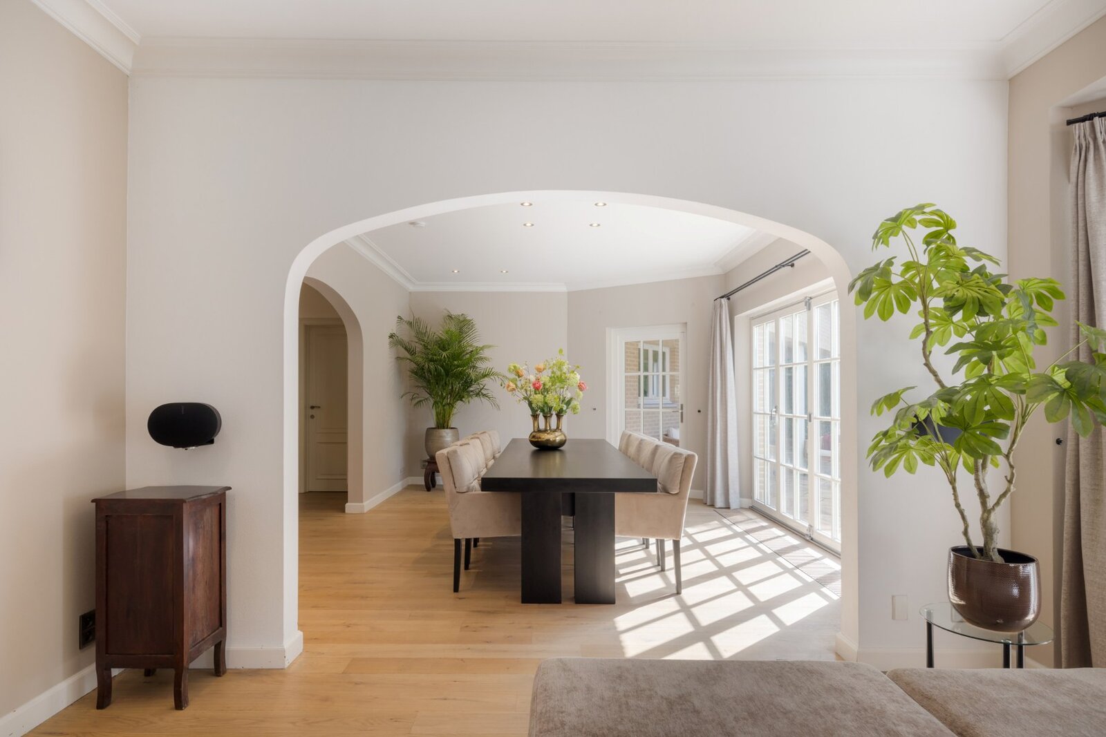 Bij binnenkomst betreedt u de villa in een statige lichtrijke inkomhal met toegang naar het leefgedeelte, het slaapgedeelte en de uitgeruste wellness. De sfeervolle woonkamer is voorzien van een mooie parketvloer, gashaard, ingebouwde meubelen en wordt o.a. dankzij de prachtige erker verwend met veel lichtinval en een uniek zicht naar de tuin. De luxueuze open keuken met bijkeuken is uitgerust met Miele- en Smeg-apparatuur, zoals een 6 pits gasfornuis, en stoomoven. Het biedt een optimaal kookgemak voor de culinaire liefhebber.