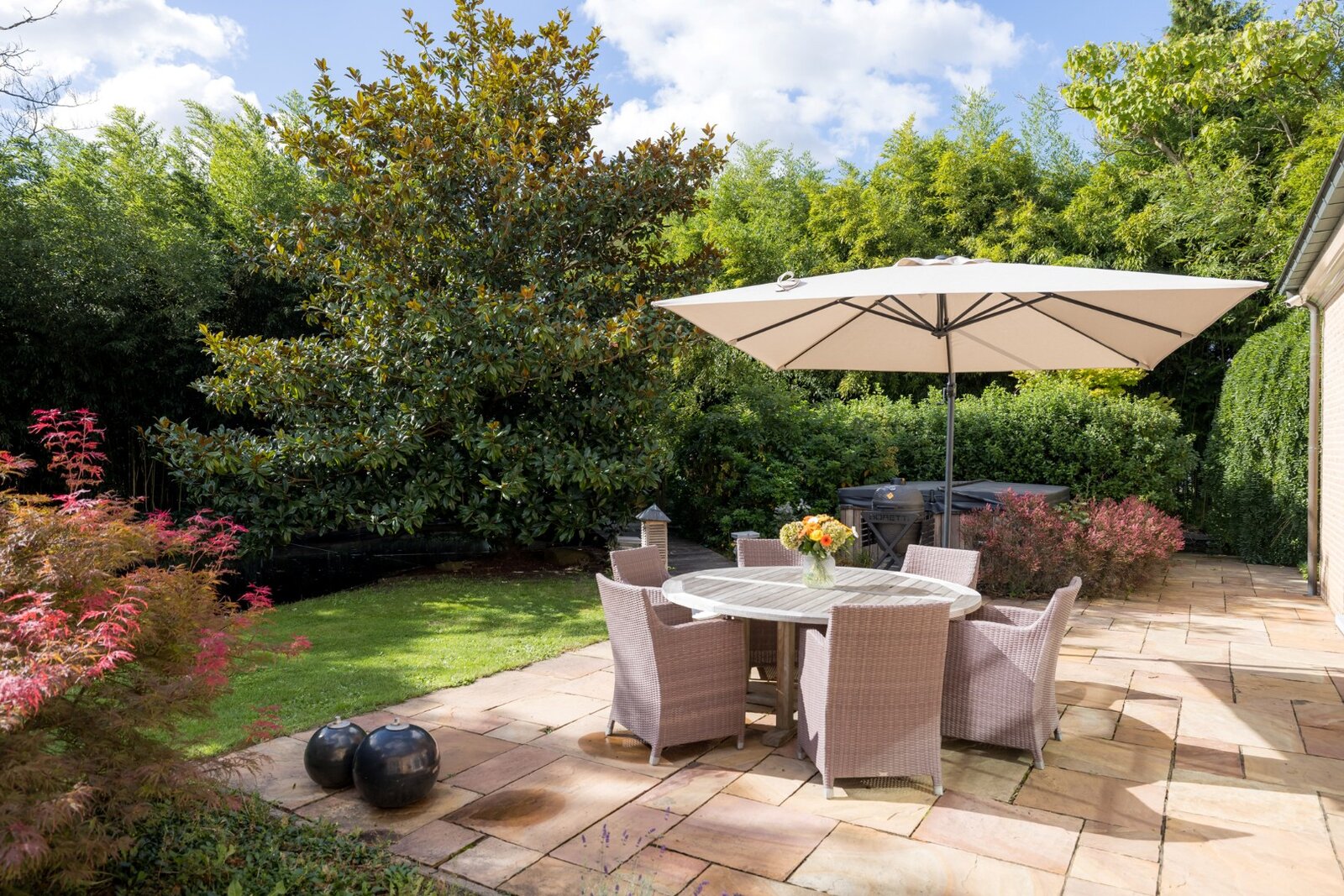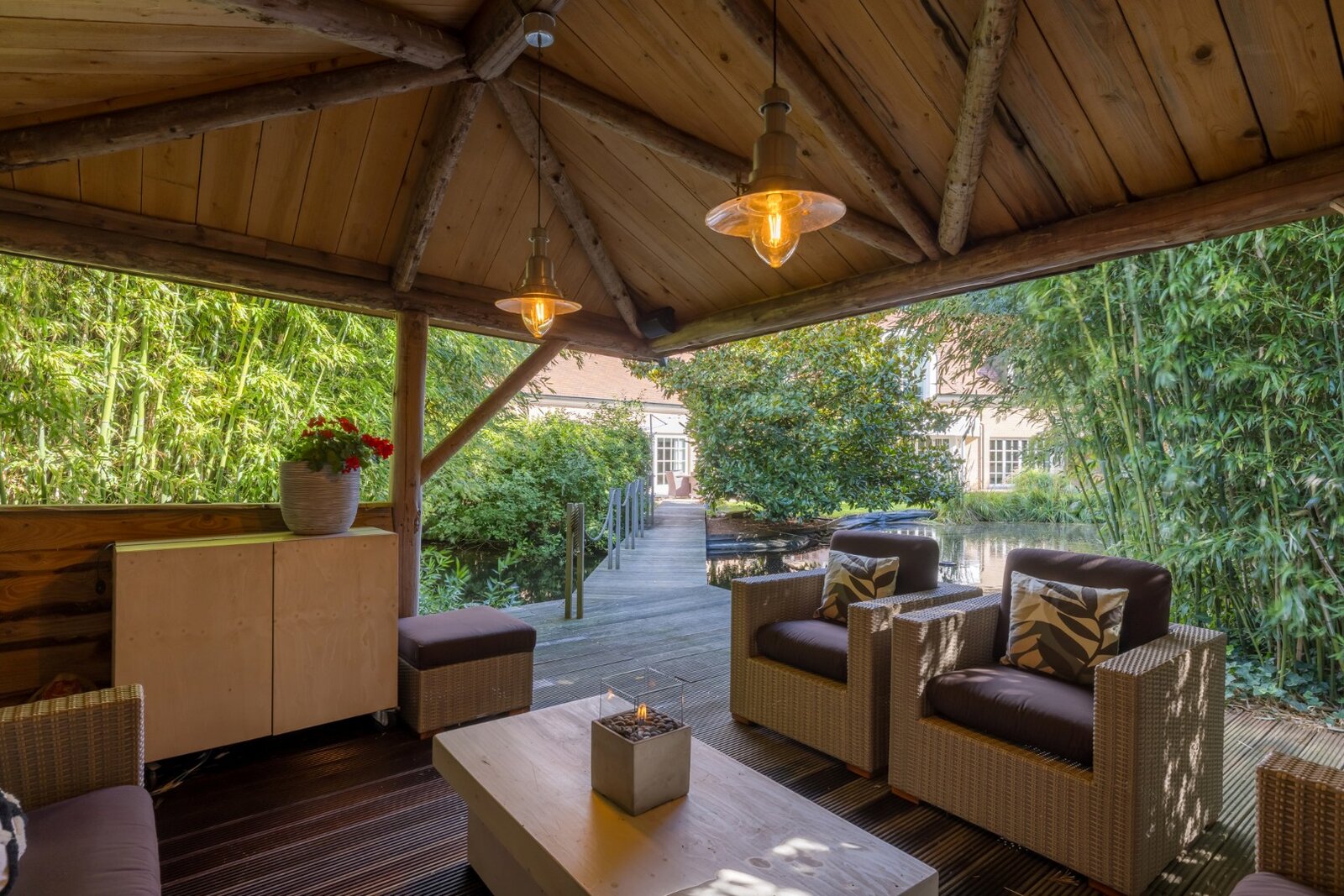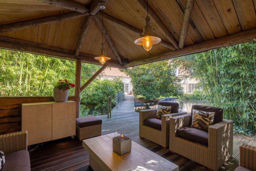 Het hele jaar door geniet u hier van groen, rust en comfort. Zelfs in de wintermaanden zorgt de aanwezige bamboe voor een groenzicht en geniet u comfortabel van een verwarmd terras met zicht op de vijver. Het perceel is zo ontworpen zodat er naast luxe en comfort ook ruimte is voor spelende kinderen en huisdieren.