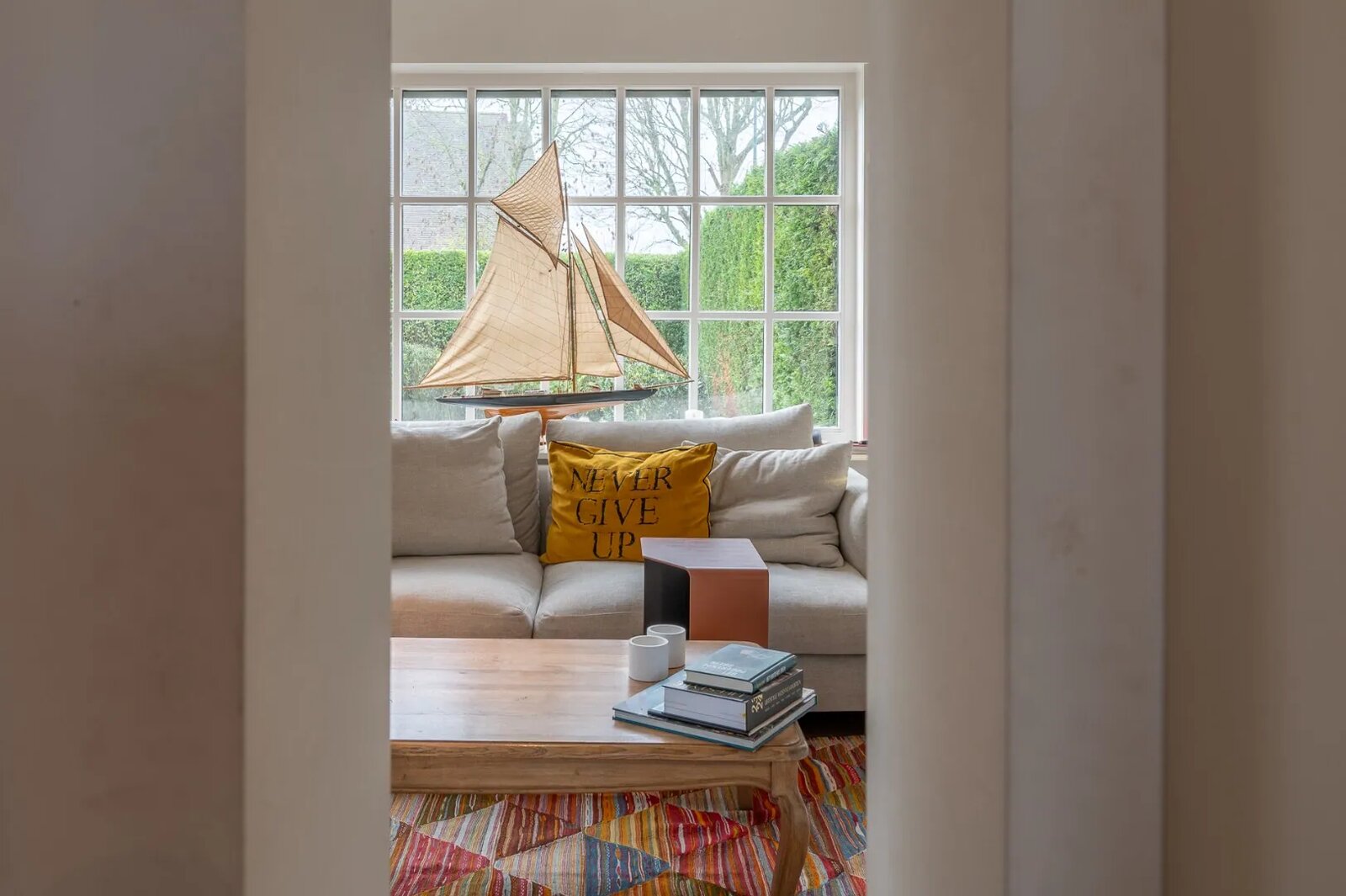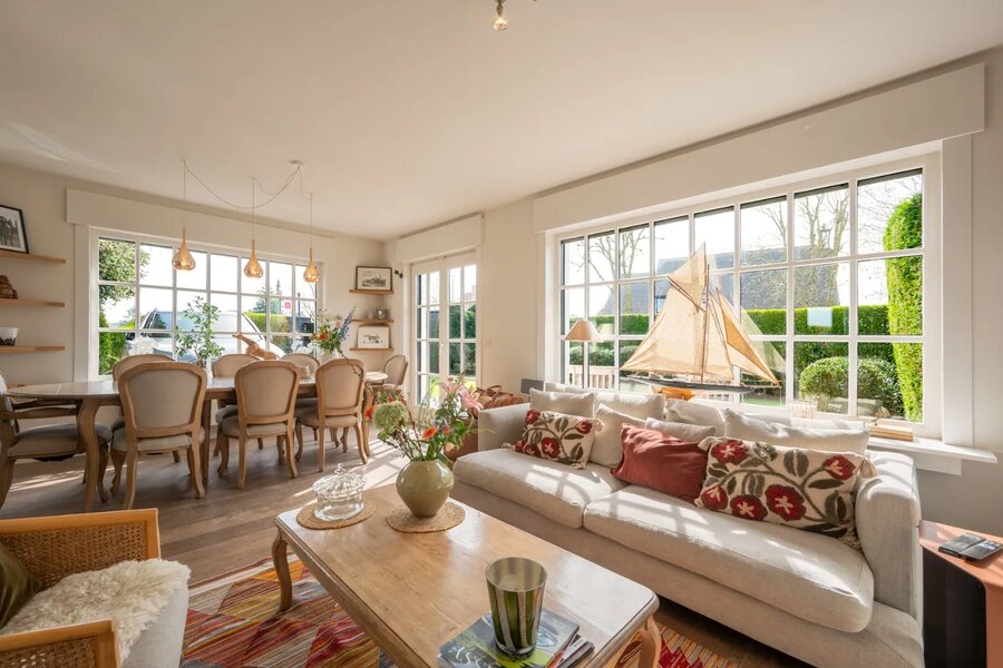 Espace de vie ensoleillé avec cheminée, cuisine équipée donnant sur le 2e jardin avec piscine et sauna.