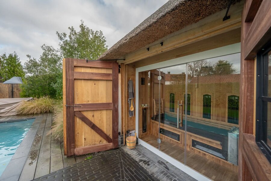 Hall d'entrée avec vestiaire et toilettes d'invités, espace de vie lumineux et super confortable avec cheminée, salle à manger donnant sur le jardin à l'avant, cuisine semi-ouverte donnant sur la terrasse avec piscine à l'arrière, sauna/cabine infrarouge avec vue sur la piscine, douche extérieure avec eau chaude et une 2e terrasse ensoleillée avec pratique espace de rangement extérieur.